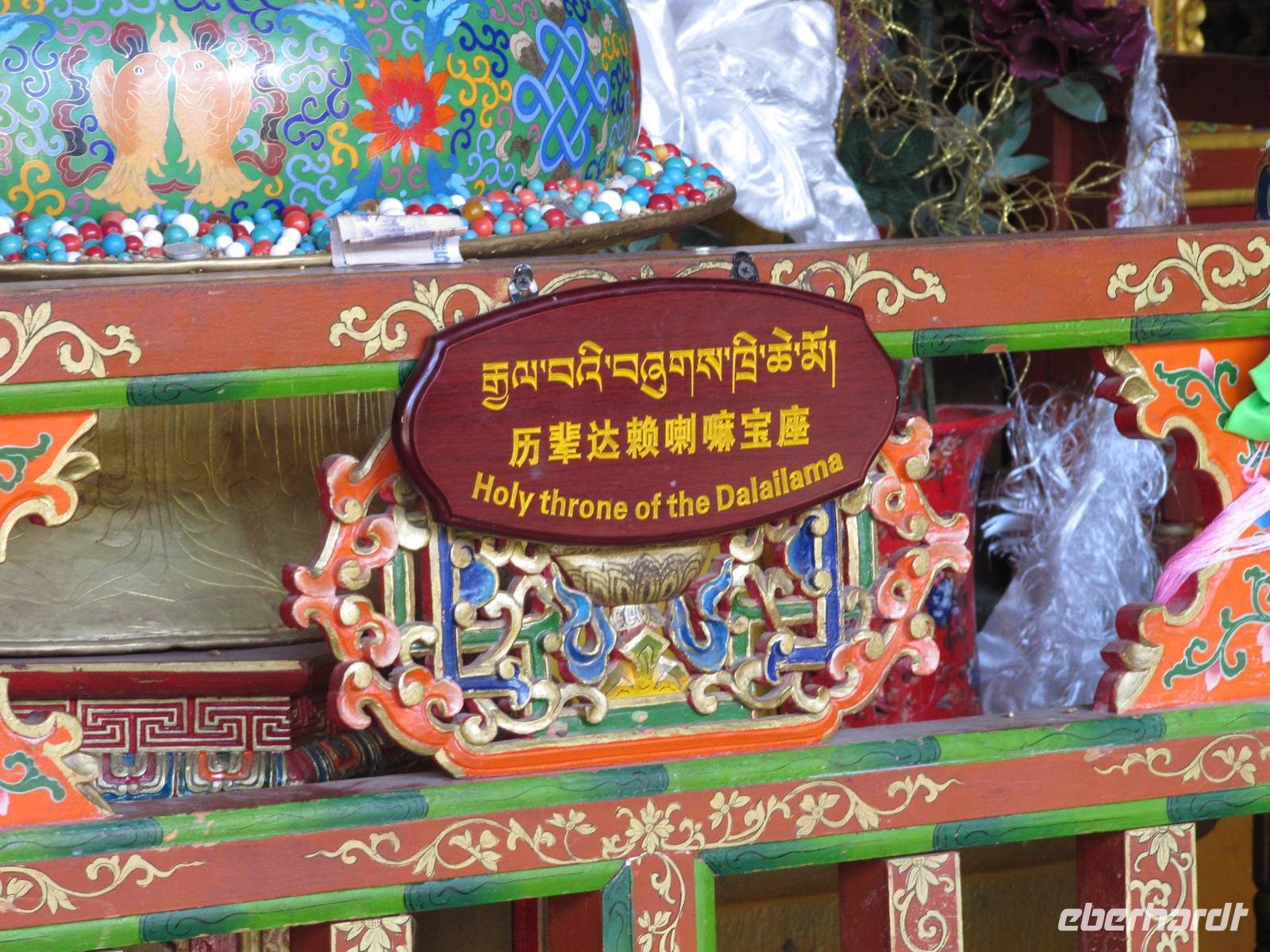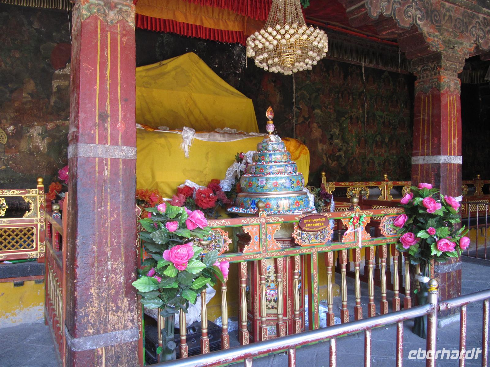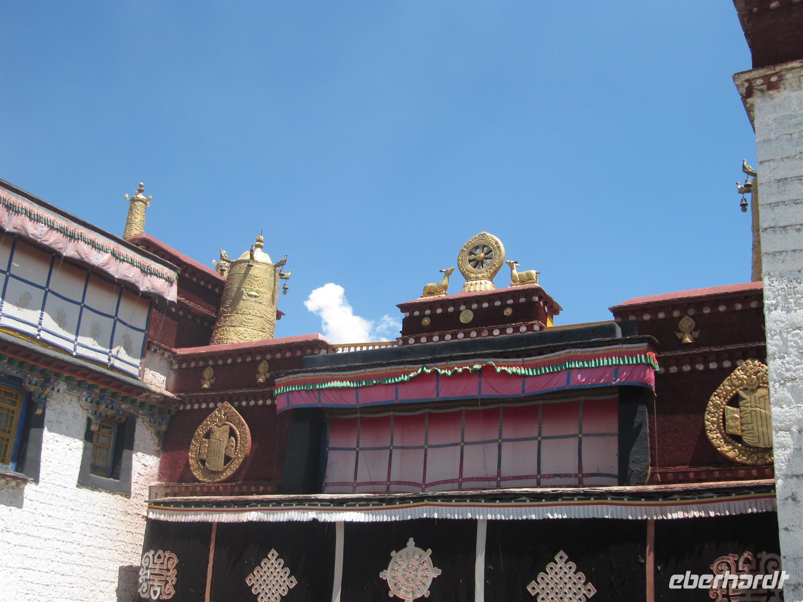 Die meisten Wände und Decken des Palastes sind mit feinen Malereien verziert - insgesamt über 2.500 Quadratmeter. Besonders prachtvoll sind die Grabstätten der Dalai Lama. Allein für das Grab des fünften Dalai Lama, der den Palast bauen ließ, wurden auf einer Höhe von 20 Metern über drei Stockwerke etwa 3.700 Kilogramm Gold verarbeitet. Überhaupt wurde beim Bau des Potala-Palastes nicht gespart. Selbst die Dachziegel sind aus vergoldeter Bronze. So erfahren wir allerlei Wissenswertes über das damalige Leben des Dalai Lama und wieder kommt doch ein wenig Wehmut auf, wenn man daran denkt, dass dieser nicht bei seinen Verehren sein kann, sondern in Indien weilt. Hier merkt man auch, dass sich die Reiseleiter mit Äußerungen zu diesem Fall sehr zurück halten. Die Angst ist deutlich zu spüren. Auf einige Fragen werden wir so leider keine Antworten bekommen.