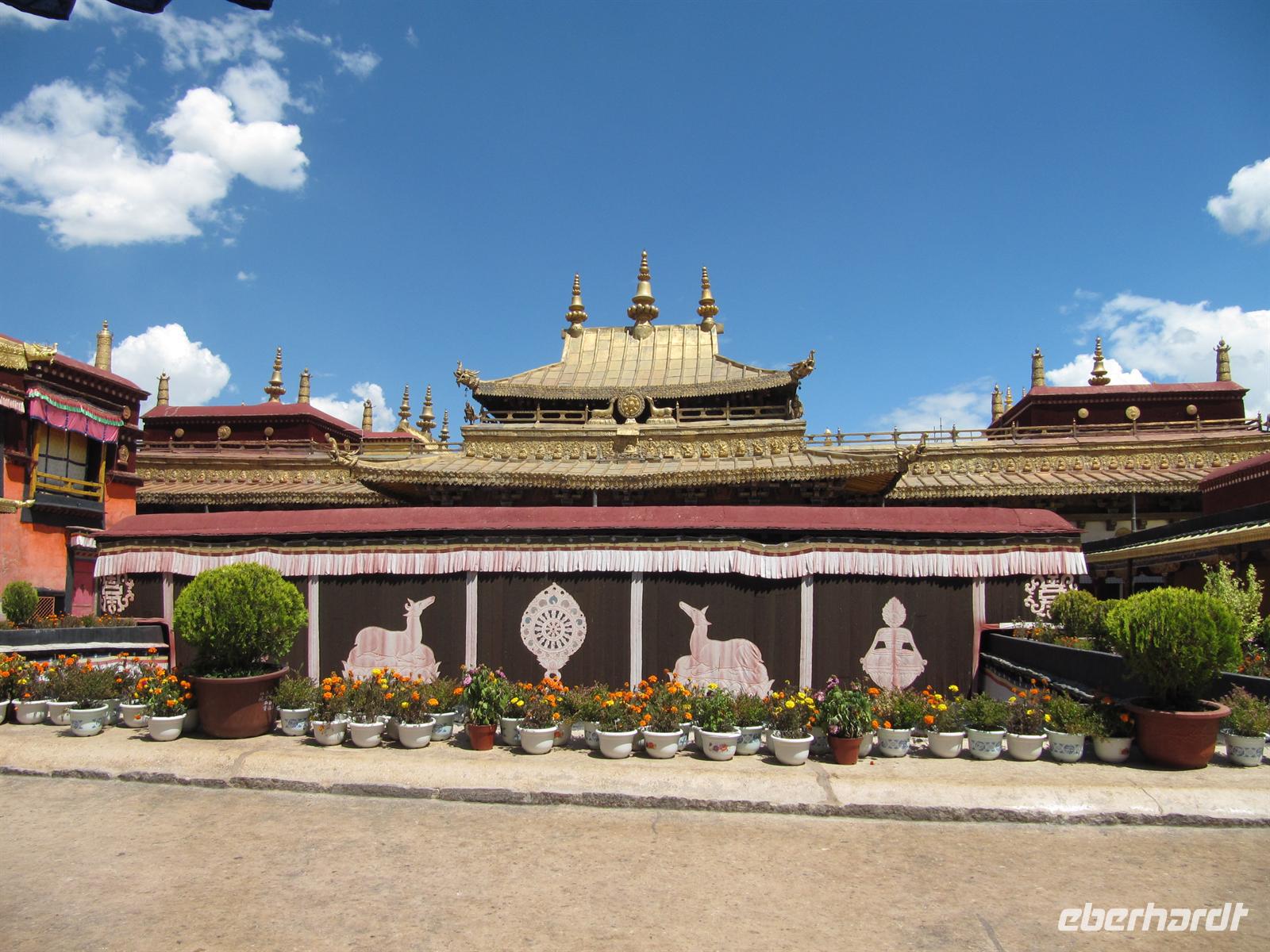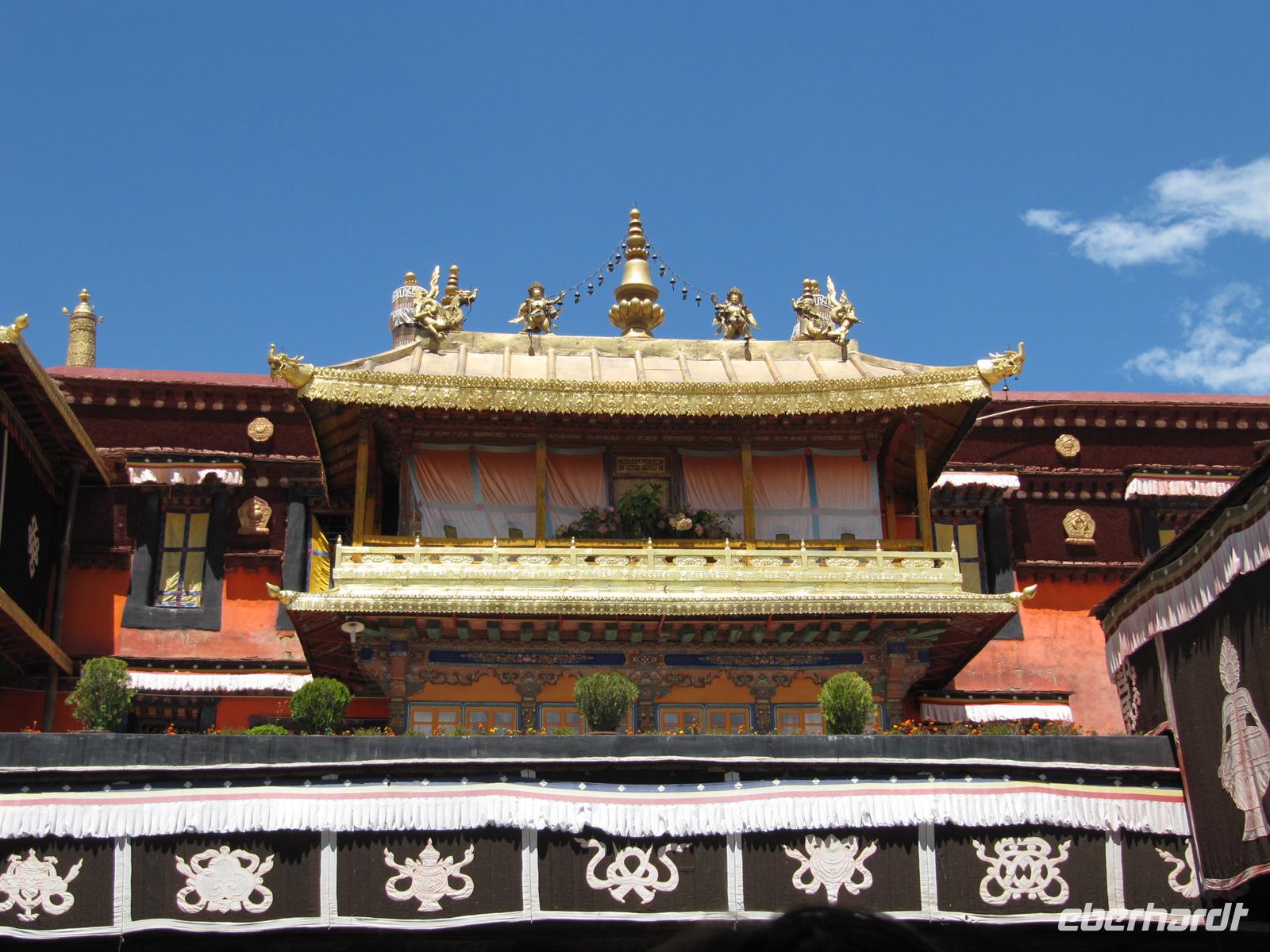 Der Jokhang oder “Haus des Herrn” ist der heiligste Platz in Tibet und die ultimative Pilgerstätte für tibetische Buddhisten. Der König Songtsen Gampo baute hier im siebten Jahrhundert den ersten Tempel. Der Jokhang beherbergt den Jowo Buddha, eine buddhistische Skulptur die ein Teil der Mitgift der chinesischen Prinzessin Wen Cheng bei ihrer Ankunft in Tibet war. Es heisst, dass die Prinzessin die Statue nach dem Tod ihres Gemahles, des Königs Songtsen Gampo, im Tempel versteckte. Dass diese alte buddhistische Skulptur wie durch ein Wunder überlebte, macht sie heute zu einer der meistgeehrten Abbildungen Tibets.