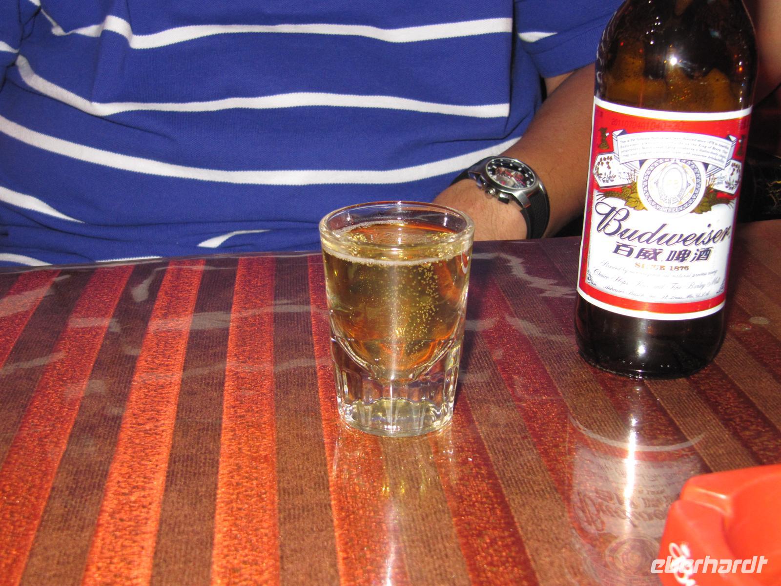 Einige von uns wagen sich an diesem Abend noch in eine tibetische Bar. Auch dieses Ereignis zählt zweifeslohne zu einem der lustigsten dieser Reise. Wer hätte gedacht, dass man in Lhasa Bier aus kleinen Schnapsgläsern trinkt? Hier bestellt man sich auch nicht eine Flasche Bier sondern gleich mal 100 Dosen, die man dann aus diesen kleinen Gläsern trinkt. Gesungen wird zu Karaoke und Wein zu bekommen ist so gut wie unmöglich oder dieser kostest ein Vermögen. Ich erinnere auch gerne an die Aussage von Meng zu der Weinbox: "Was? Soviel könnt ihr aber nicht trinken!"