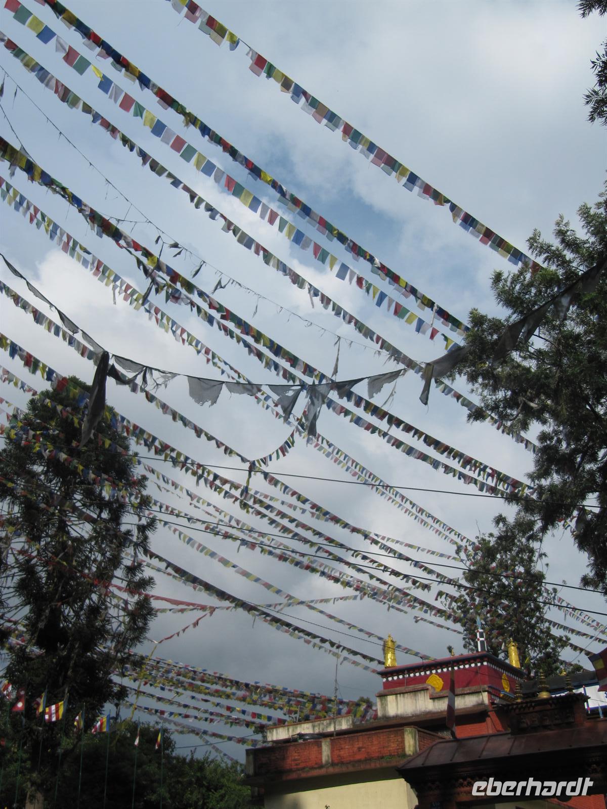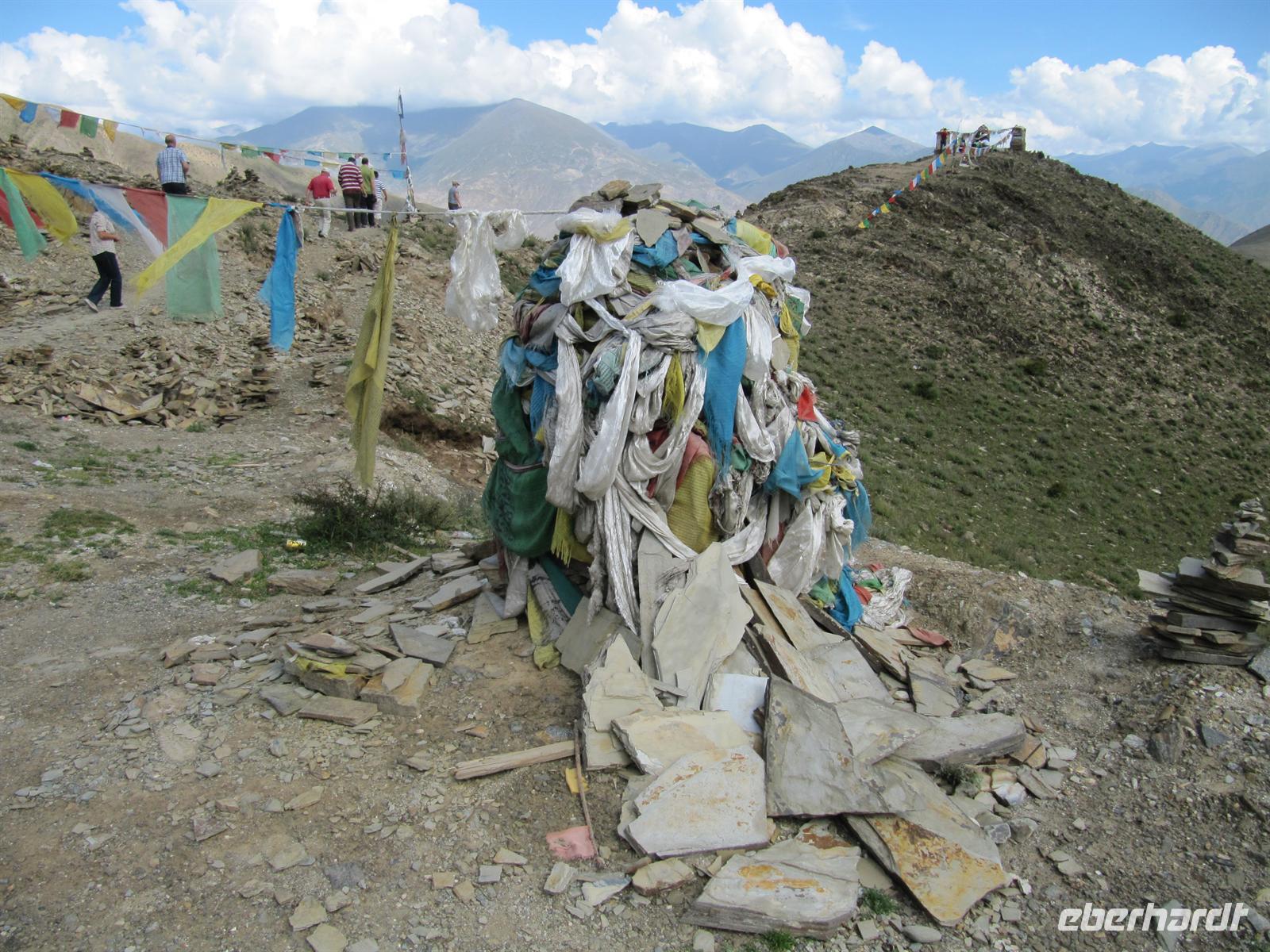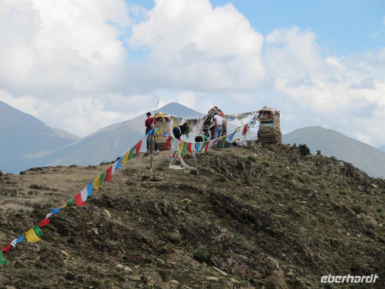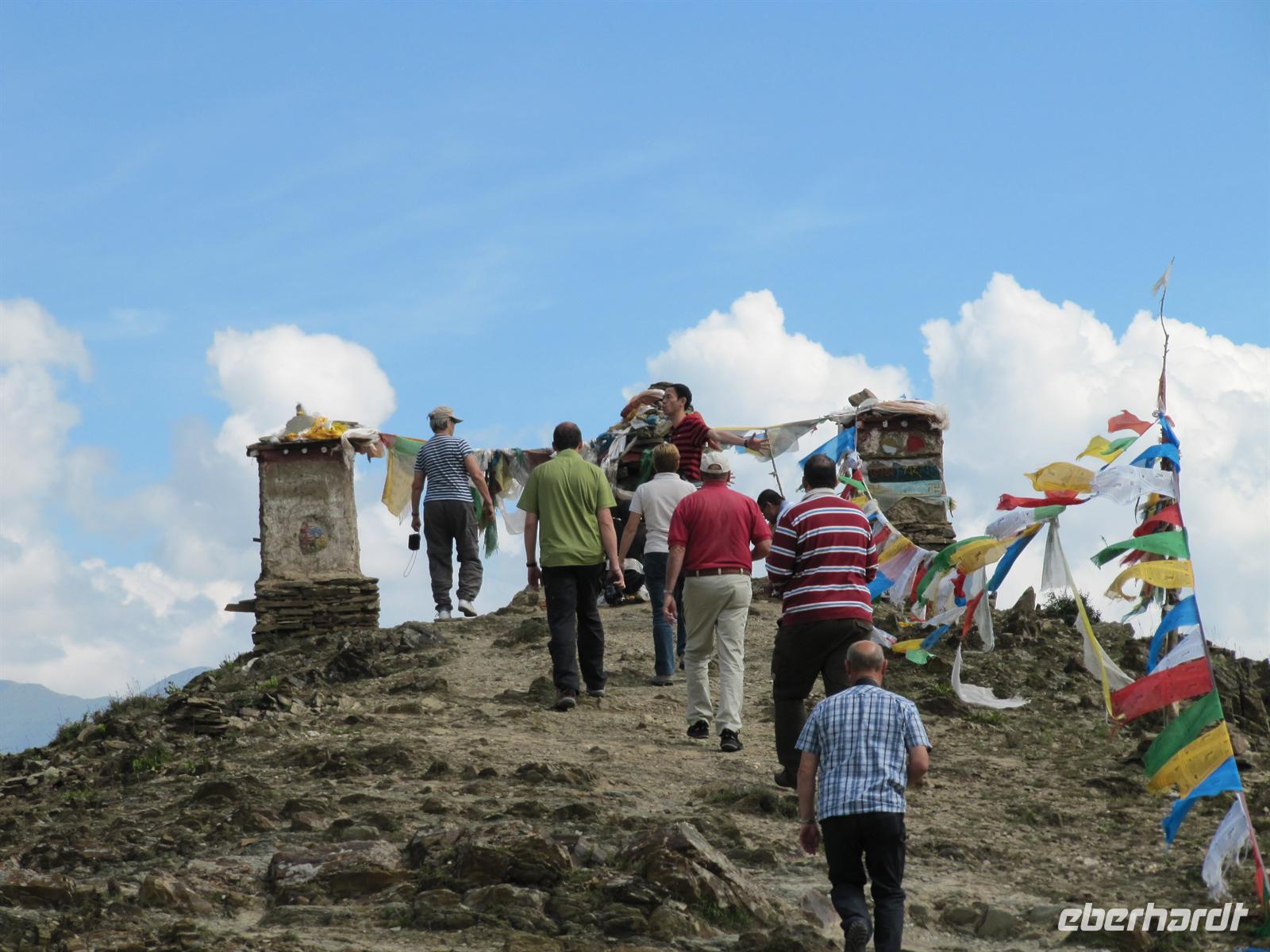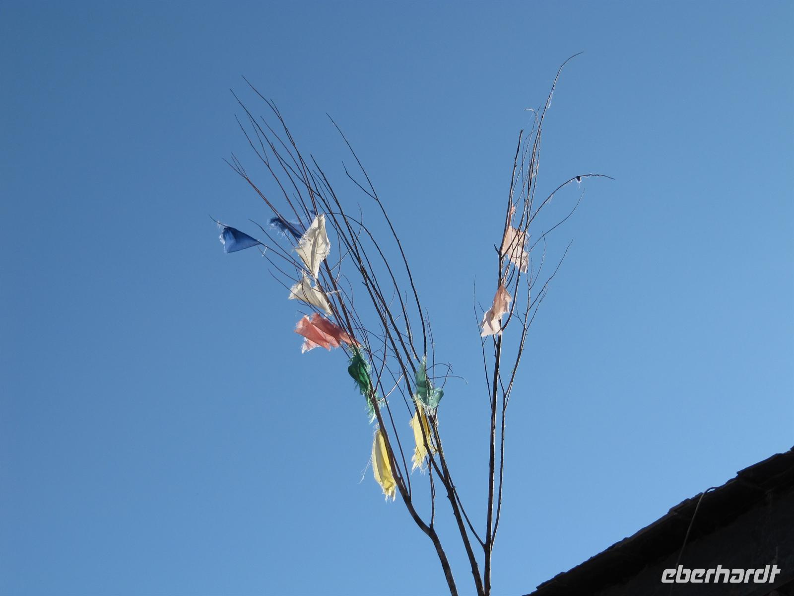 Auf unserer Reise haben wir von Leo bereits allerlei Wissenswertes über die buddhistischen Bestattungsformen gelernt. Vorherrschend sind dabei vor allem die Himmelsbestattung sowie die Wasserbestattung. Heute können wir das Gelernte anwenden und sehen zwei dieser Stätten. Für uns ist dies hochinteressant. Auf unserem Weg sehen wir überall die Gebetsfahnen im Wind flattern.