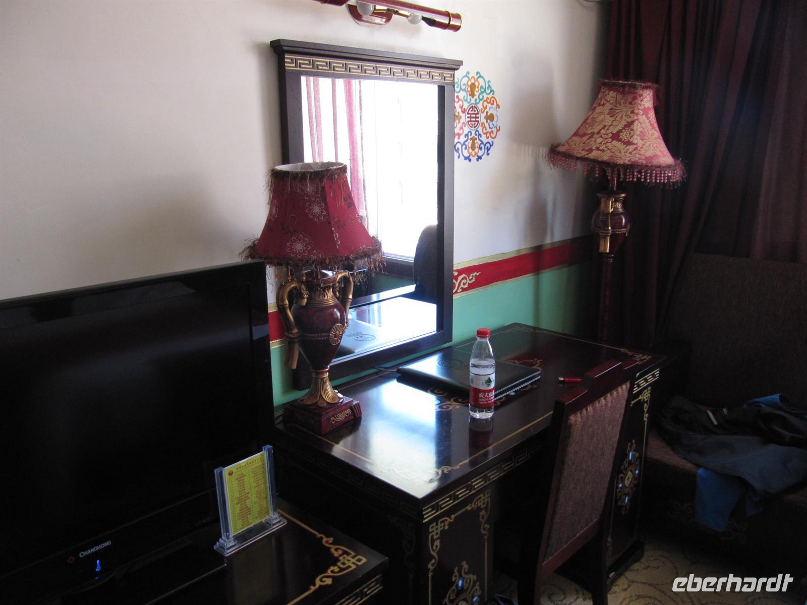 Wir fühlen uns schon etwas mau und müde auf den Beinen, als wir aus unserem Zug aussteigen. In Lhasa erwartet uns bereits unser örtlicher Bus und unser tibetischer Reiseleiter Leo, den wir wohl immer mit den Worten: "Hast du gesehen?" verbinden werden Vom Bahnhof aus fahren wir heute nur noch zu unserem 3-Sterne-Hotel Tianhai. Wir checken ein und treffen uns dann wieder zum Abendessen. Hier genießen wir im Hotel die tibetische Küche und fallen dann nur noch in unsere Betten. Wir ruhen uns aus und versuchen uns an die Höhe zu gewöhnen.