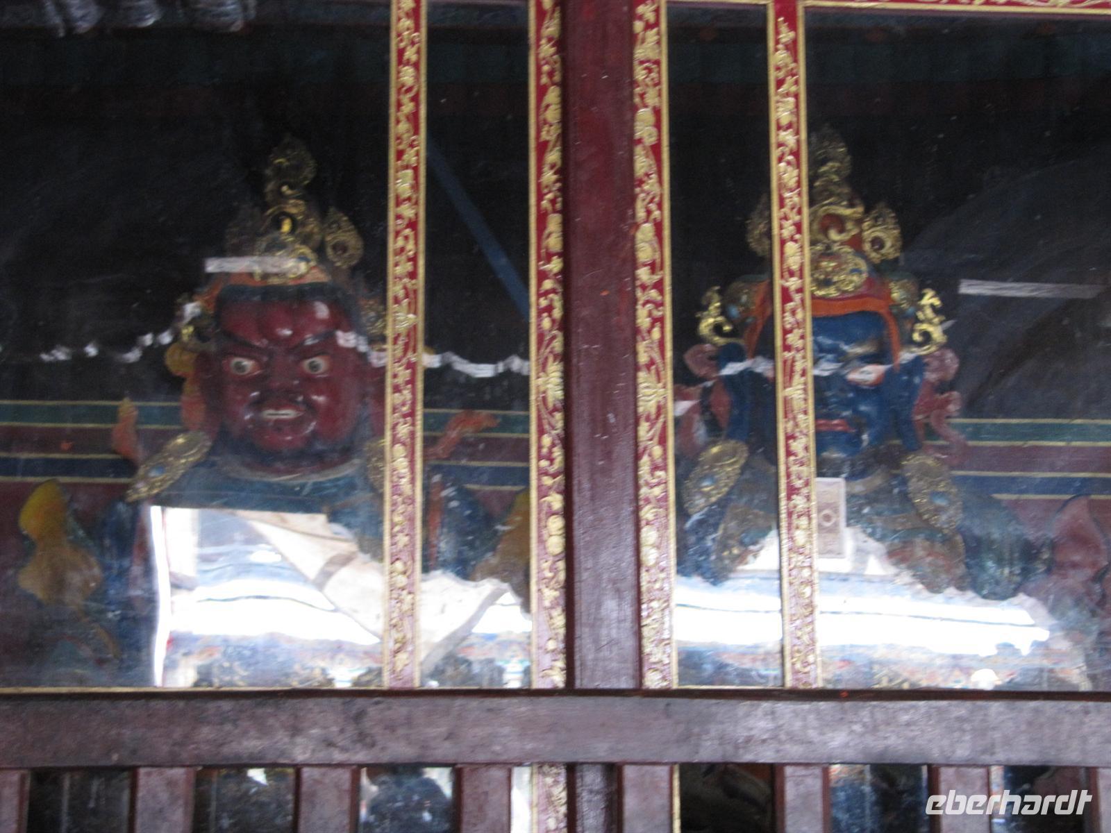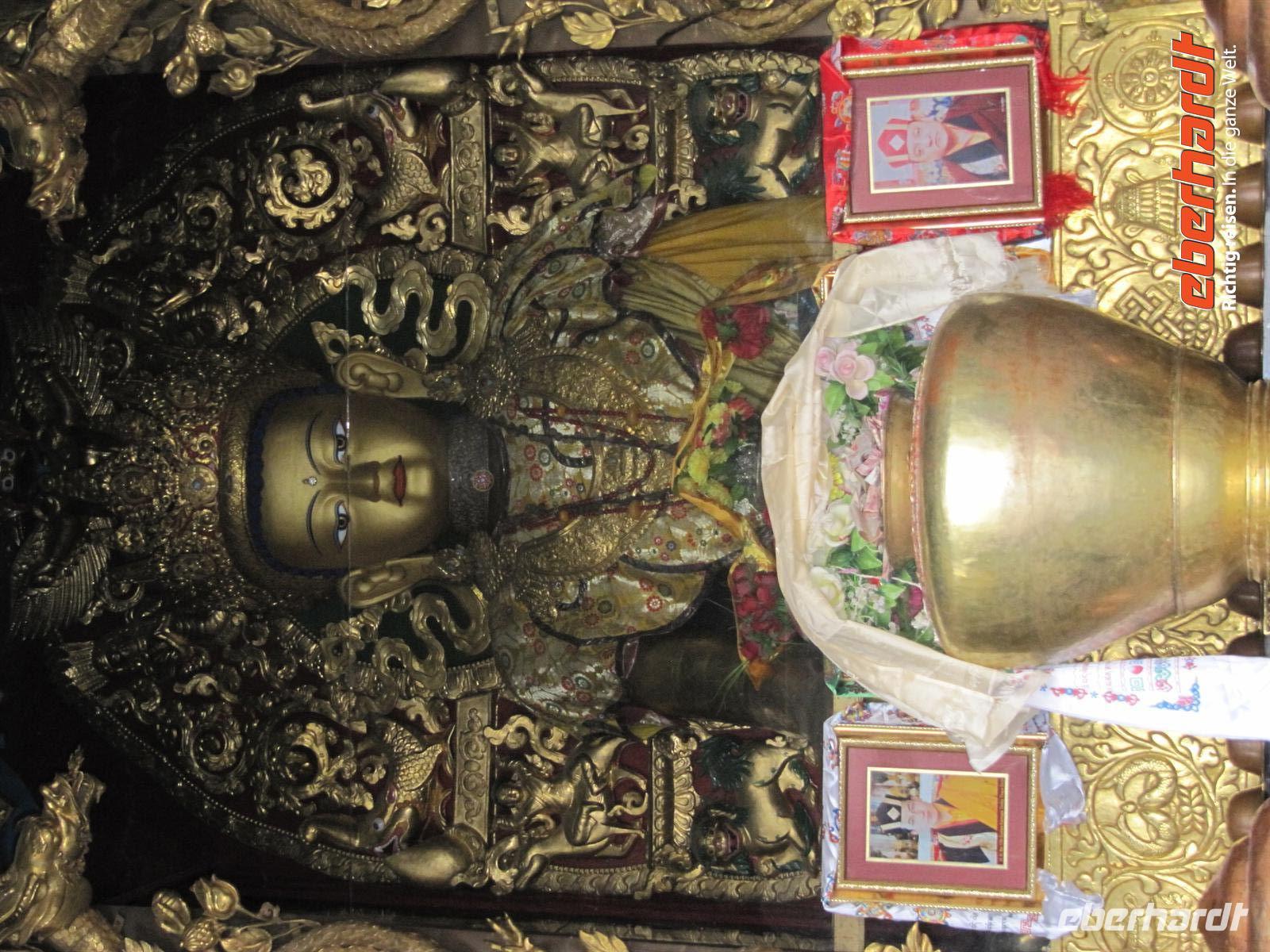 Die Atmosphäre findet Ihren Höhepunkt in der großen Versammlungshalle mit ihren 48 Säulen, die bis zu 2000 Mönchen Platz bietet. Hier sehen wir auch auch eine aus 11.000 Kilogramm Kupfer und 229 Kilogramm Gold gefertigte Buddhastatue. Es ist die größte Buddhastatue Tibets. Sie ist über 26 Meter hoch und wurde 1914 errichtet. Sie symbolisiert den Maitreya, den Buddha der Zukunft.
