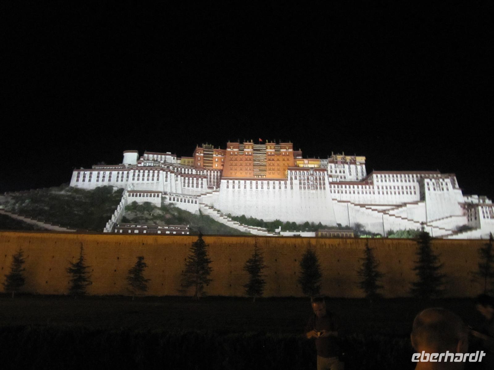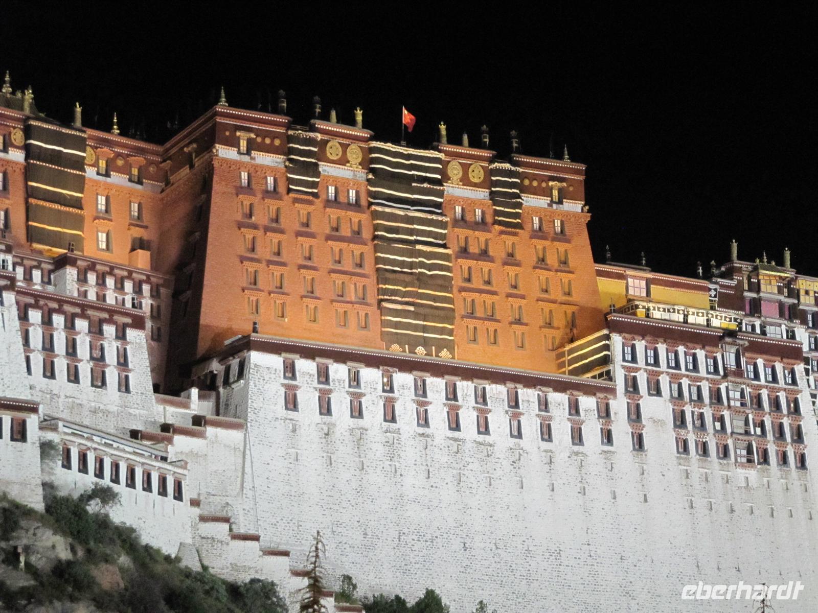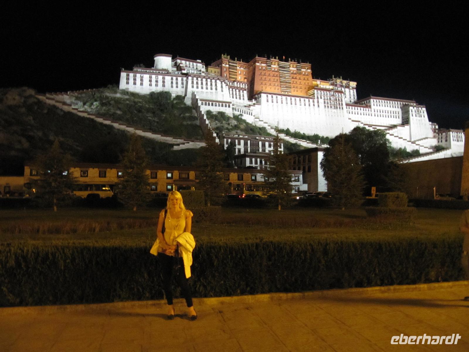 Mit vollem Magen fahren wir im Anschluß zurück zu unserem Hotel. Viele von uns beschließen, an unserem letzten Abend in Tibet, in jedem Fall noch einmal den Potala-Palast bei Nacht sehen zu wollen. So setzen wir uns in ein Taxi und fahren gemeinsam zum beleuchteten Palast. So sieht er fast noch viel schöner aus als am Tag. Wir schießen unsere letzten Fotos von Lhasa und lassen die Reise noch einmal Revue passieren. Es ist erstaunlich, was wir erlebt haben! Wir beobachten noch ein wenig das Treiben der Tibeter auf den Straßen und fahren nach einer etwas langen Wartezeit zurück zu unserem Hotel