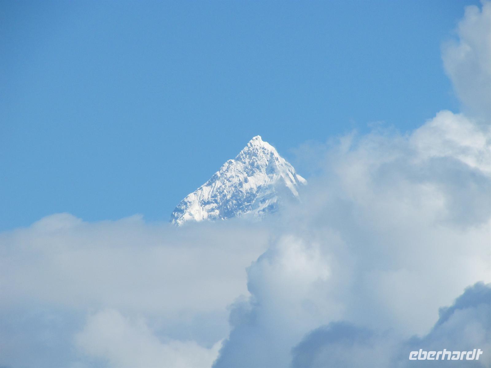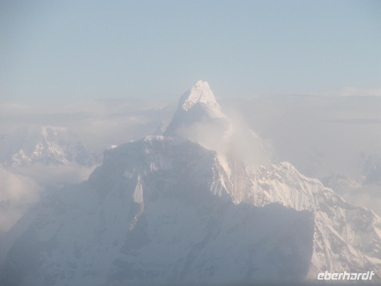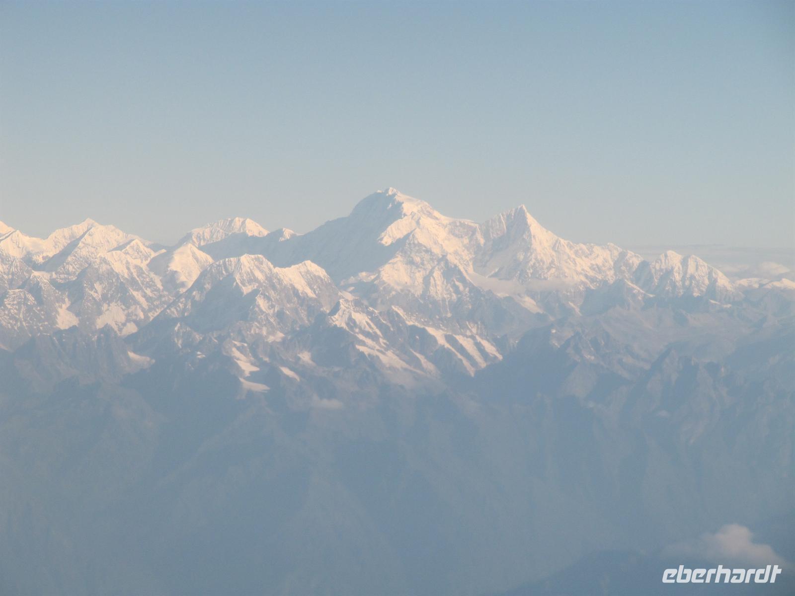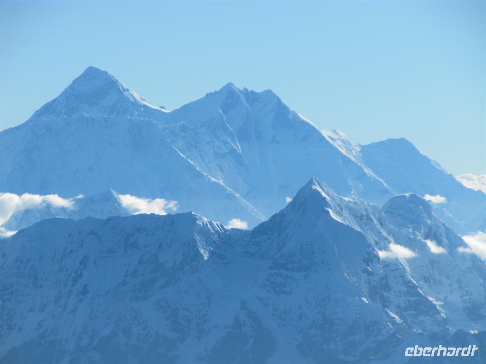 Unser Flug verläuft ruhig und bereits von Weitem haben wir ihn nun endlich langersehnt vor unserer Nase: den legendären, großartigen Mount Everest und die Gebirgskette des Himalaya. Es ist ein traumhaftes Wetter, so dass wir Ihn wunderbar sehen können. Unsere Augen können kaum von seiner Schönheit lassen. Aber uns erwartet ja noch ein Flug auf unserer Reise.