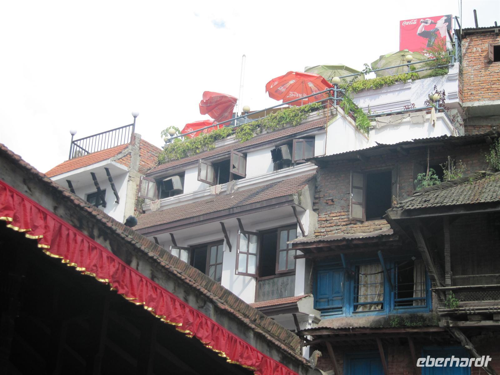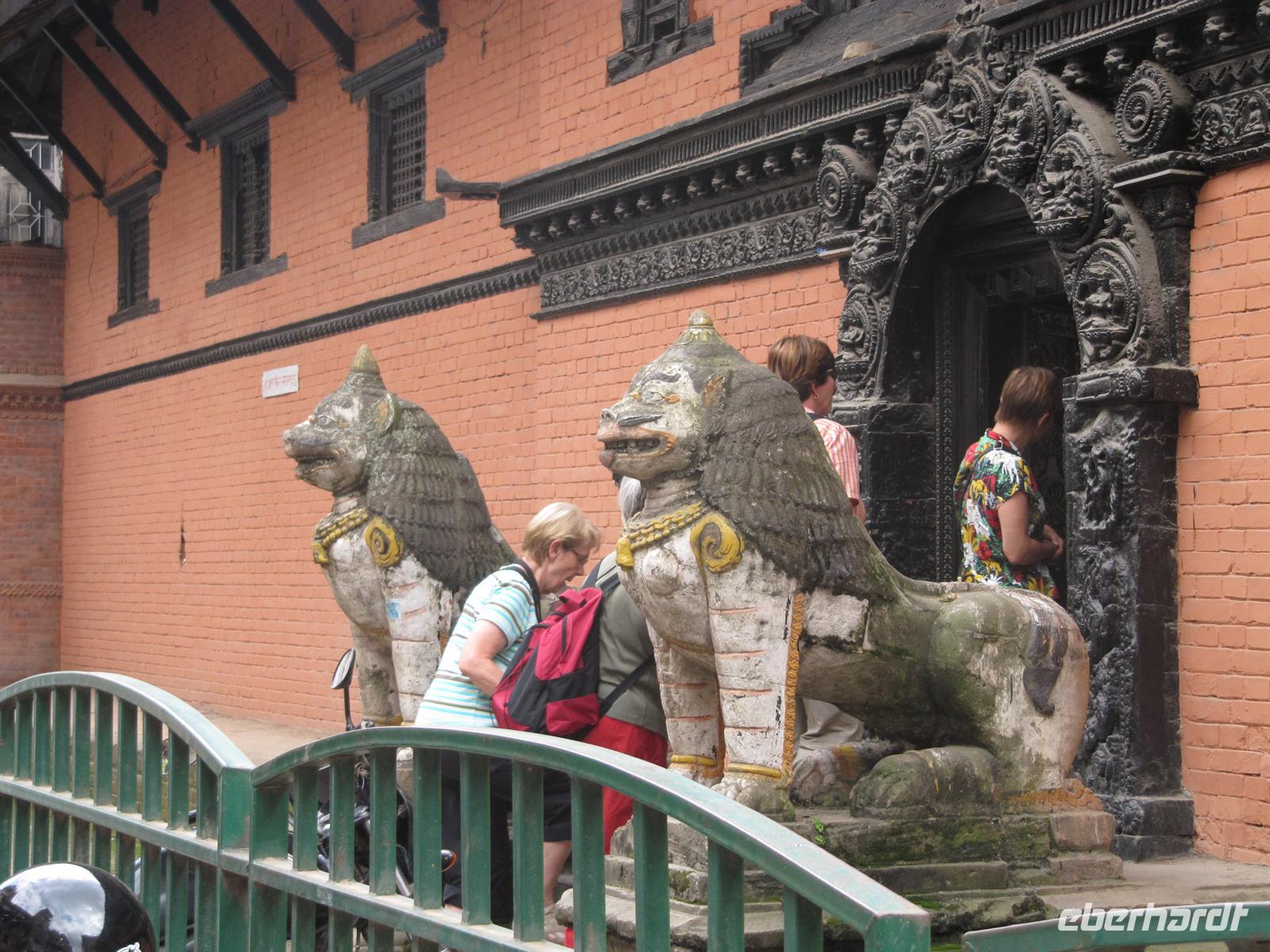 Gemeinsam sehen wir den Durbar-Platz, besuchen den Hanuman Dhoka Residenzpalast sowie die beiden Tempel Mahadev und Parvati. Auffällig ist, dass hier viel mehr Bettler sind als zum Beispiel in Lhasa. Es ist schwer ein schattiges Plätzchen zu finden. Die Straßen sind zu eng um mit dem Bus durchfahren zu können und so gehen wir zu Fuß. K.C. erzählt uns alles Wissenswerte über die Stadt. Man kommt sich ein bisschen vor wie in einem Entwicklungsland. Am späten Nachmittag fahren wir zurück zu unserem Hotel. Es war ein anstrengender Tag und so freuen wir uns auch schon auf unser Abendessen.