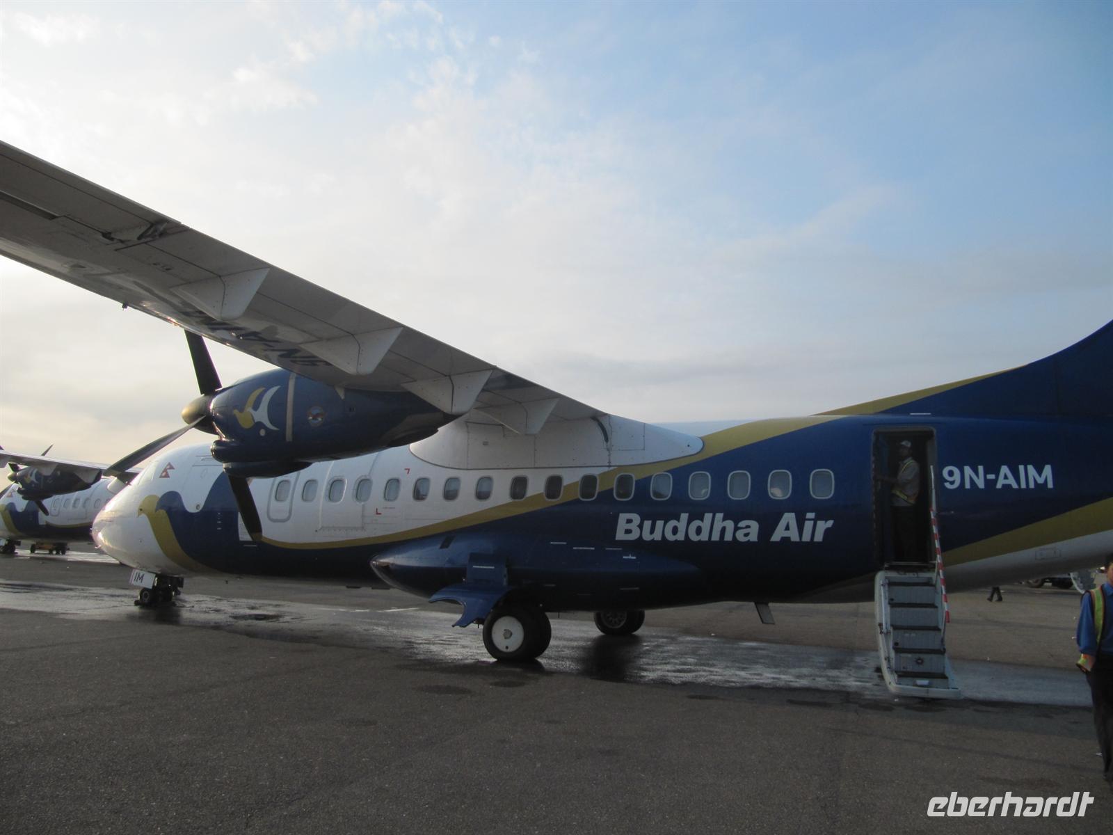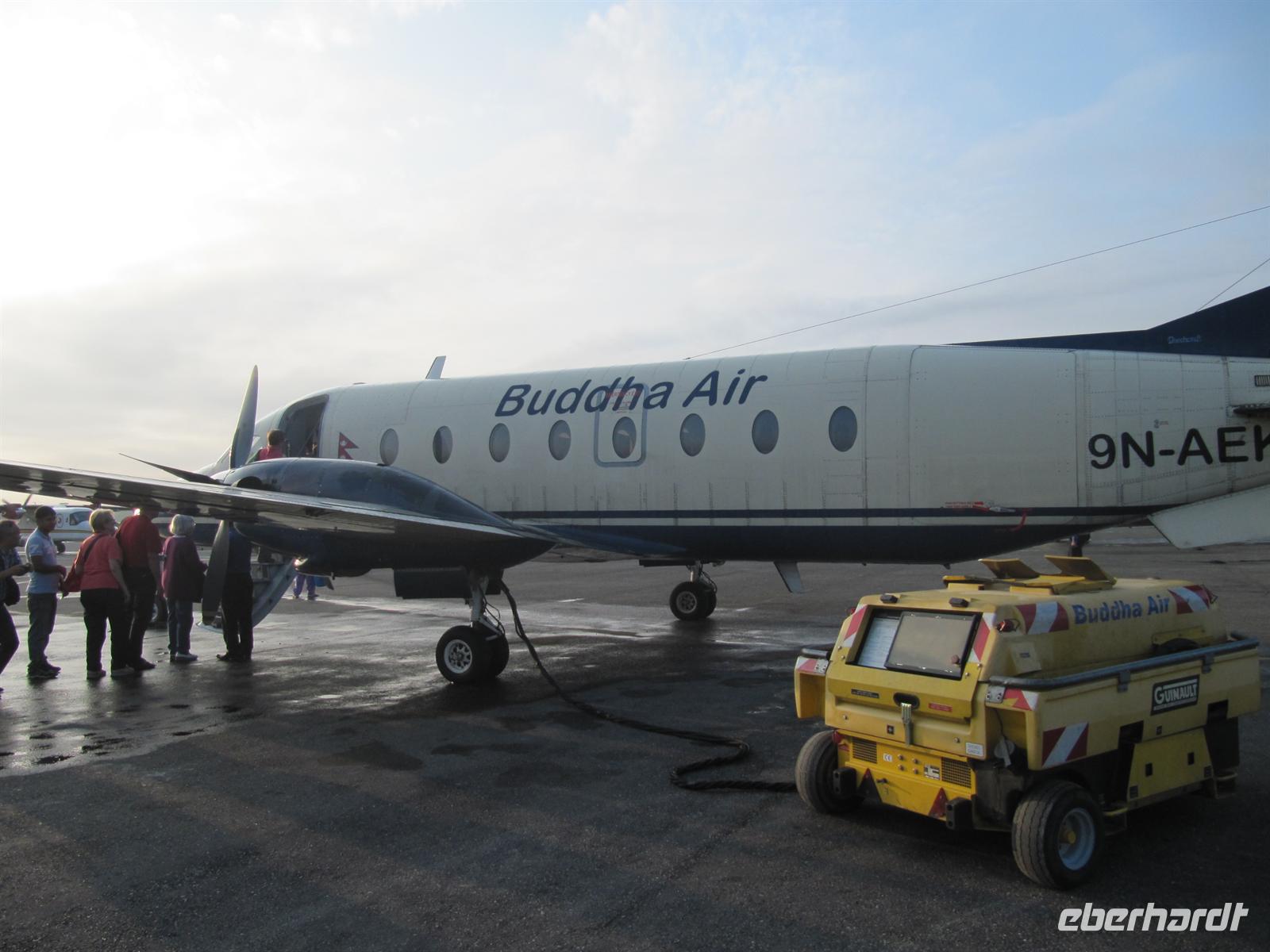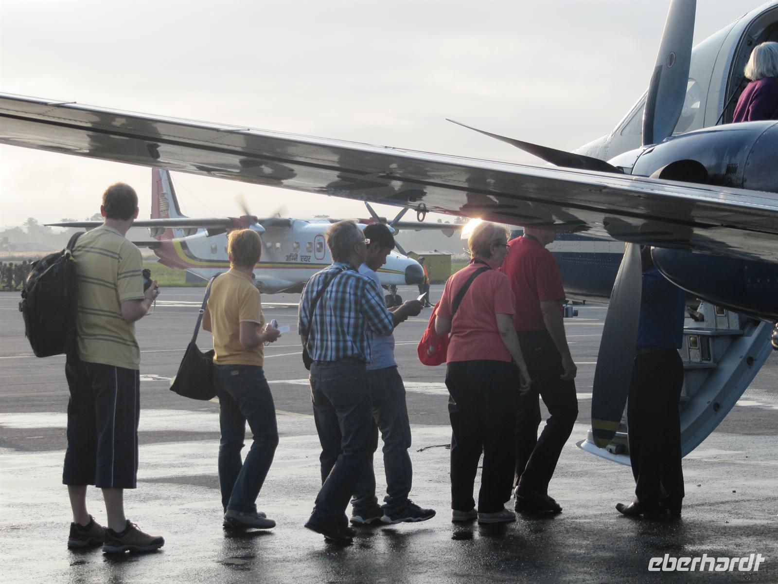 Heute heißt es für uns zeitig aufstehen denn uns erwartet heute Morgen ein ganz besonderes Erlebnis. Fast alle unserer Gruppe machen sich auf zum Inlandsflughafen von Kathmandu. Unsere Bordkarten der Buddha Air bekommen wir von K.C.