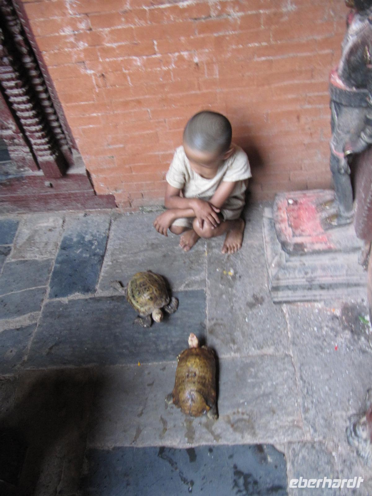 Am späten Vormittag fahren wir heute nach Patan. Patan, auch Lalitpur genannt, ist von Kathmandu nur durch den Bagmati-Fluss getrennt und nach Kathmandu die zweitgrößte Stadt Nepals. Im Gegensatz zu Kathmandu und Bhaktapur, ist Patan vorrangig eine buddhistische Stadt. Dies zeigt sich schon in über 150 ehemaligen Klöstern. Wir besuchen hier den Markt, den Tempel von Taleju, den Goldenen Tempel, in dem ein kleiner Junge der Priester ist und beobachten das Leben der Nepalesen. Hier wird der Müll noch mit der Hand entsorgt. Am späten Nachmittag beginnt es in Patan zu regnen und so beschließen wir uns einen Café zu gönnen bis der Regen nachlässt.