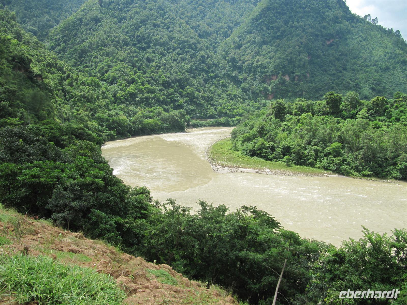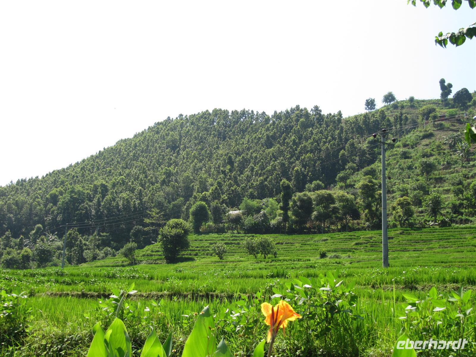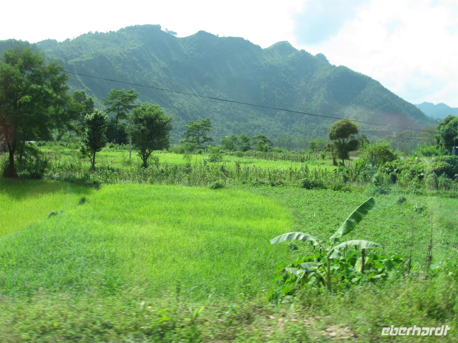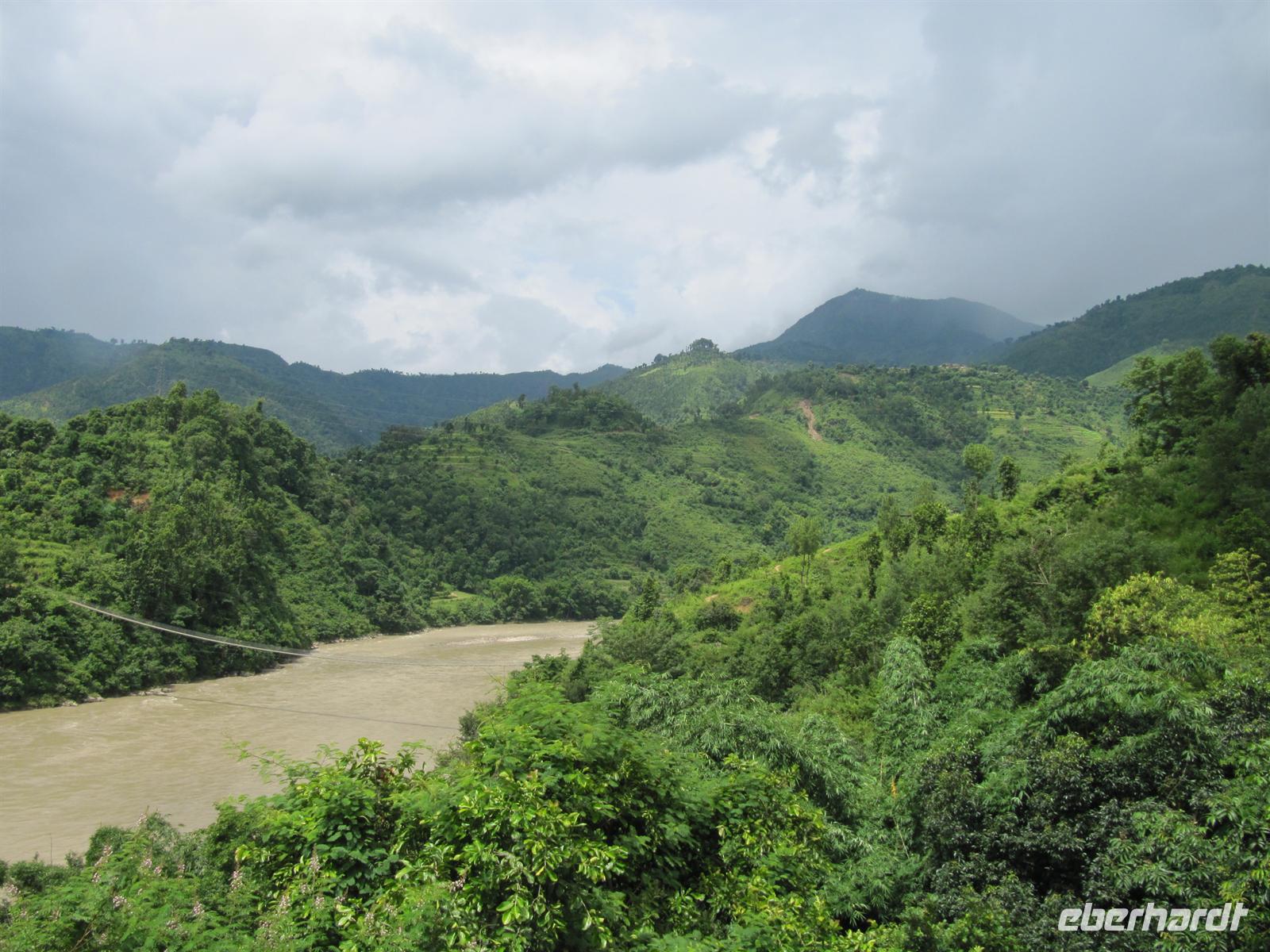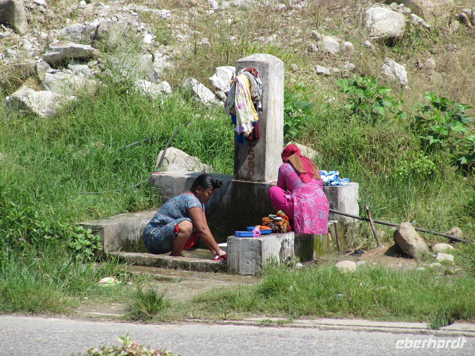 Unterwegs sehen wir wunderbar grüne, saftige Felder und allerlei verschiedene Pflanzenarten. Die Landschaft ist einfach traumhaft. So verzeiht man auch das ein oder andere holprige Stück. Bei unseren Pausen sehen wir, wie in Nepal gewaschen und gewohnt wird.