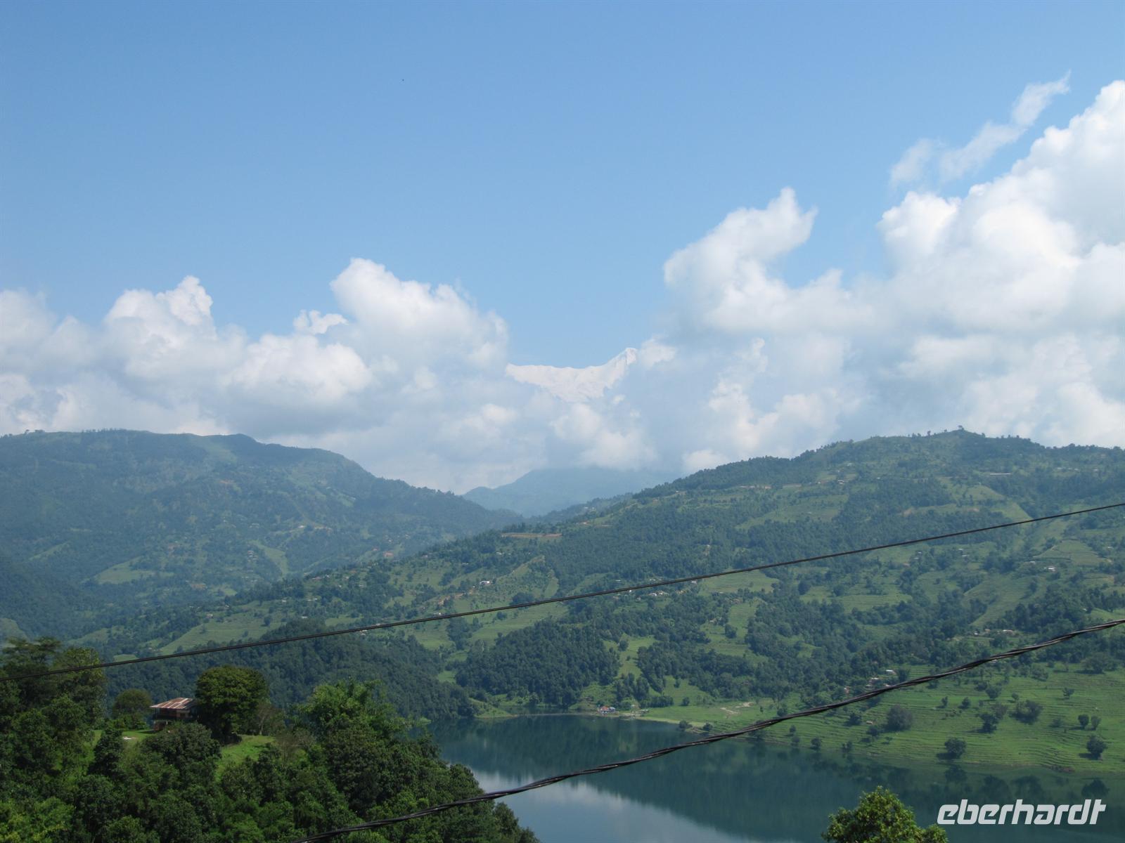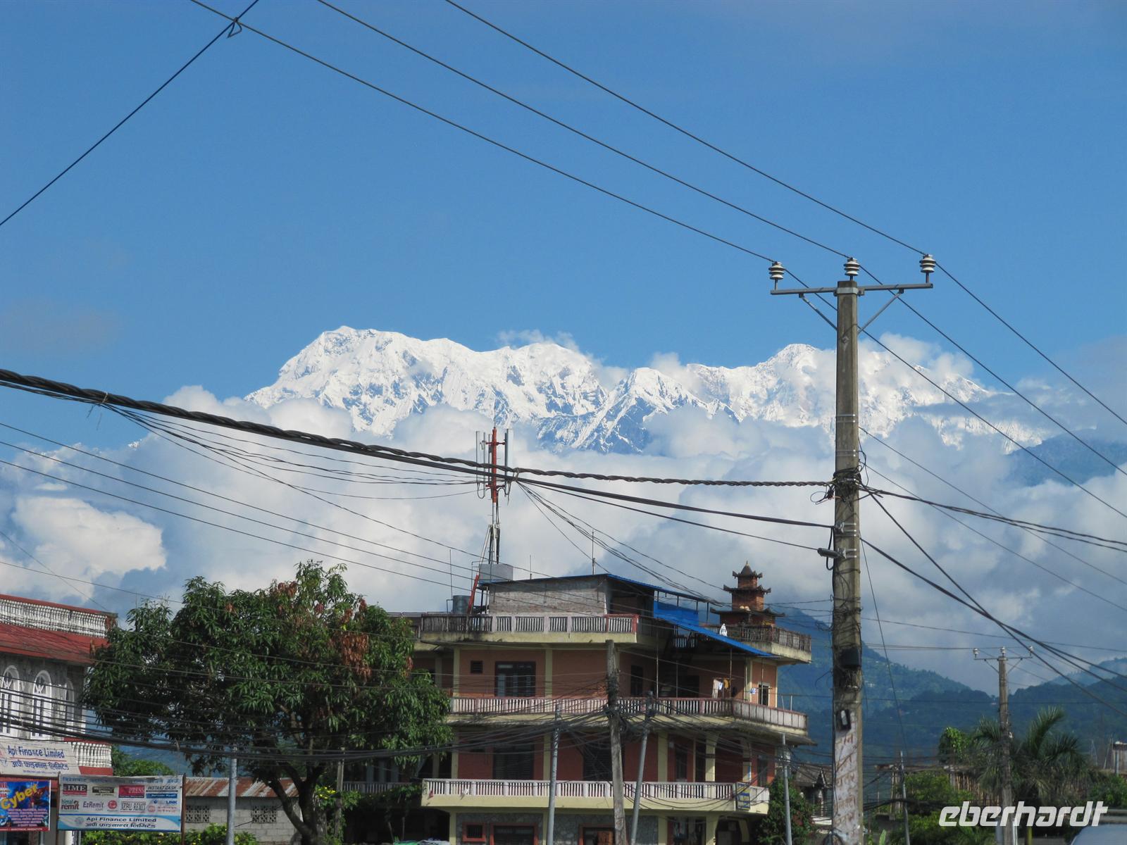Bevor wir allerdings unsere holprige Weiterreise antreten, halten wir noch einmal in Pokhara. Hier sind wir entzückt von einer zauberhaften, klaren Sicht auf die Anapurna-Gebirgskette. Am Vortag haben wir Sie nicht so wunderbar in Ihrer vollen Pracht sehen können. So schießen wir ein paar einmalige Fotos und sind fast ein wenig geblendet von den schneeweißen Gipfeln. Es ist erstaunlich, wenn man sich überlegt, dass wir in Pokhara bei fast 30 Grad schwitzen und sich hinter uns die Berge auftürmen.