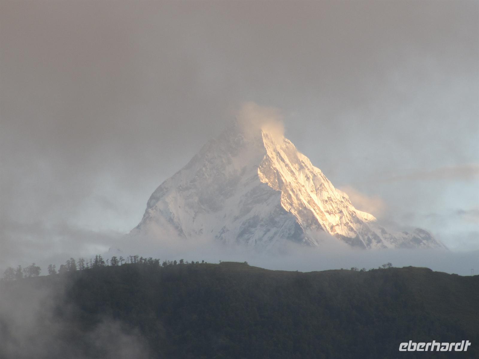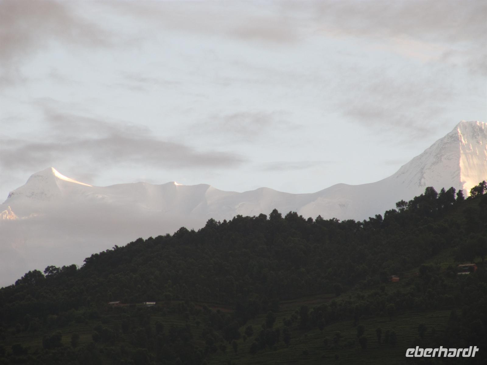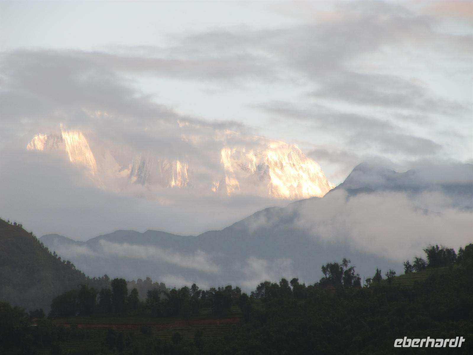 Am nächsten Morgen erblicken wir einen traumhaften Sonnenaufgang über der Anapurna-Kette. Faszination Himalaya pur! Nach dem Frühstück auf der Hotelterrasse mit Blick zu den schneebedeckten Gipfeln starten wir in den Tag.