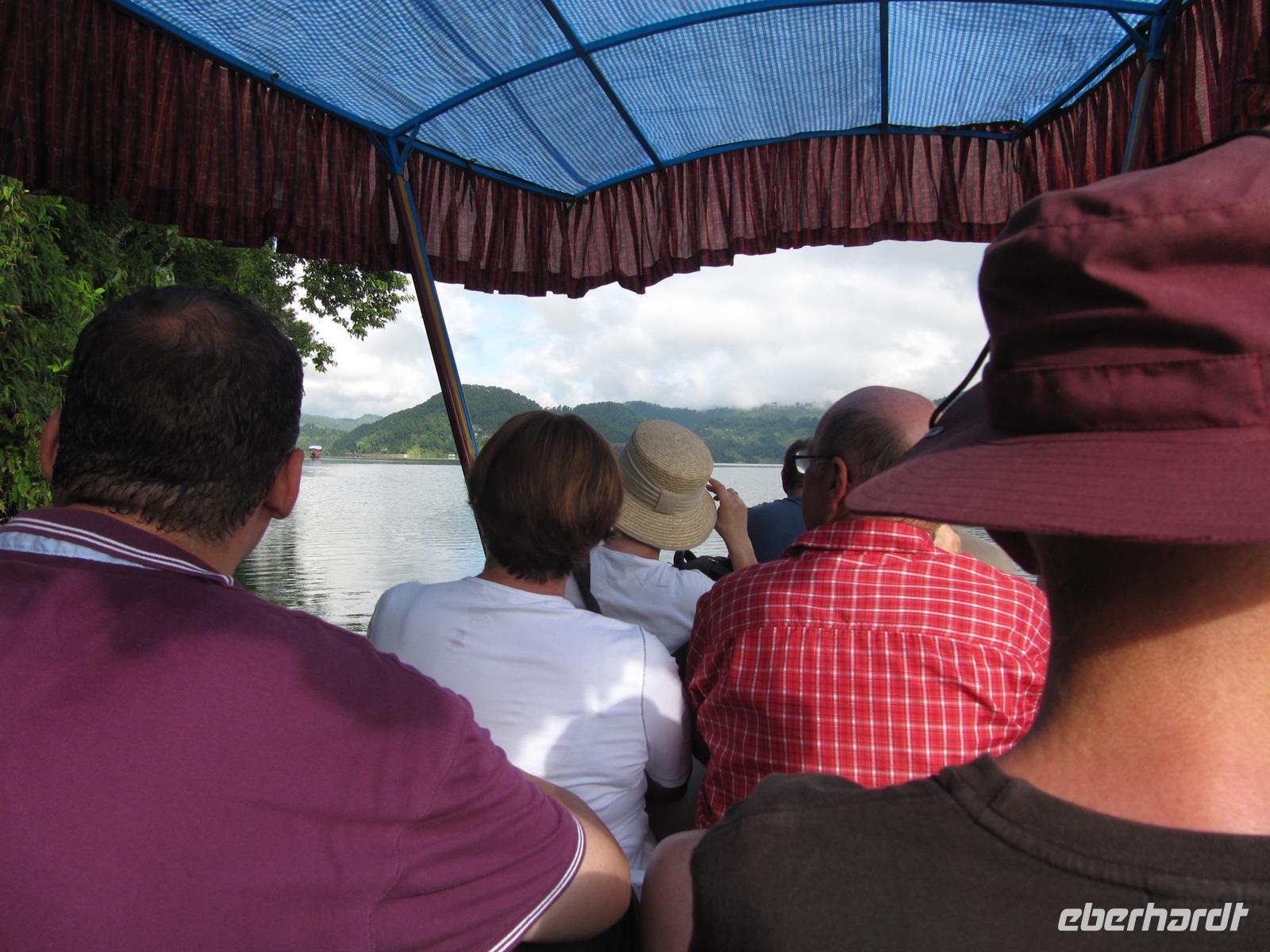Aus diesem Grund fahren wir nun noch circa 30 Minuten zum Begnas See, wo uns eine Fahrt im Boot erwartet. Hier ist es angenehm und so fahren wir gemeinsam mit unseren Koffern zu unserem Resort. Unsere Unterkunft für die nächsten zwei Nächte befindet sich direkt am Begnas See mit Blick zur Anapurna-Gebirgskette. Da das Resort idealerweise über den Seeweg erreichbar ist, fahren wir im Sonnenuntergang zu unserem Hotel. Als wir angekommen ist die Dunkelheit schon eingekehrt. Freudig werden wir empfangen und beziehen unsere rustikal-charmant eingerichteten Bungalows. Für fast alle von uns ist es das schönste Hotel unserer Reise.