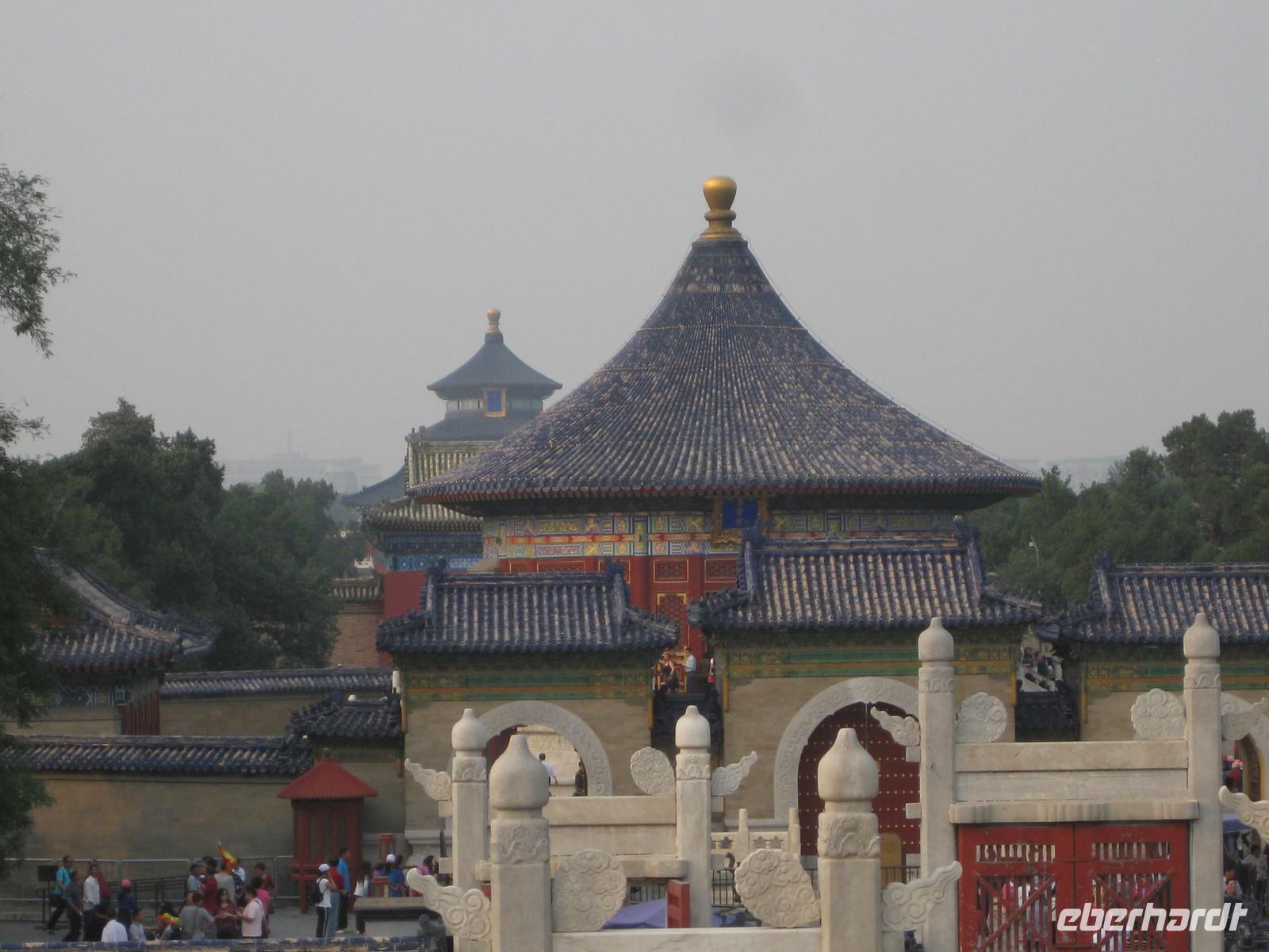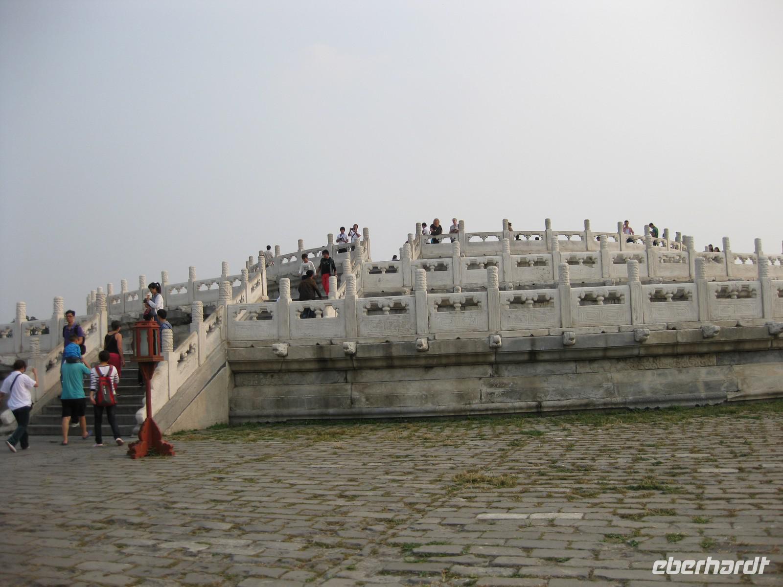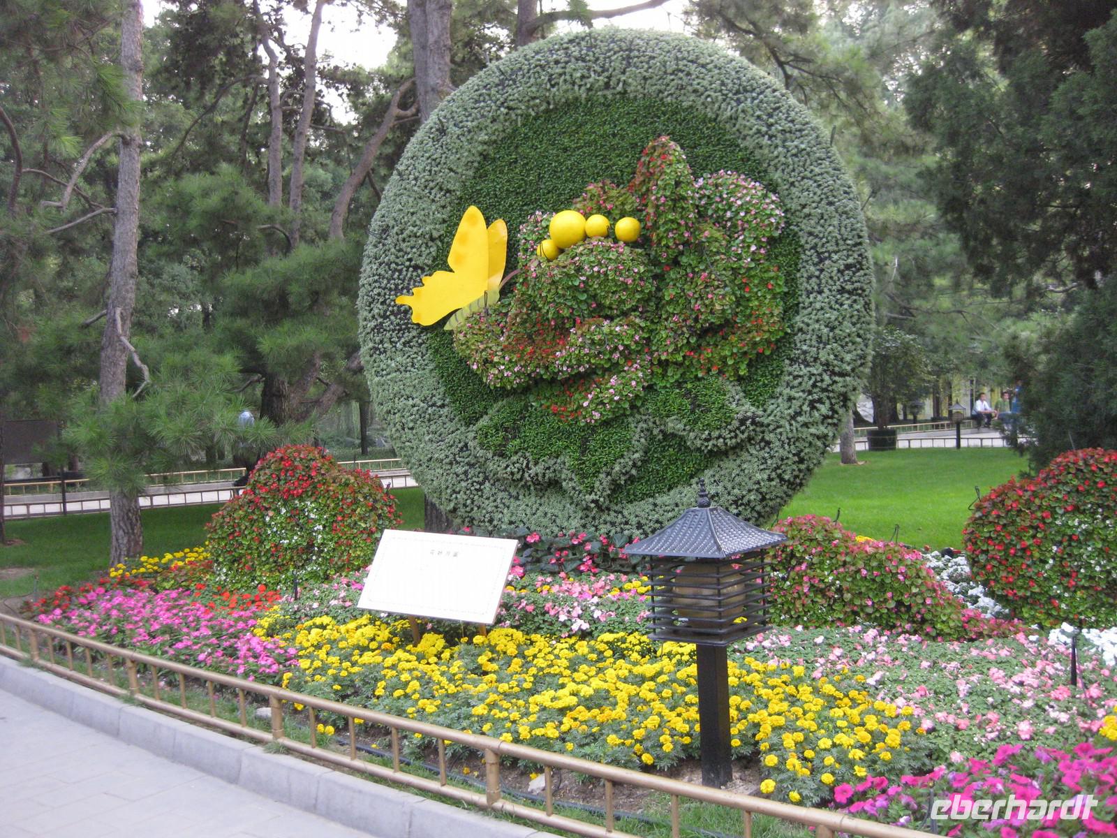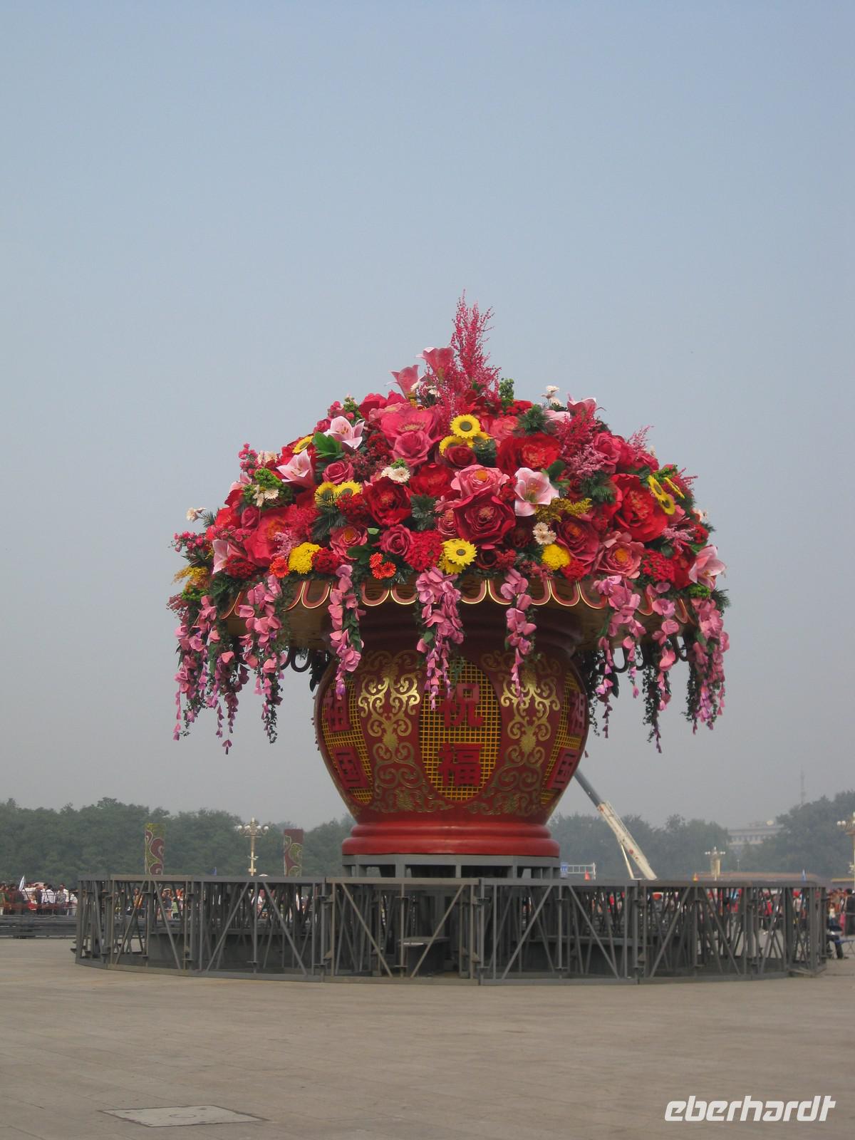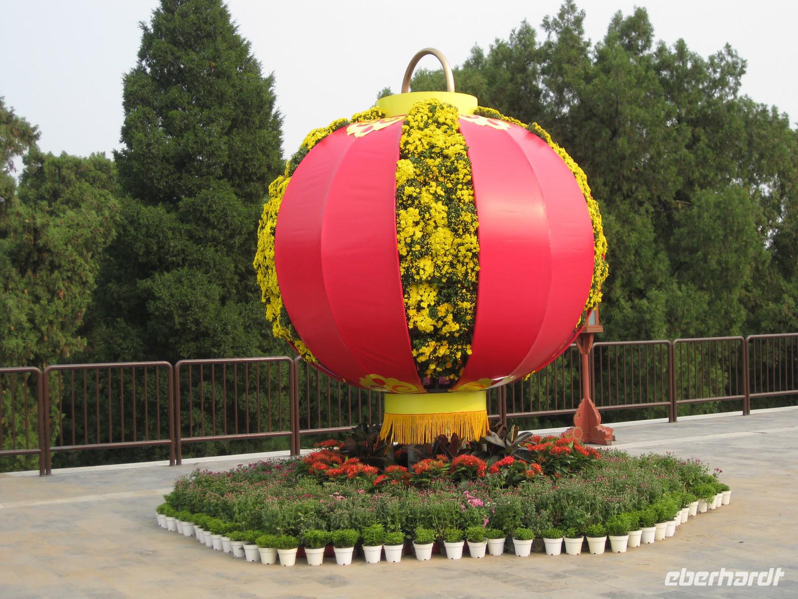 Am Nachmittag fahren wir zum Himmelstempelpark. Wir machen wieder einen längeren Rundgang zu Fuß. Cui gibt uns die entsprechenden Erklärungen dazu. Zuerst besuchen wir den Park wo sich viele ältere Chinesen treffen um Sport zu treiben, zu tanzen, singen, musizieren, spielen ..., einfach um in Gesellschaft zu sein. Dann kommen wir zur Halle des Erntegebets (Himmelstempel), laufen auf dem Dammweg nach Süden zum kaiserlichen Himmelsgewölbe und erreichen im Süden am Ende der Anlage den Himmelsaltar. Hier sind alle Dächer blau, weil der Himmel blau ist. Auch hier wird alles mit Blumen geschmückt.
