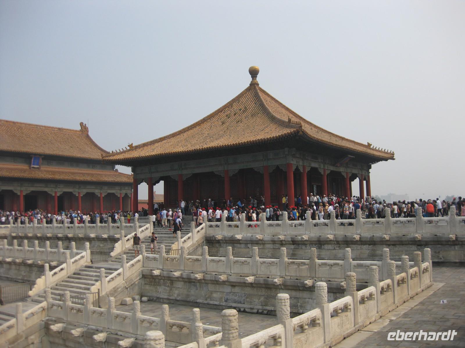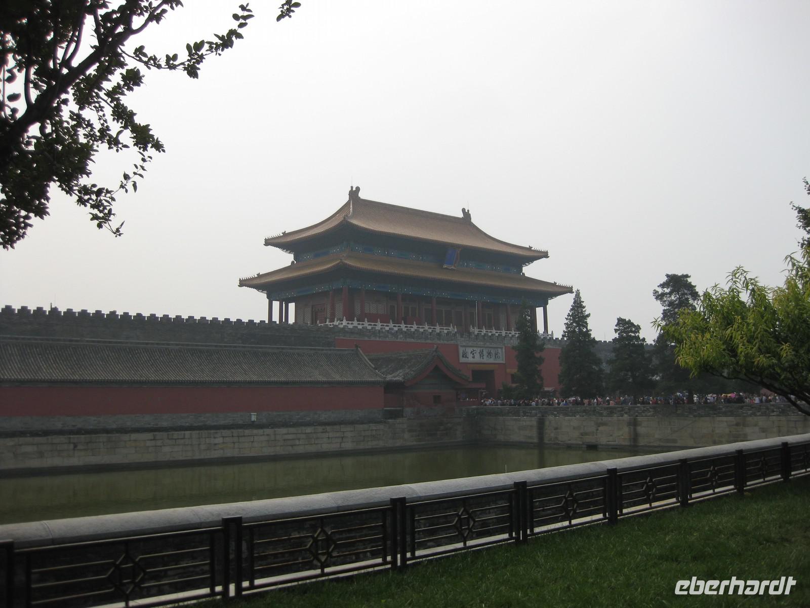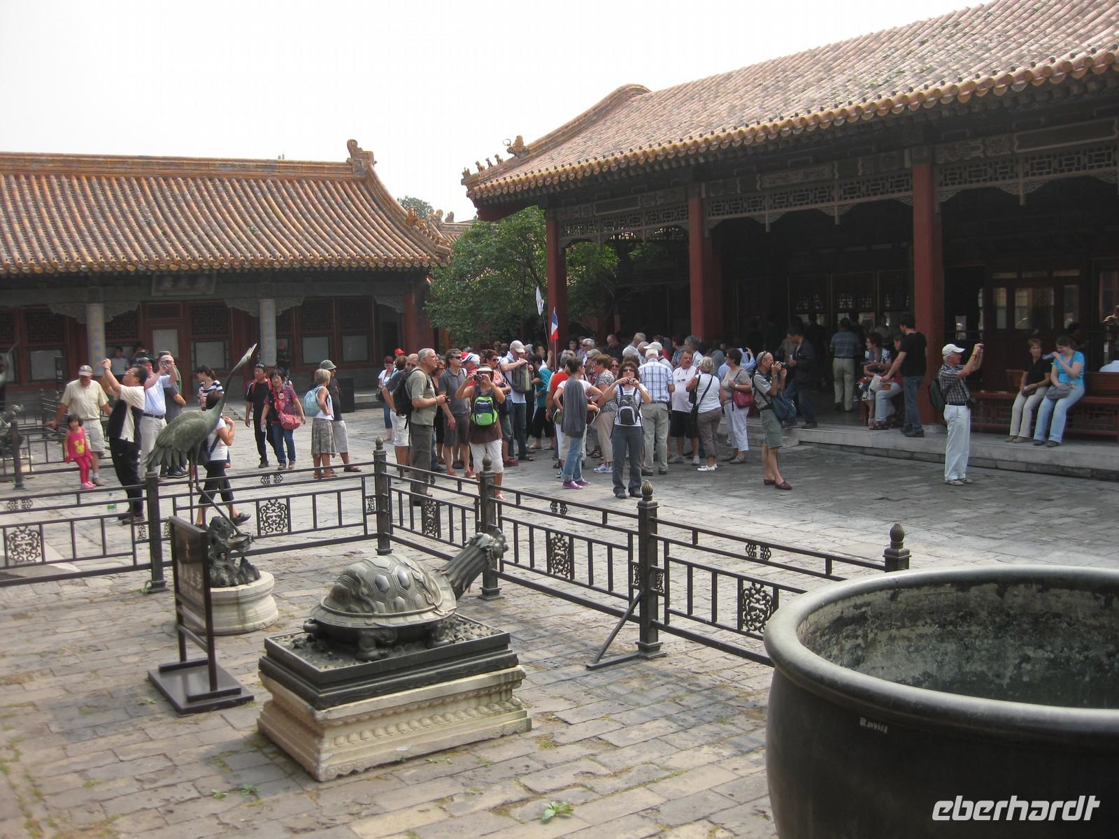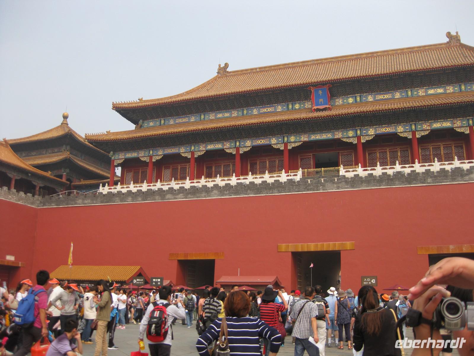 Nachdem wir uns auf dem Tiananmen-Platz umgeschaut und die ersten Fotos geschossen haben, gehen wir durch das Südtor, auch "Mittagstor" in die Verbotene Stadt und beginnen unsere Besichtigung. Verbotene Stadt deshalb, weil hier nur der Kaiser mit seinem Gefolge und hohe Beamte Zutritt hatten. Die einfachen Menschen von Peking und China durften nicht hinein. Auch hier sind sehr viele Menschen unterwegs. Wir besichtigen die kaiserlichen Hallen und auch die der Bediensteten. Cui erklärt uns die Verbotene Stadt. Alle Dächer sind golden. Er erzählt auch über das Leben in der Verbotenen Stadt, für uns eigentlich unvorstellbar. Es ist alles sehr interessant. Am Mittag verlassen wir die Verbotene Stadt durch das Nordtor.