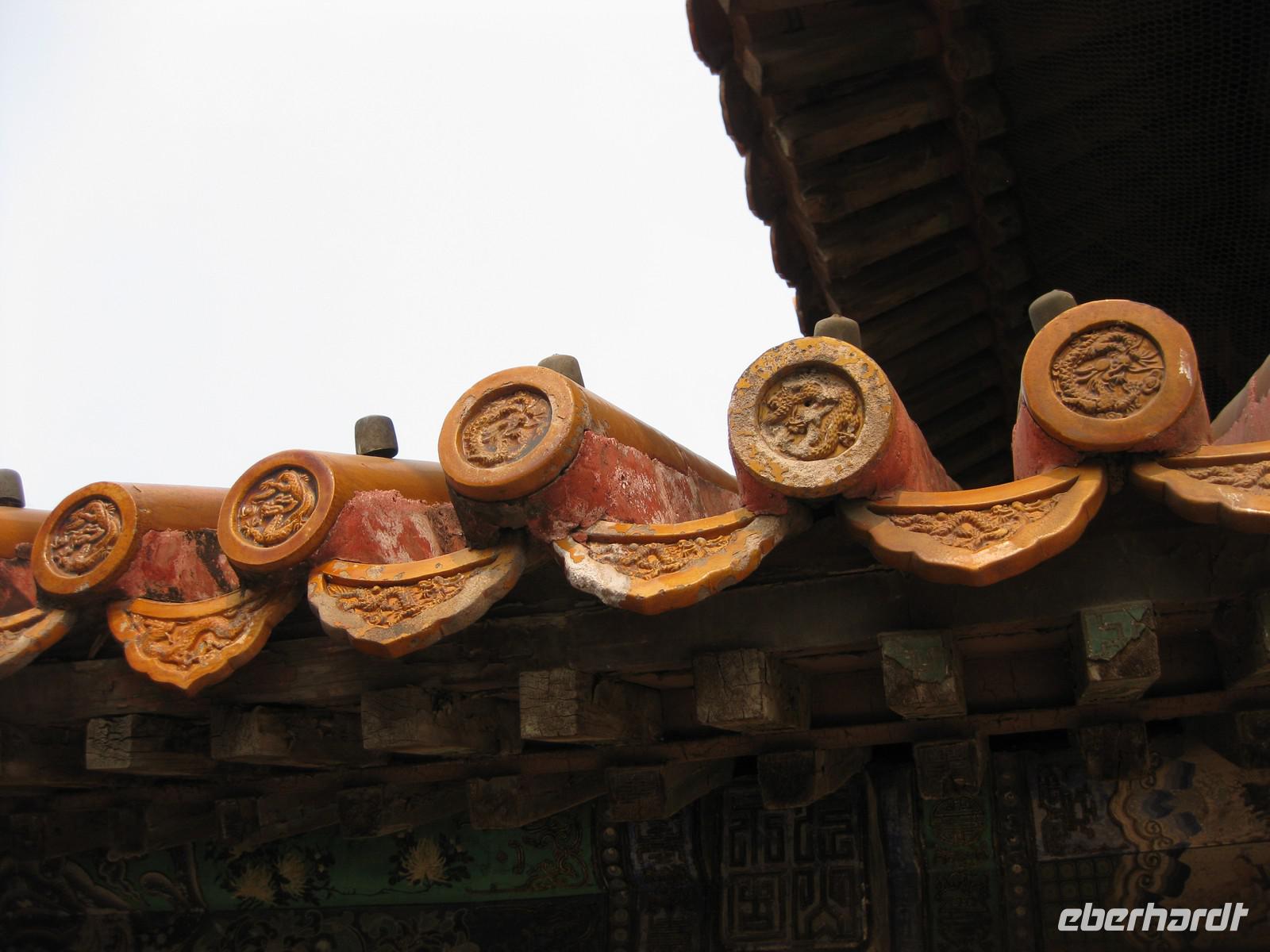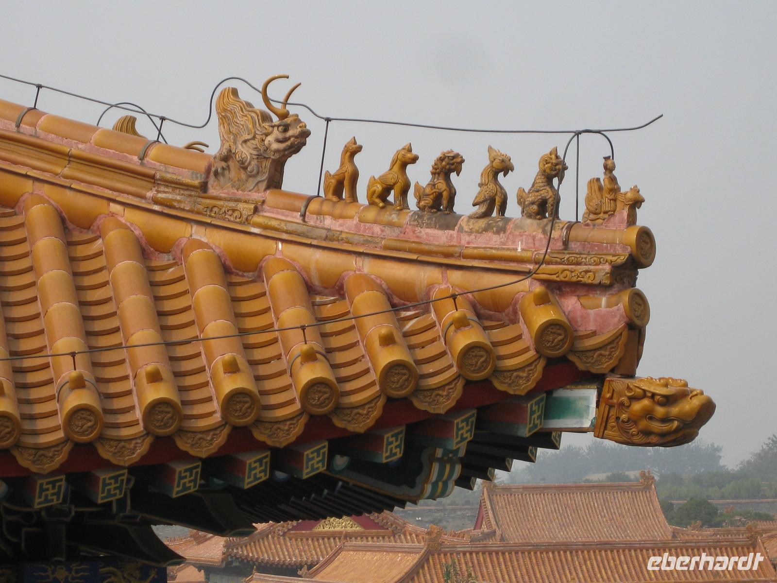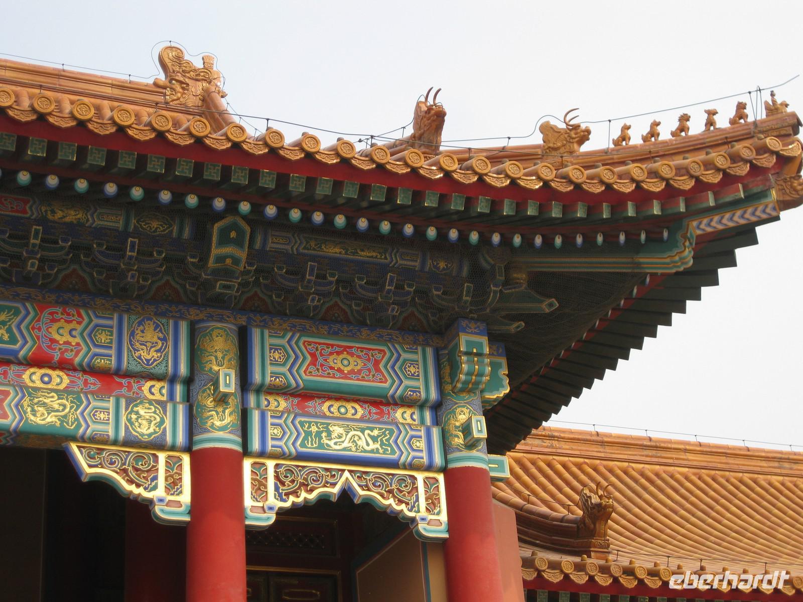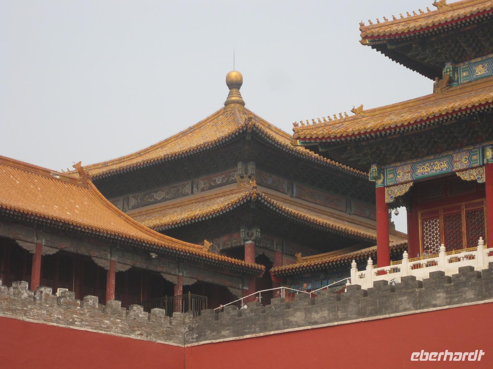 Nachdem wir uns auf dem Tiananmen-Platz umgeschaut und die ersten Fotos geschossen haben, gehen wir durch das Südtor, auch "Mittagstor" in die Verbotene Stadt und beginnen unsere Besichtigung. Verbotene Stadt deshalb, weil hier nur der Kaiser mit seinem Gefolge und hohe Beamte Zutritt hatten. Die einfachen Menschen von Peking und China durften nicht hinein. Auch hier sind sehr viele Menschen unterwegs. Wir besichtigen die kaiserlichen Hallen und auch die der Bediensteten. Cui erklärt uns die Verbotene Stadt. Alle Dächer sind golden. Er erzählt auch über das Leben in der Verbotenen Stadt, für uns eigentlich unvorstellbar. Es ist alles sehr interessant. Am Mittag verlassen wir die Verbotene Stadt durch das Nordtor.
