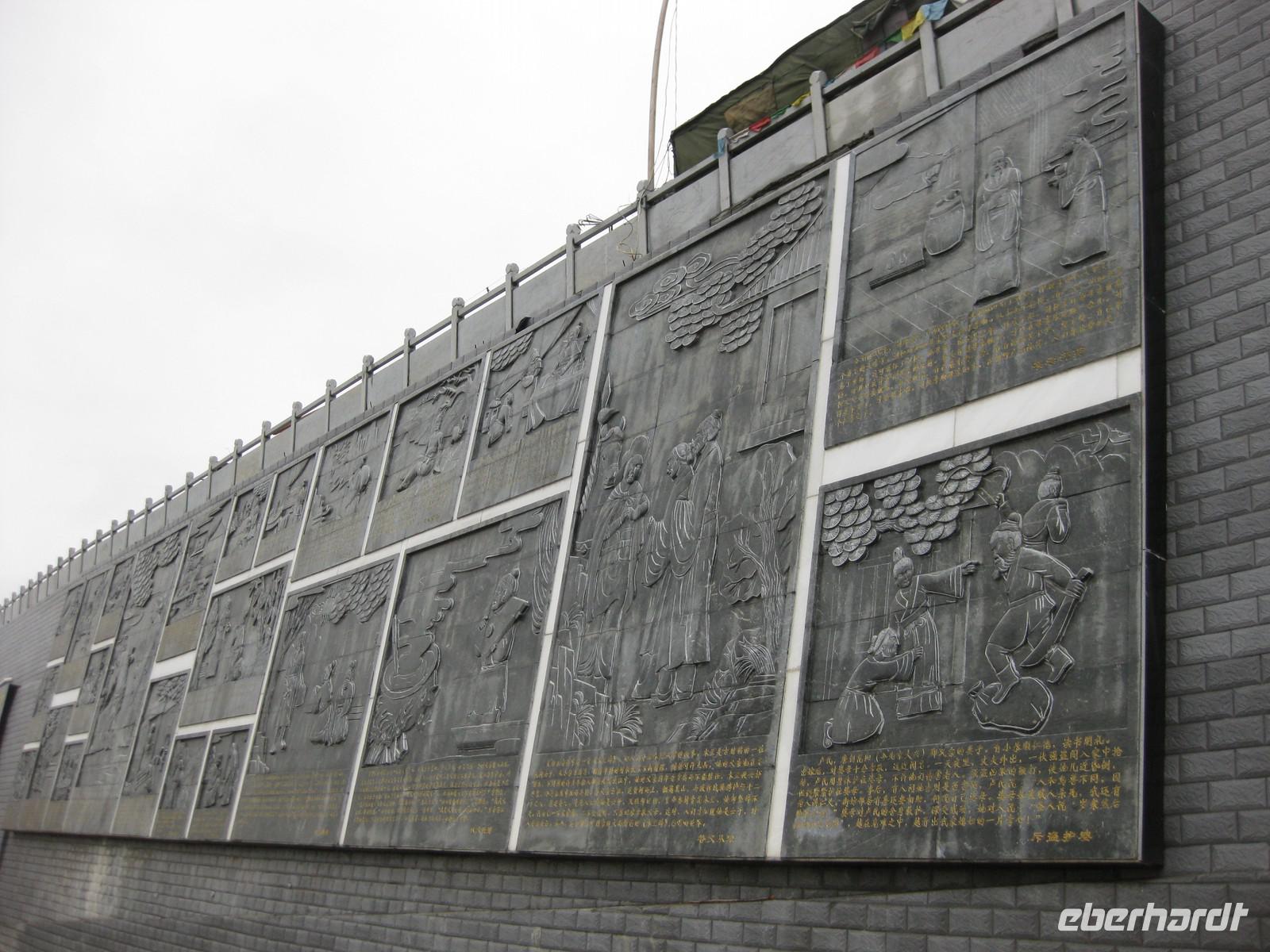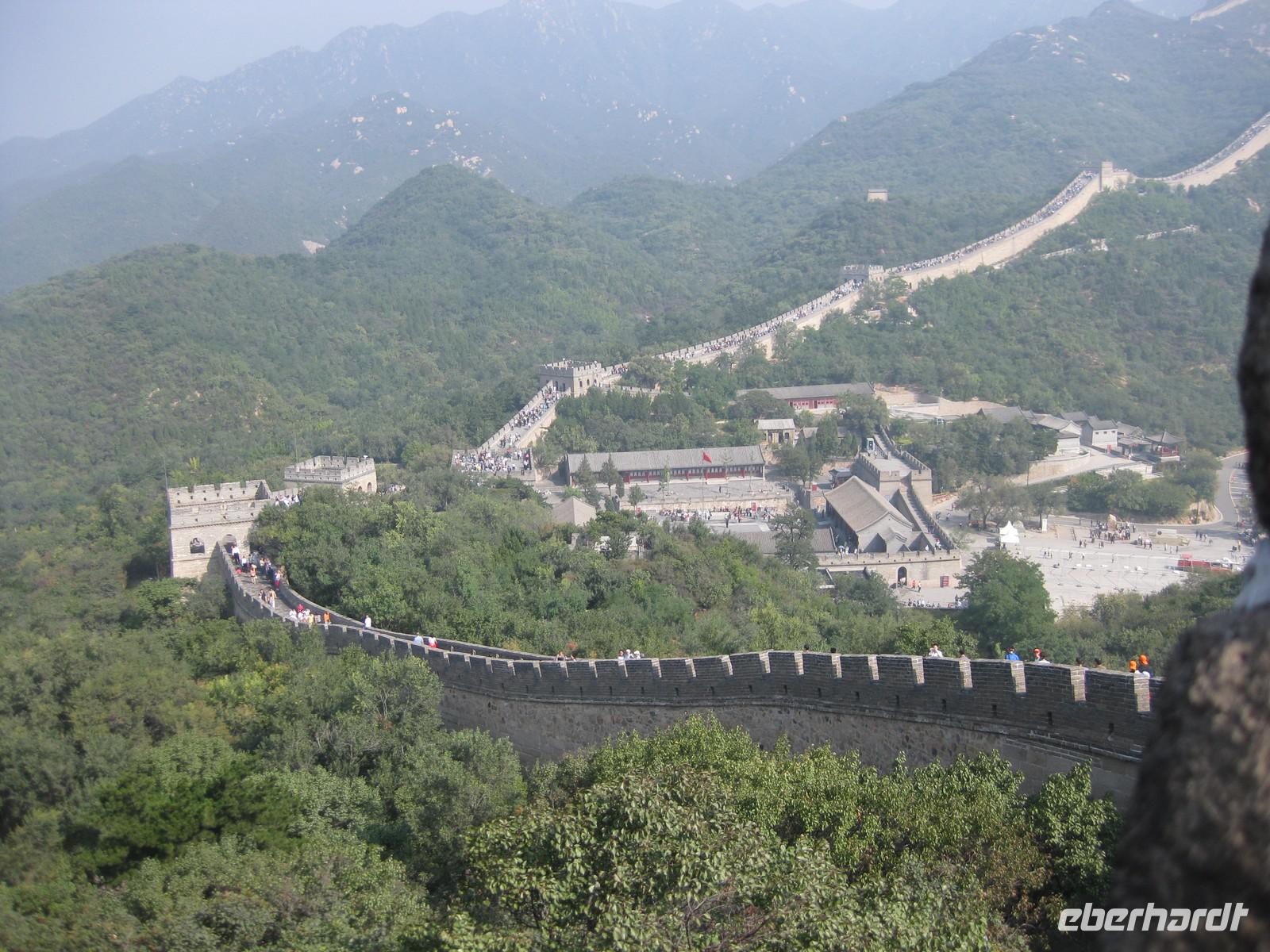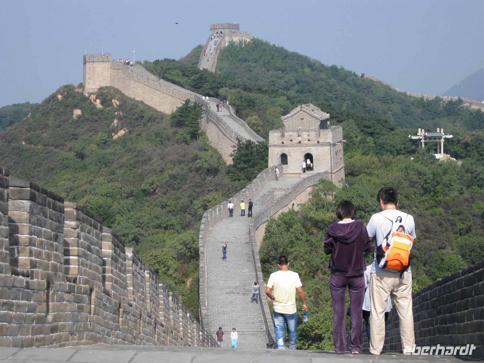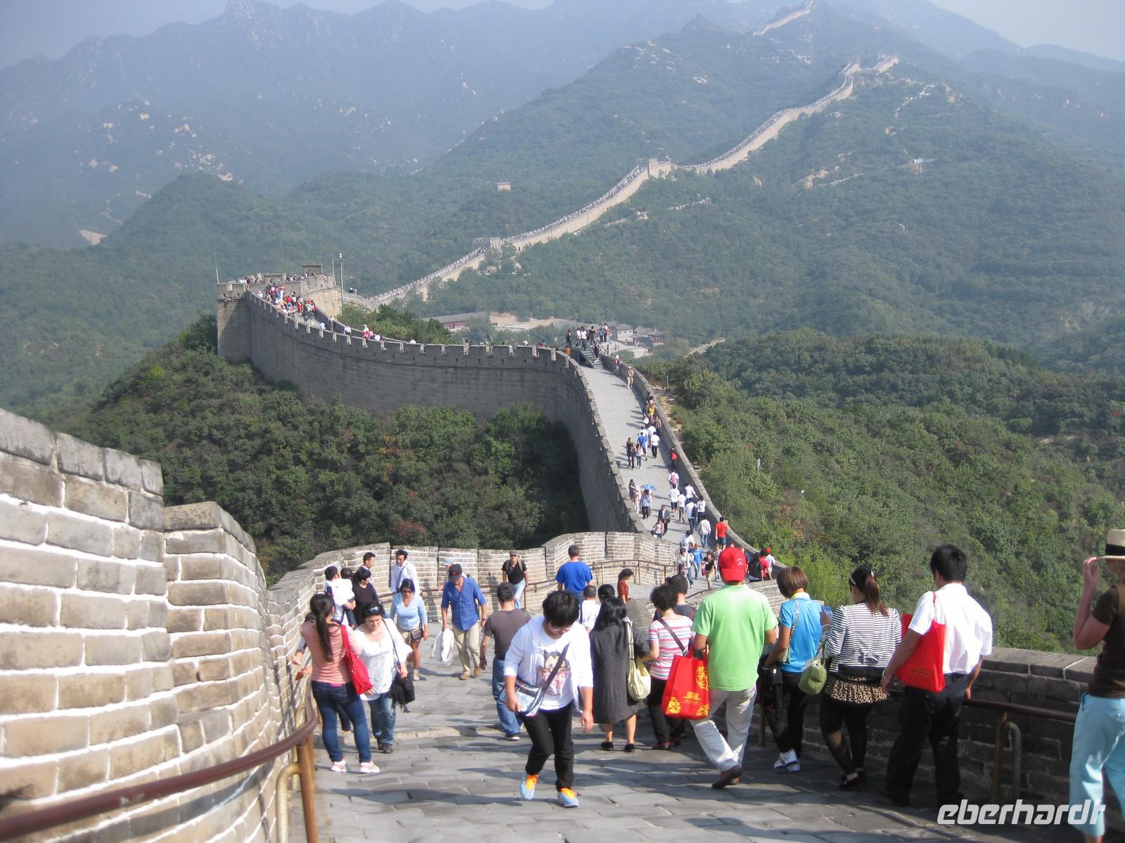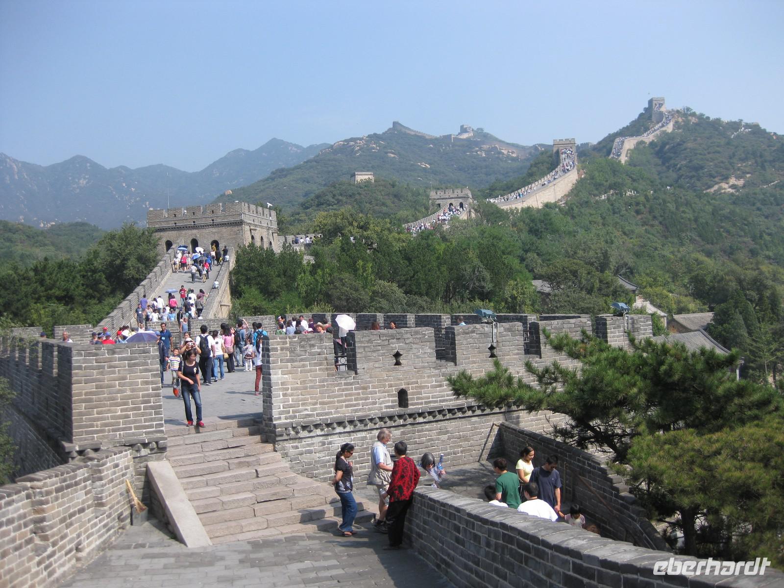 Zuerst fahren wir durch die Stadt, die noch etwas verschlafen scheint - es ist ja schließlich Sonntag. Dann verlassen wir die Stadt in nördlicher Richtung und erreichen bald die Große Mauer bei Badaling. Vom Parkplatz aus laufen wir durch eine kleine Siedlung mit vielen Restaurants und Souvenirgeschäften bis zum Eingang für diesen Mauerabschnitt. Von hier aus können wir auf die Große Mauer steigen und sie in zwei Richtungen abwandern. Ehe aber alle ausschwärmen und die Große Mauer erobern, treffen wir uns noch zu einem Gruppenfoto auf der Großen Mauer. Dann laufen alle die Mauer ein Stück ab, jeder soweit wie er mag. Wir müssen nur dabei bedenken, dass wir auch wieder zurück kommen, denn wir wollen uns um 12.00 Uhr in der kleinen Siedlung wieder treffen. Alle sind voller Eindrücke pünktlich zurück. Wir gönnen uns noch ein Eis und dann fahren wir ab.
