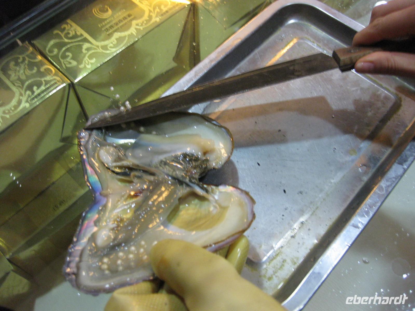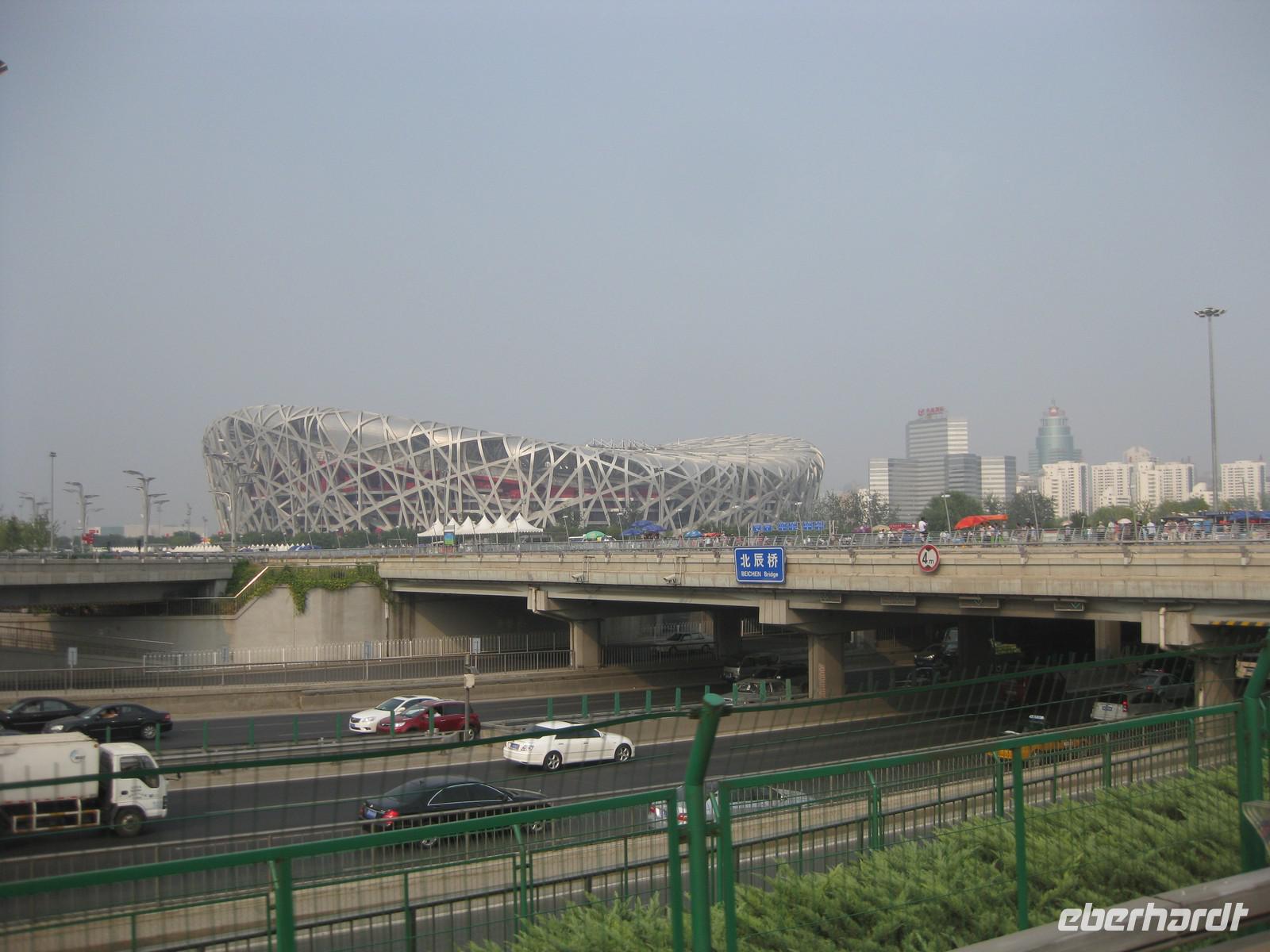 Wir fahren jetzt durch den Stadtteil, in dem sich die olympischen Sportstätten befinden. Wir sehen das "Vogelnest", das Schwimmstadion und weitere Wettkampfstätten und auch das olympische Dorf. In diesem Stadtteil besuchen wir eine Perlenzuchtfabrik, in der wir auch etwas kaufen können.