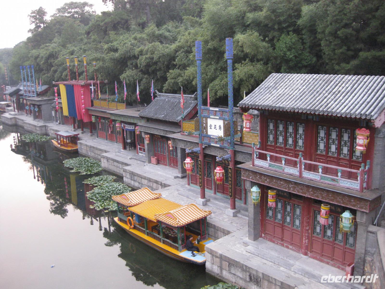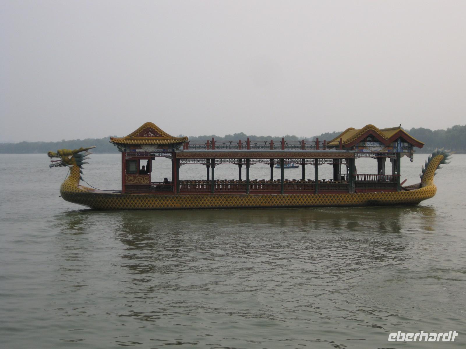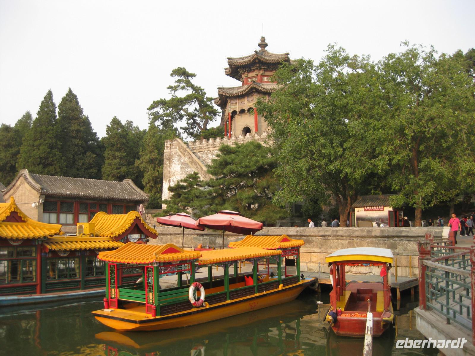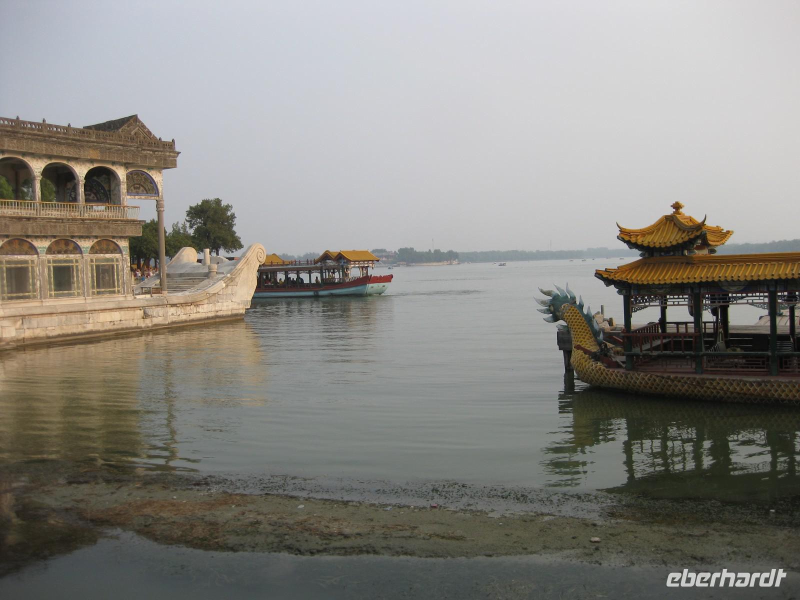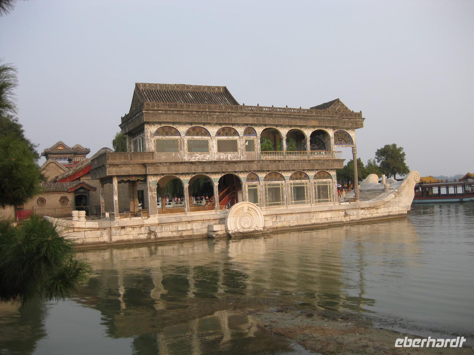 Dann fahren wir weiter zum Sommerpalast am anderen Ende der Stadt. Die Anlage wird vom Kunming-See und dem "Berg der Langlebigkeit" bestimmt. Sie war als "Witwensitz" gedacht und erscheint heute als ein Wunderwerk der Landschaftsarchitektur. Wir spazieren durch den Park und sehen auch das berühmte Marmorschiff.