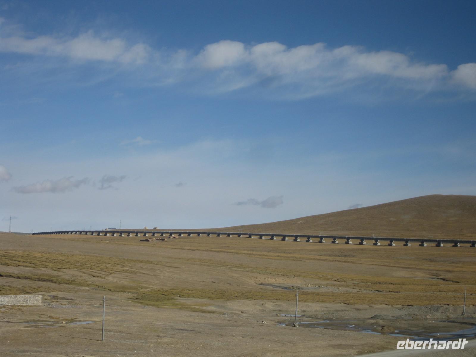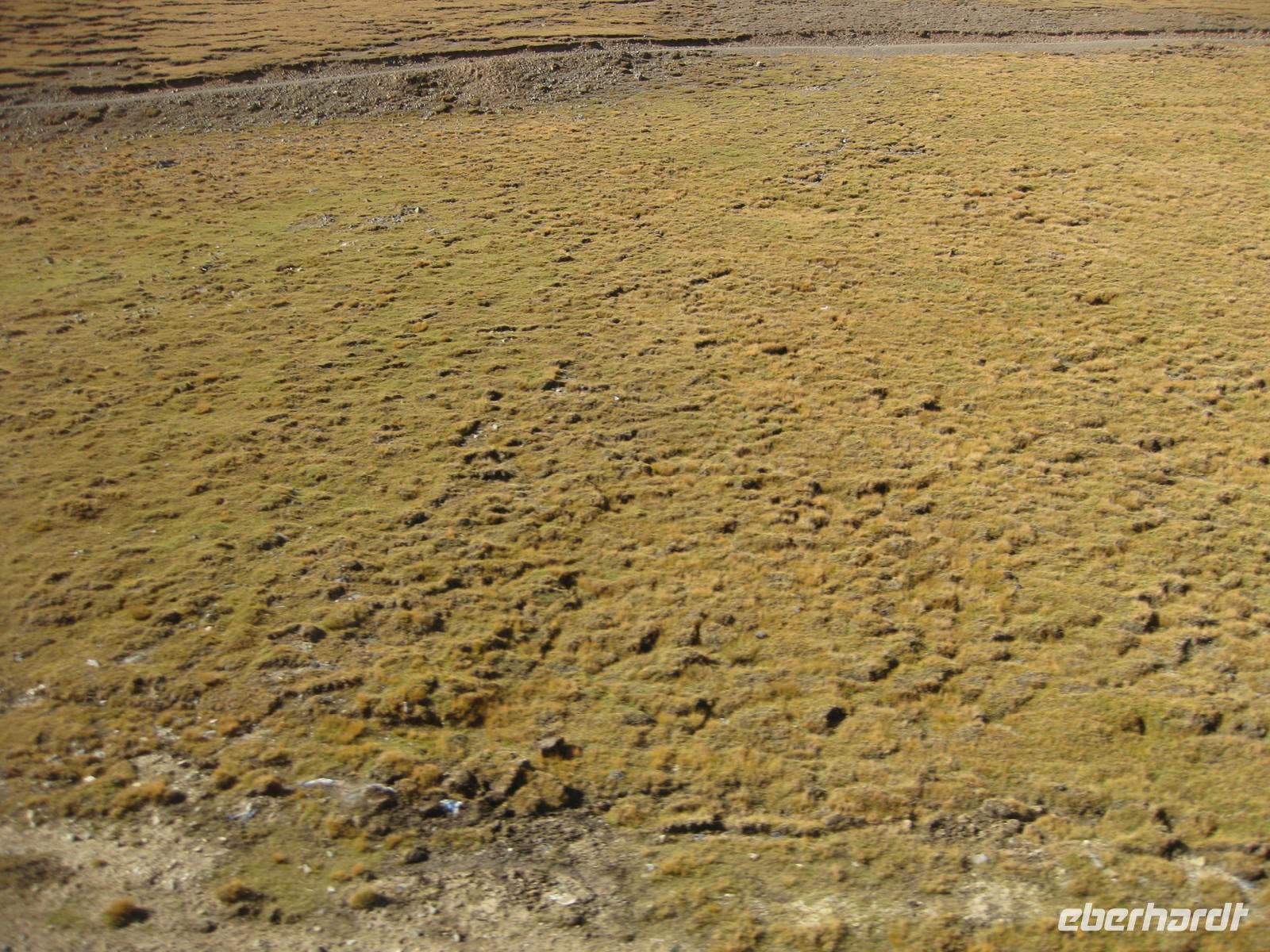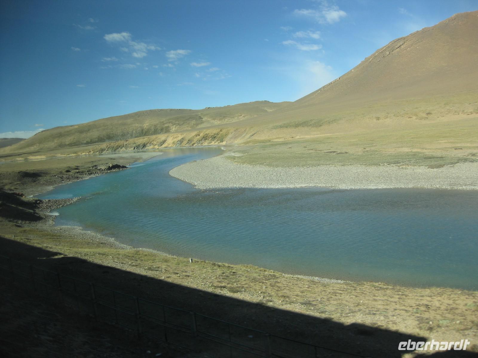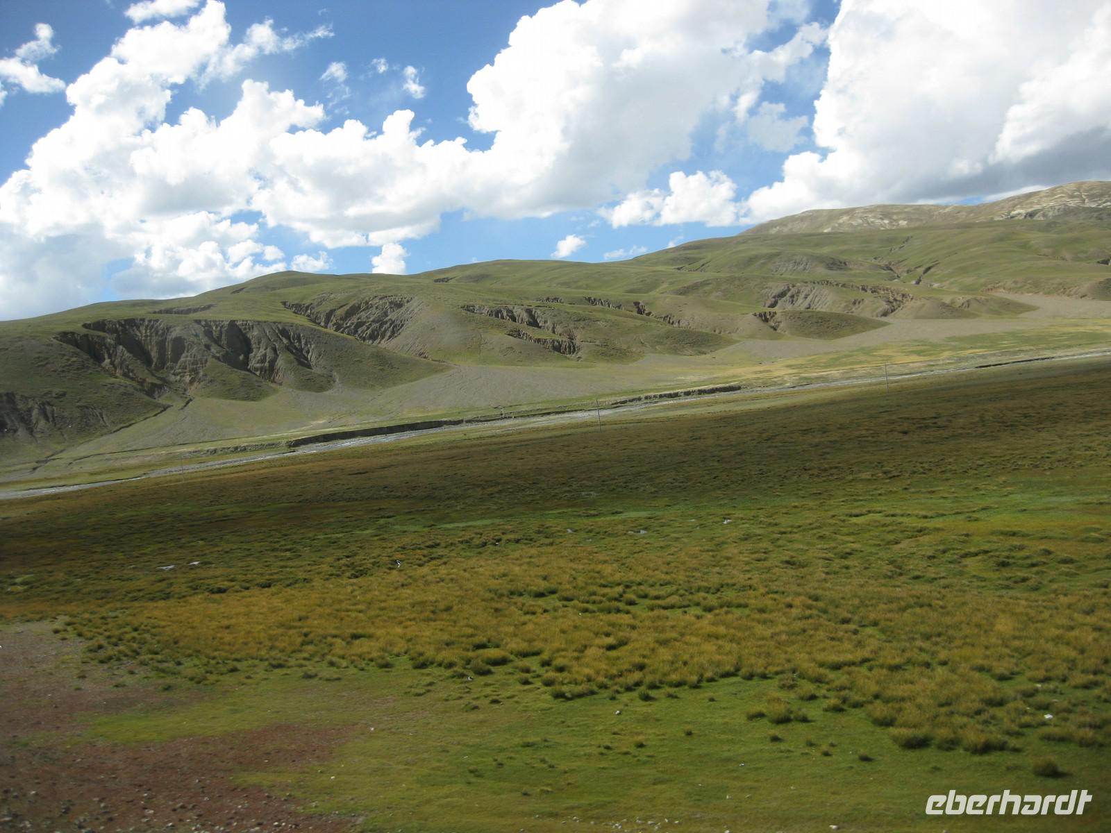 Draußen zieht die Landschaft vorbei, eine karge, sehr schöne Steppenlandschaft mit Gebirgen und Flüssen. Parallel zur Eisenbahnstrecke befindet sich eine Straße, auf der die Überlandroute entlang führt. Bäume und Sträucher wachsen hier längst nicht mehr, denn wir haben inzwischen schon eine Höhe von über 4.500 m erreicht. Die Erde ist nur noch mit Moos bedeckt. Das Wetter ist sehr schön, Sonnenschein und blauer Himmel. So können wir alles richtig genießen.