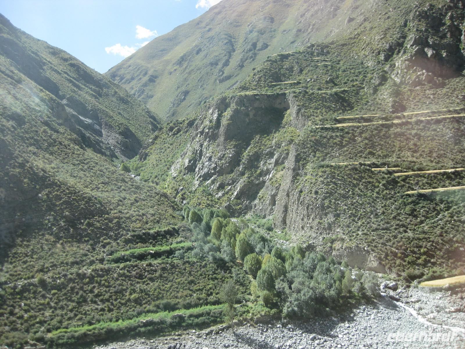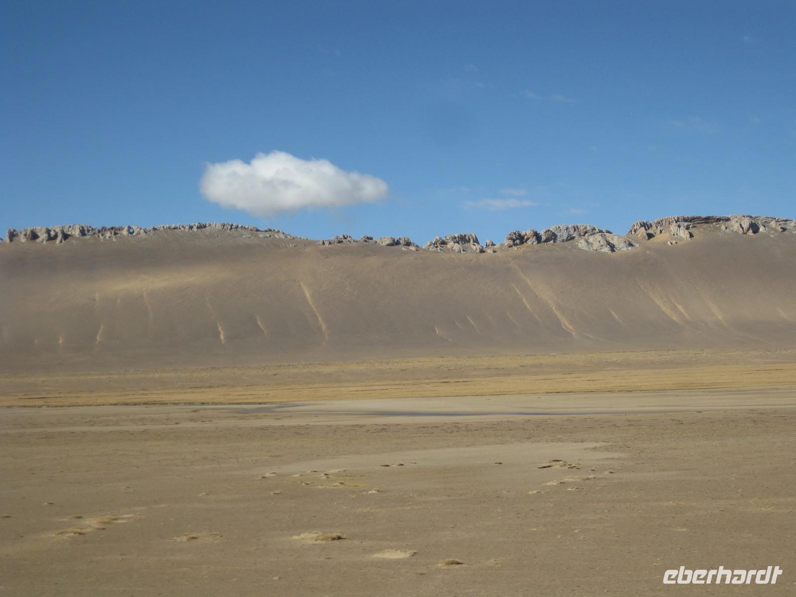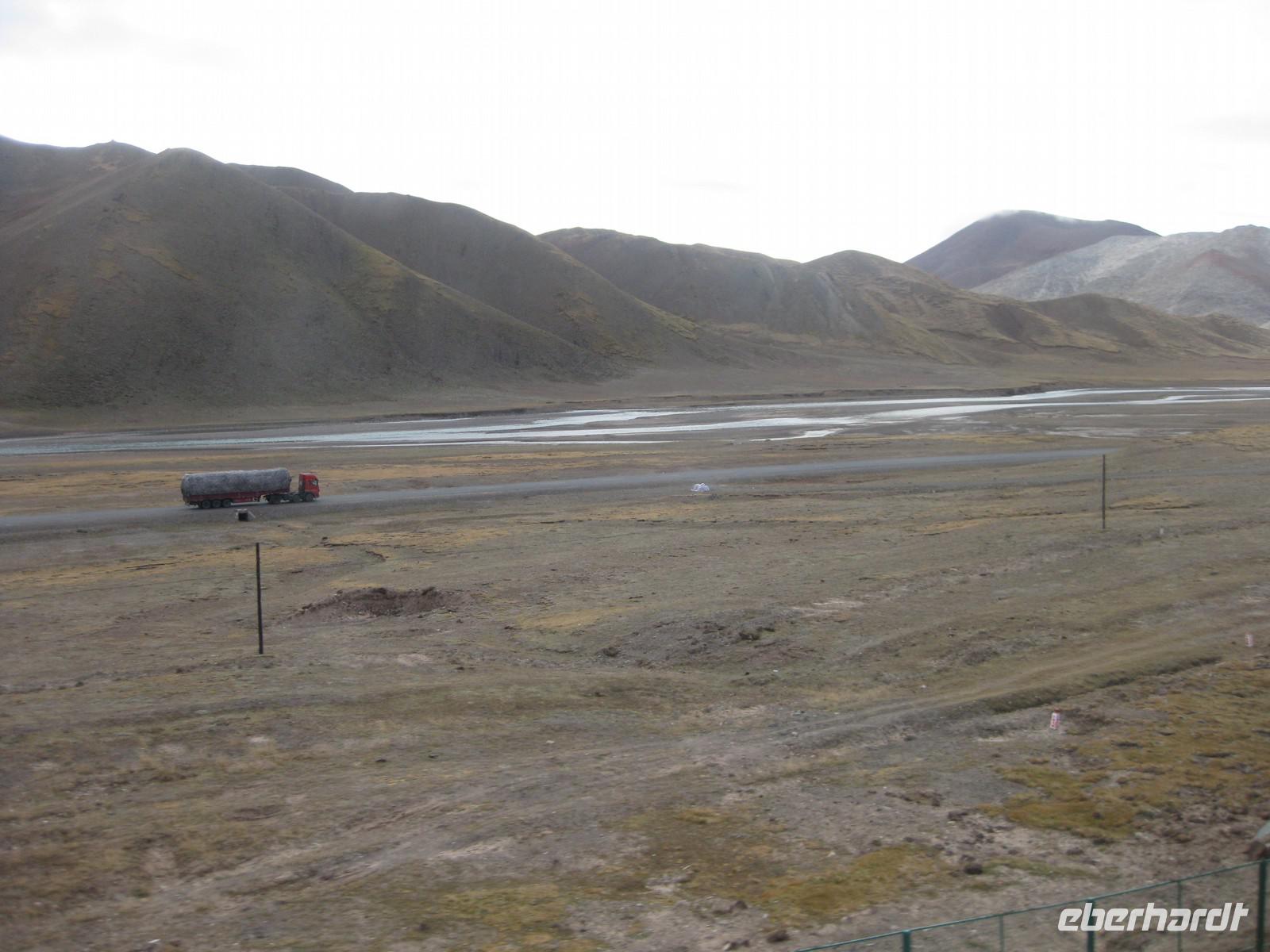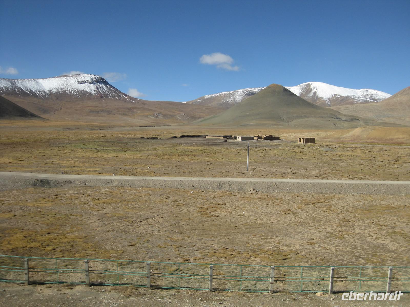 Draußen zieht die Landschaft vorbei, eine karge, sehr schöne Steppenlandschaft mit Gebirgen und Flüssen. Parallel zur Eisenbahnstrecke befindet sich eine Straße, auf der die Überlandroute entlang führt. Bäume und Sträucher wachsen hier längst nicht mehr, denn wir haben inzwischen schon eine Höhe von über 4.500 m erreicht. Die Erde ist nur noch mit Moos bedeckt. Das Wetter ist sehr schön, Sonnenschein und blauer Himmel. So können wir alles richtig genießen.