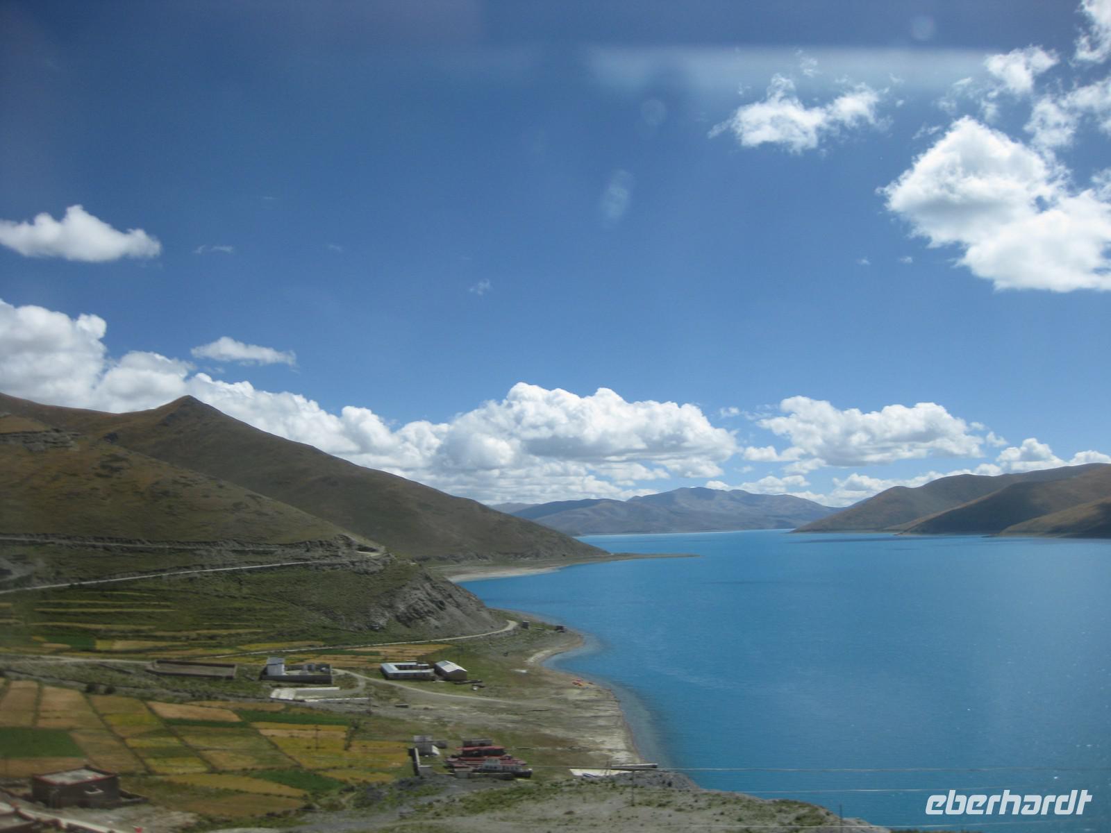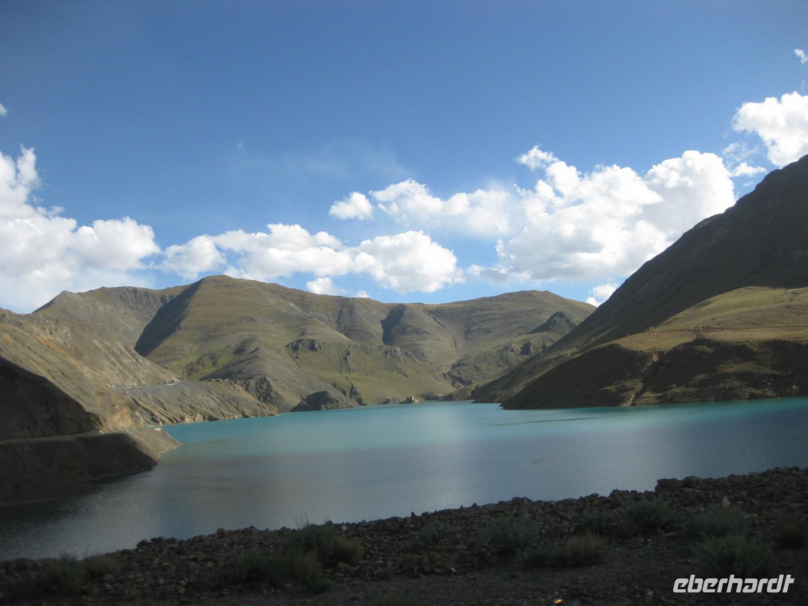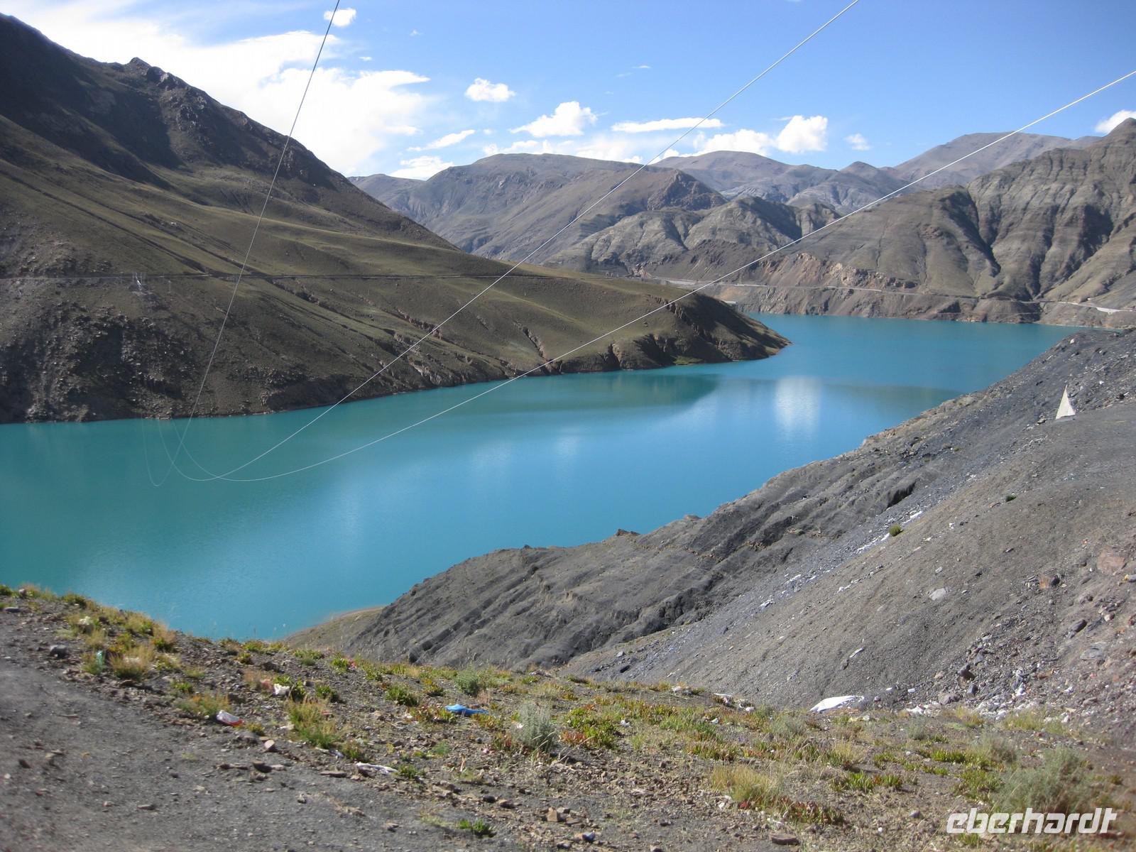 Dann fahren wir auf der Pass-Straße weiter in Richtung Gyantse. Nun geht es etwas abwärts. Unterwegs halten wir noch an einem Stausee. Dieser ist wunderbar eingebettet in die ihn umgebende Gebirgswelt. Und das Wasser strahlt uns wieder ganz blau entgegen. Auf dem Parkplatz sind natürlich auch die Händler da. Wer bis jetzt noch keine Gebetsmühle als Souvenir (Pflichtsouvenir) mitgenommen hat, der kauft hier doch noch eine.