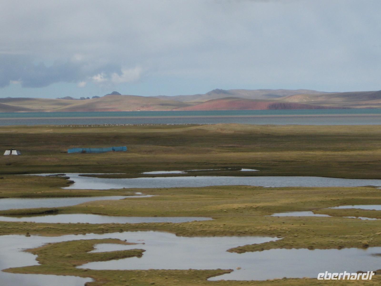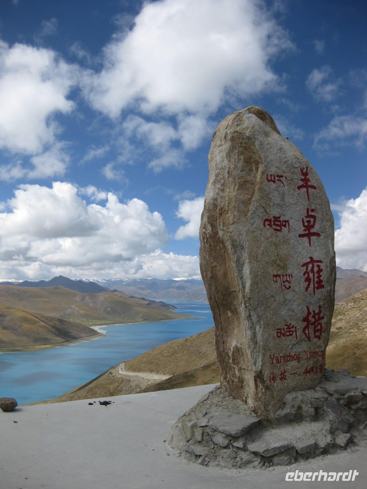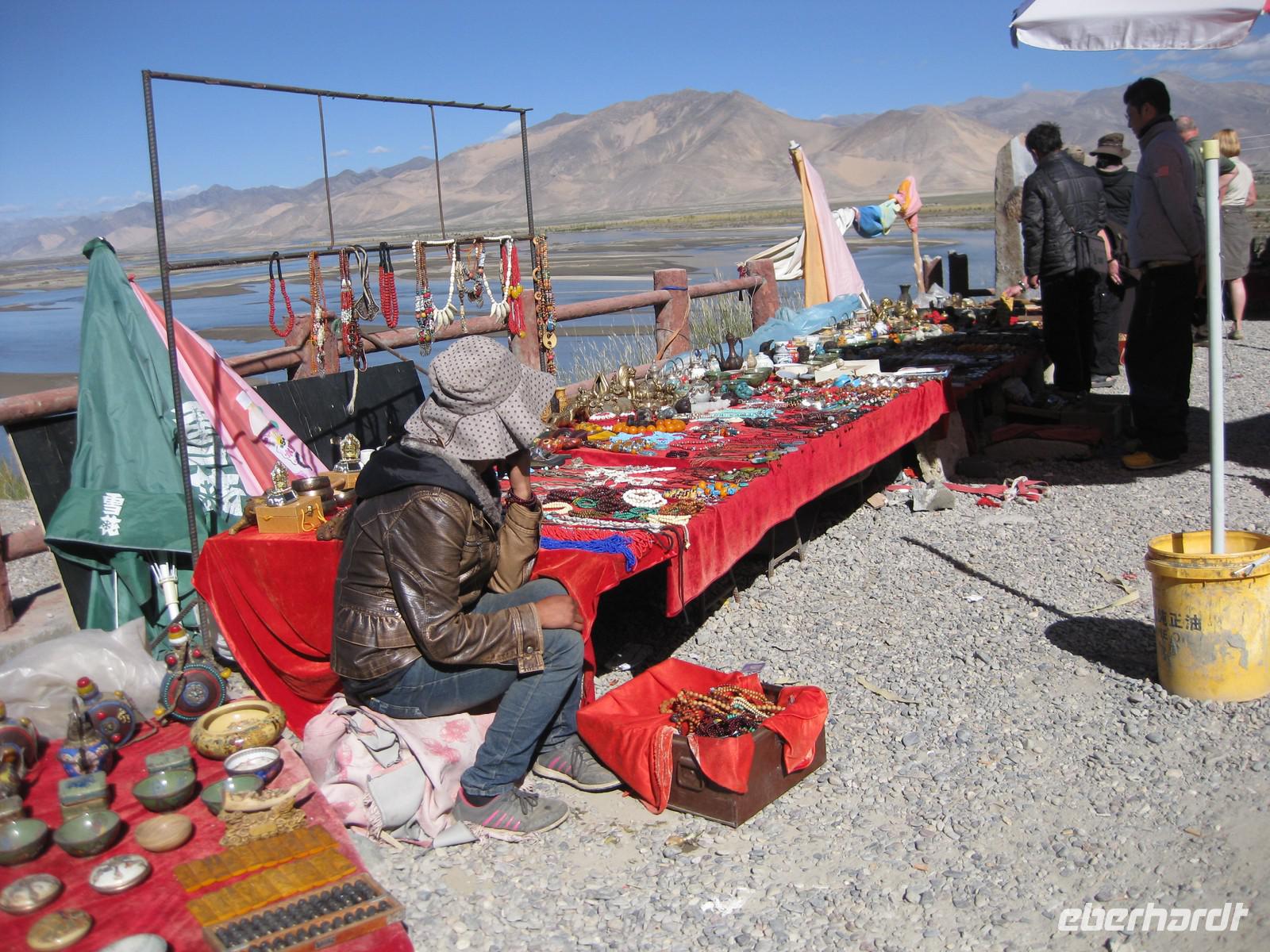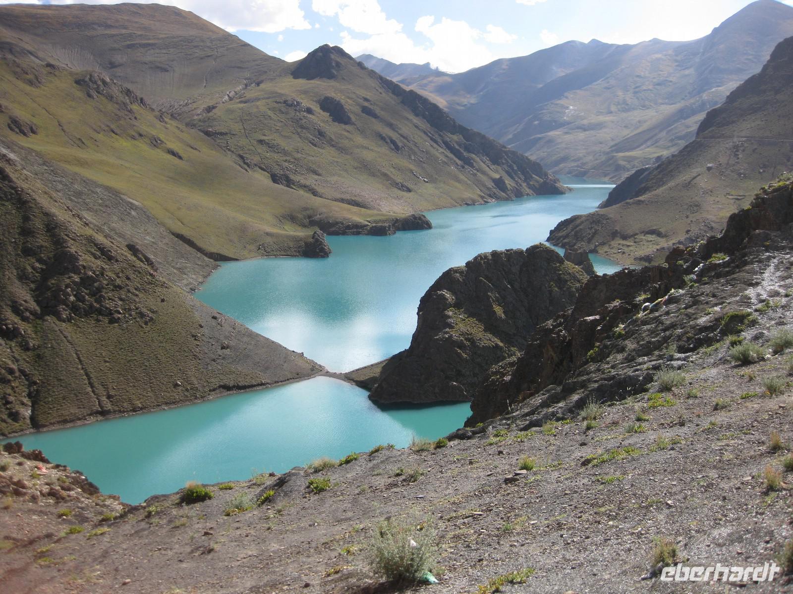 Dann fahren wir auf der Pass-Straße weiter in Richtung Gyantse. Nun geht es etwas abwärts. Unterwegs halten wir noch an einem Stausee. Dieser ist wunderbar eingebettet in die ihn umgebende Gebirgswelt. Und das Wasser strahlt uns wieder ganz blau entgegen. Auf dem Parkplatz sind natürlich auch die Händler da. Wer bis jetzt noch keine Gebetsmühle als Souvenir (Pflichtsouvenir) mitgenommen hat, der kauft hier doch noch eine.