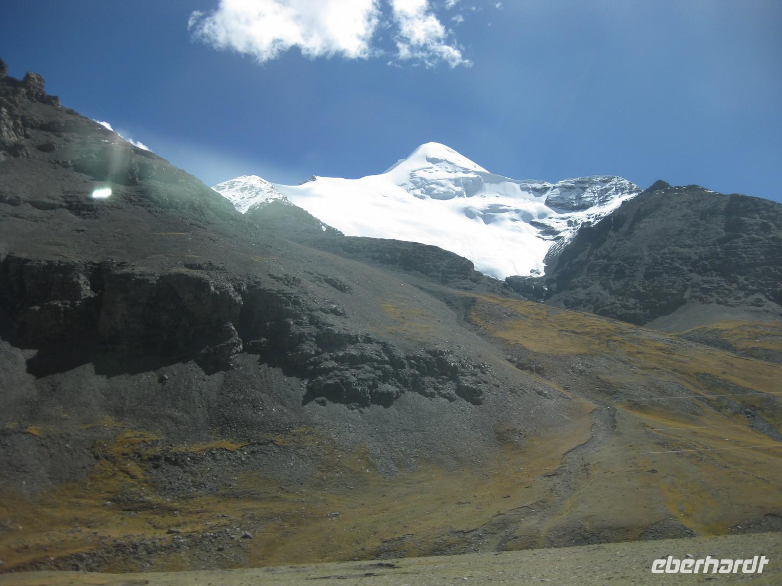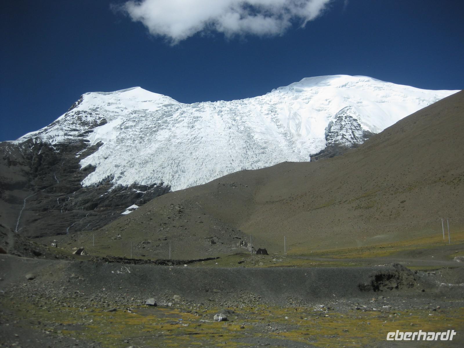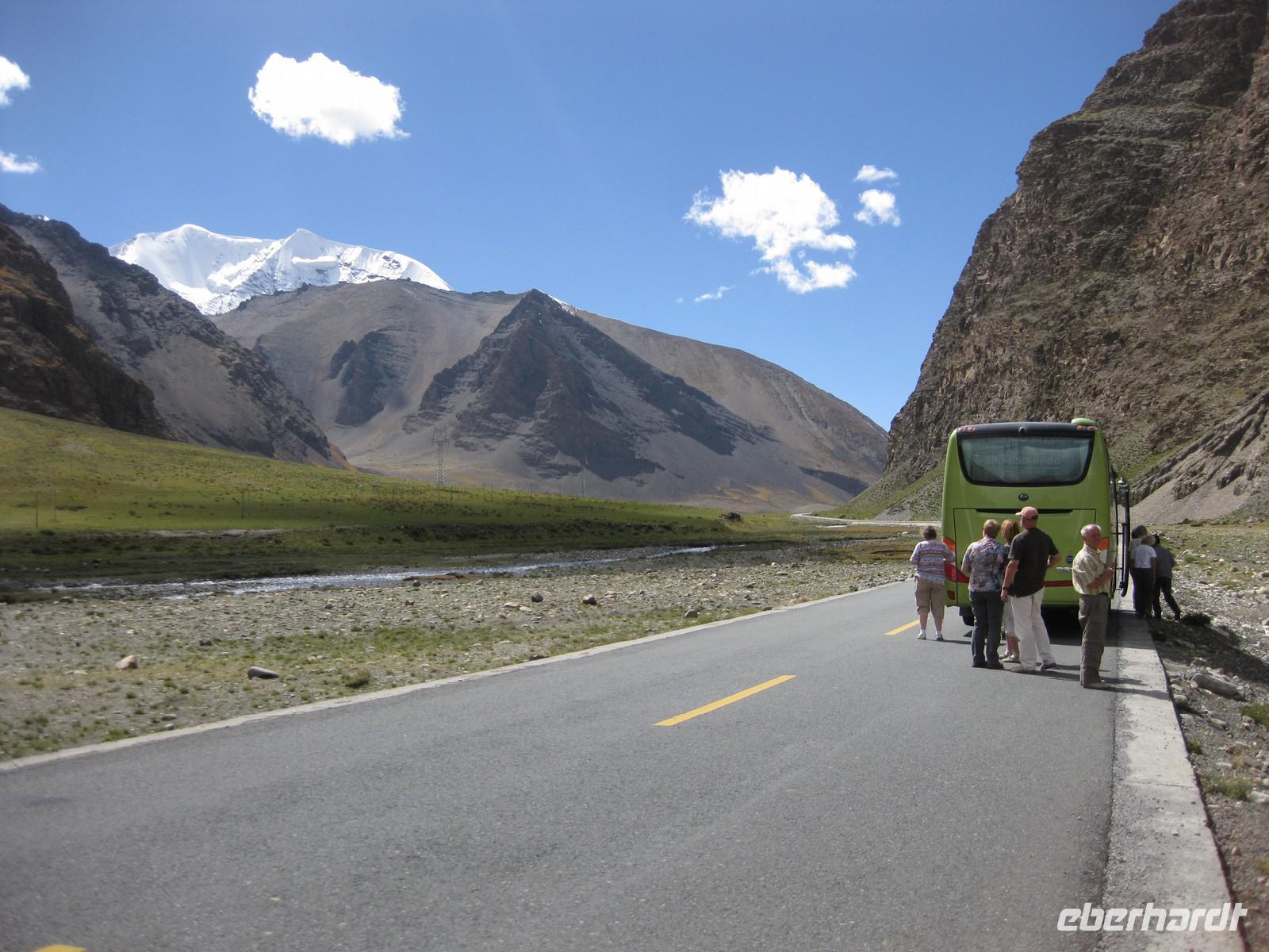 Nach längerer Fahrt am Ufer des Yamdrok Yutsho See entlang, fahren wir nun durch eine atemberaubende Landschaft zum Karo La Pass. Wir können die Gipfel der Sechstausender aus unmittelbarer Nähe bewundern. Vom Parkplatz des Karo La Passes (5.020 m) aus, dem "Höchstpunkt" unserer Reise, bietet sich ein atemberaubender Blick auf den Karo La Gletscher. Hier machen wir eine Pause, um diese einmalige Landschaft in Ruhe zu sehen. Man sieht hier auch die Auswirkungen der Klimaveränderung. Noch vor wenigen Jahren reichte der Gletscher bis zu uns hinunter auf die Straße.