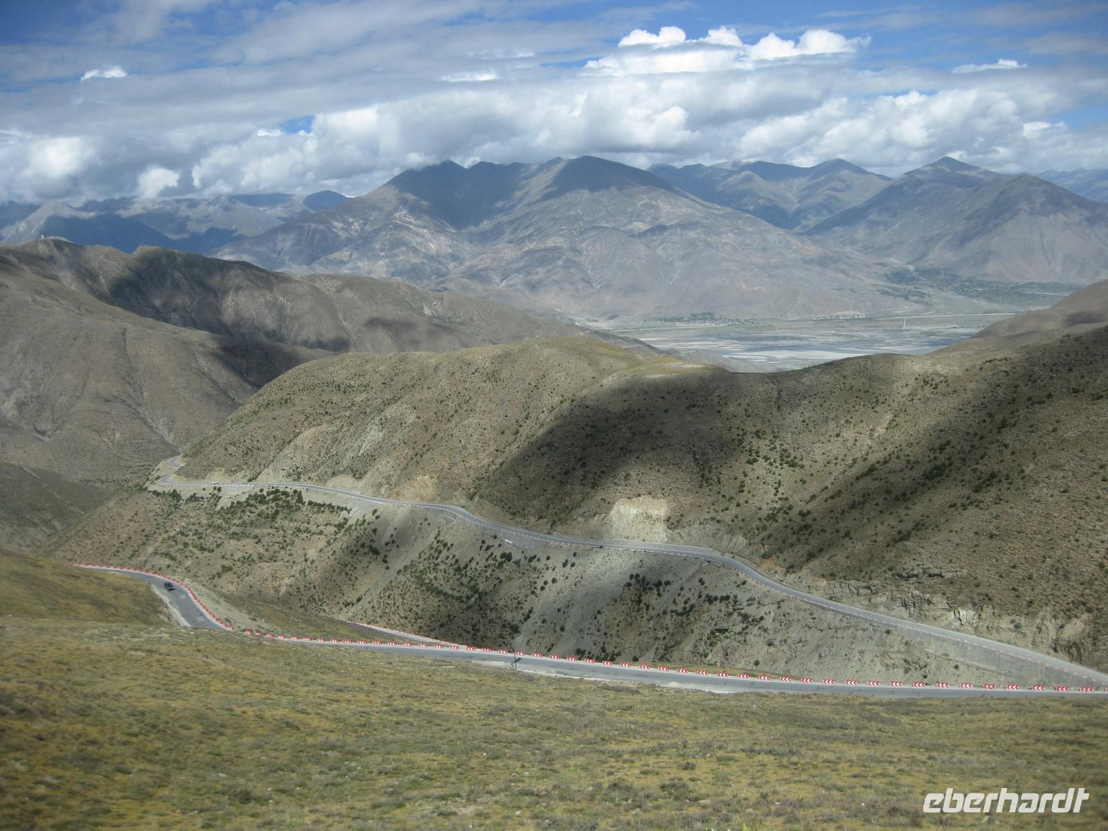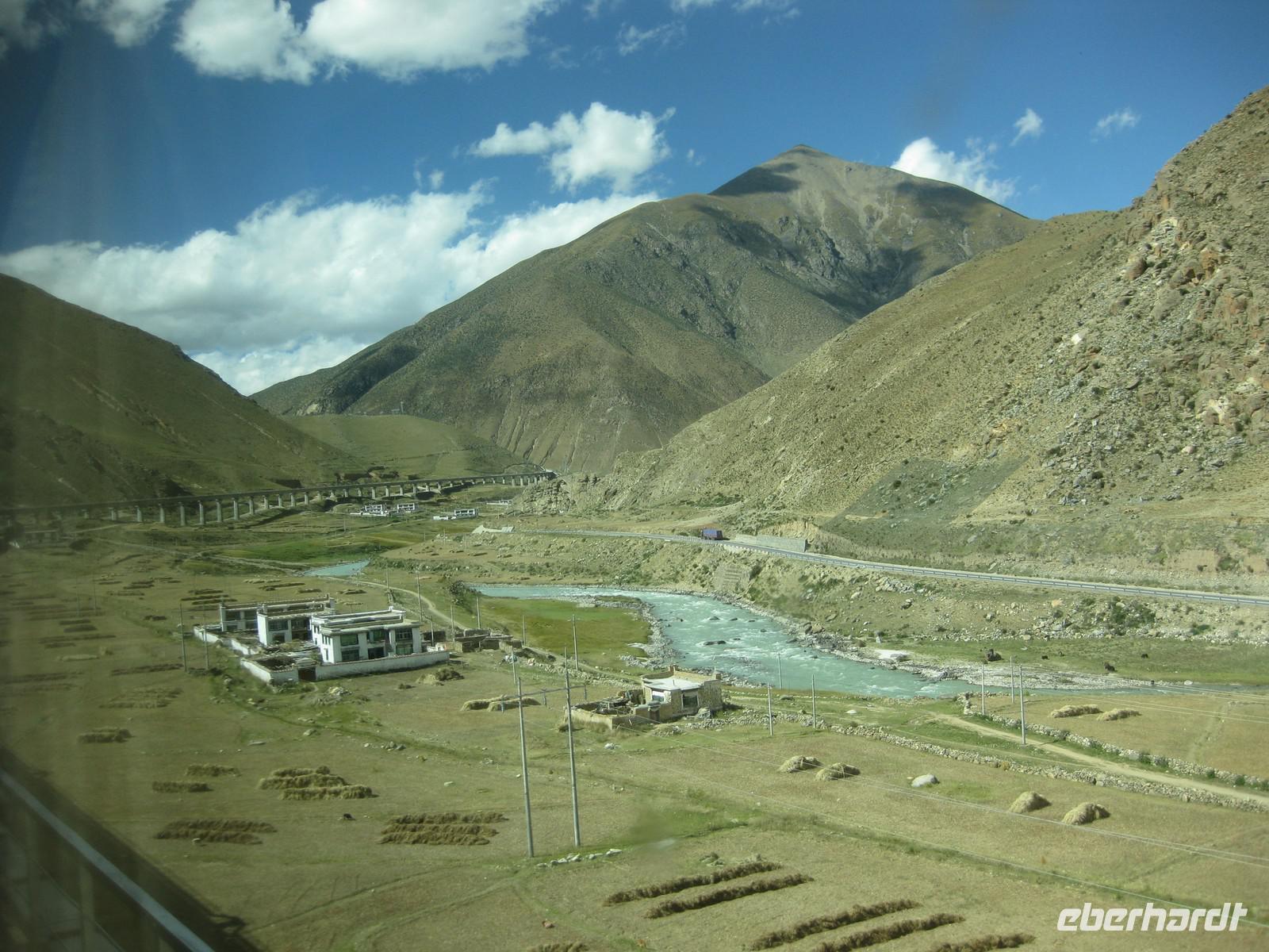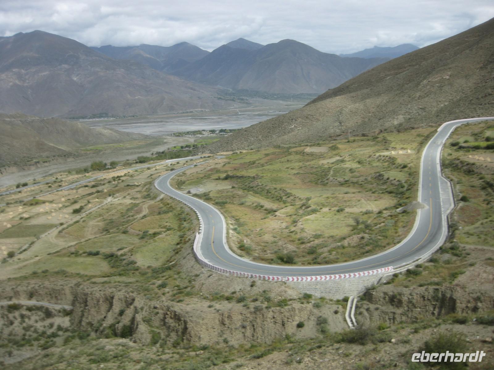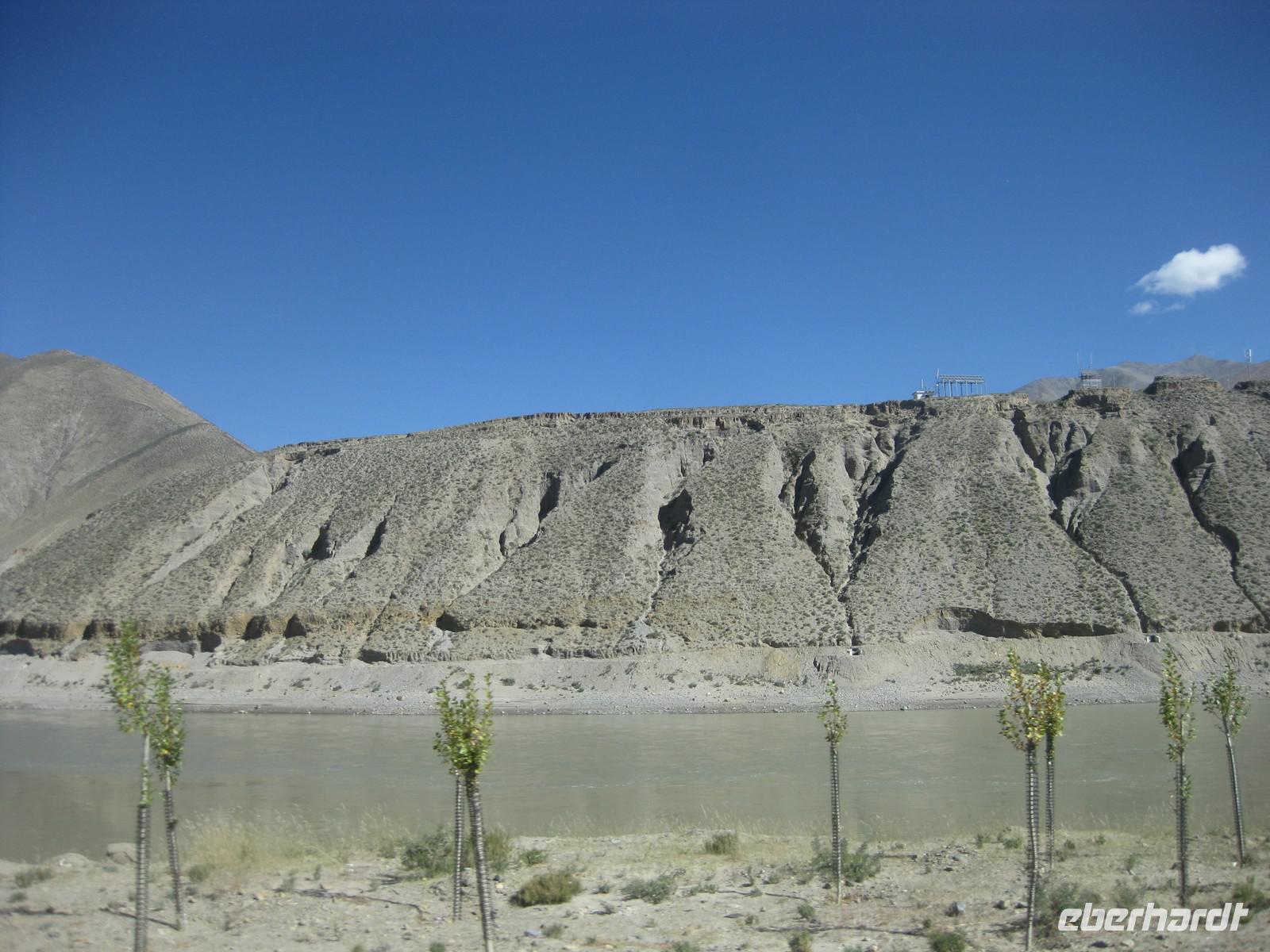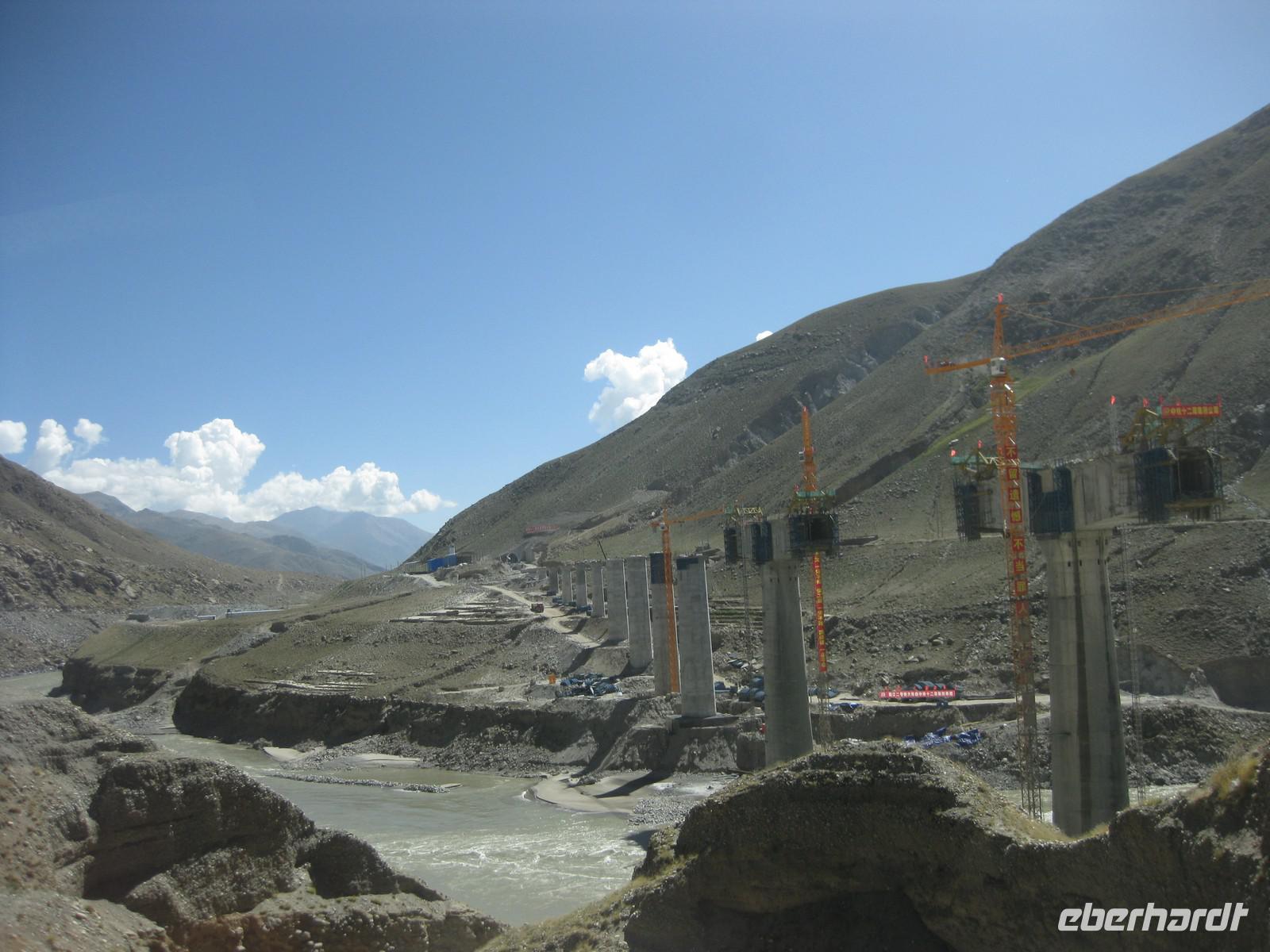 Weiter geht die Fahrt dann in Richtung Lhasa. Die Strecke bis Lhasa ist landschaftlich sehr interessant und auch abenteuerlich. Unmittelbar neben der Straße wir eine neue Eisenbahnstrecke gebaut. Wir können den Bau aus dem Bus heraus bis Lhasa verfolgen. Wir fahren fast die ganze Strecke bis Lhasa im Tal des Brahmaputra entlang. Zuerst ist es eine breite Flussebene und dann wird es eine richtige Schlucht. Links und rechts erheben sich hohe Berg- und Felswände, streckenweise befindet sich gleich neben der Straße der Abgrund zum Fluss hinunter. Auch die neue Eisenbahnstrecke wird durch diese Schlucht gebaut. Es sind dafür viele Tunnel notwendig. An besonders markanten Stellen machen wir Pausen und Fotostopps.