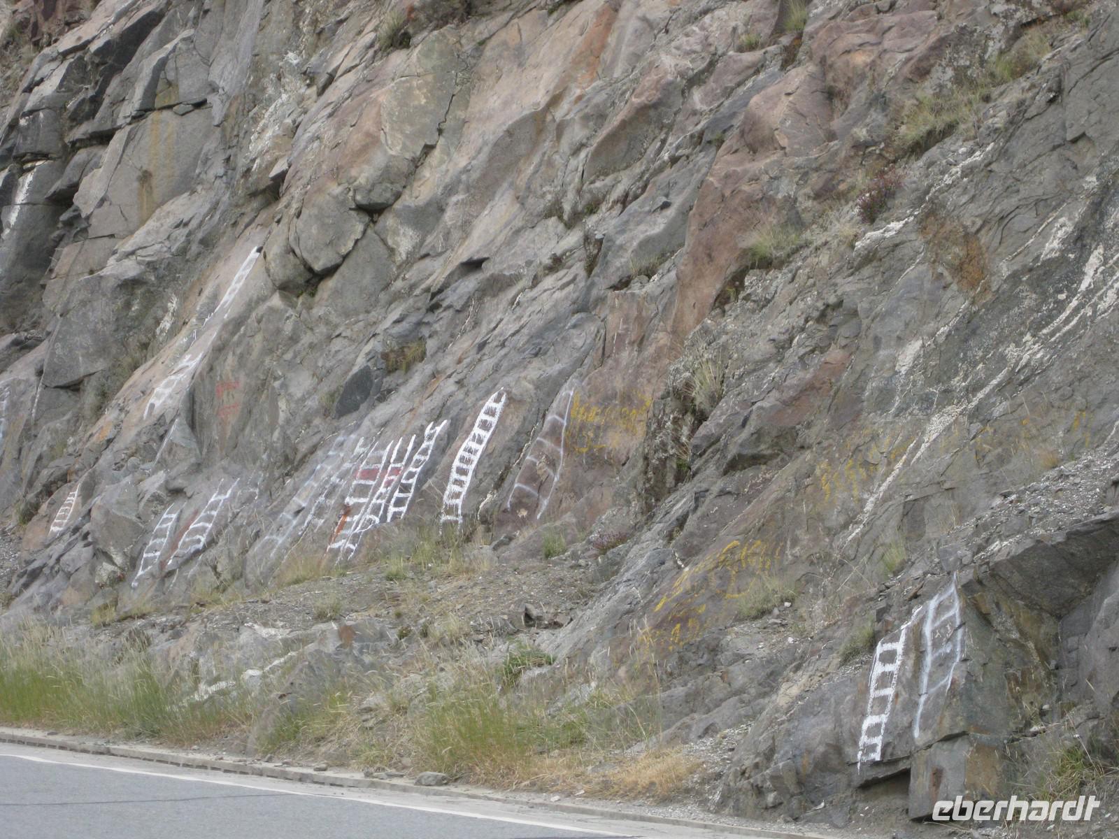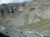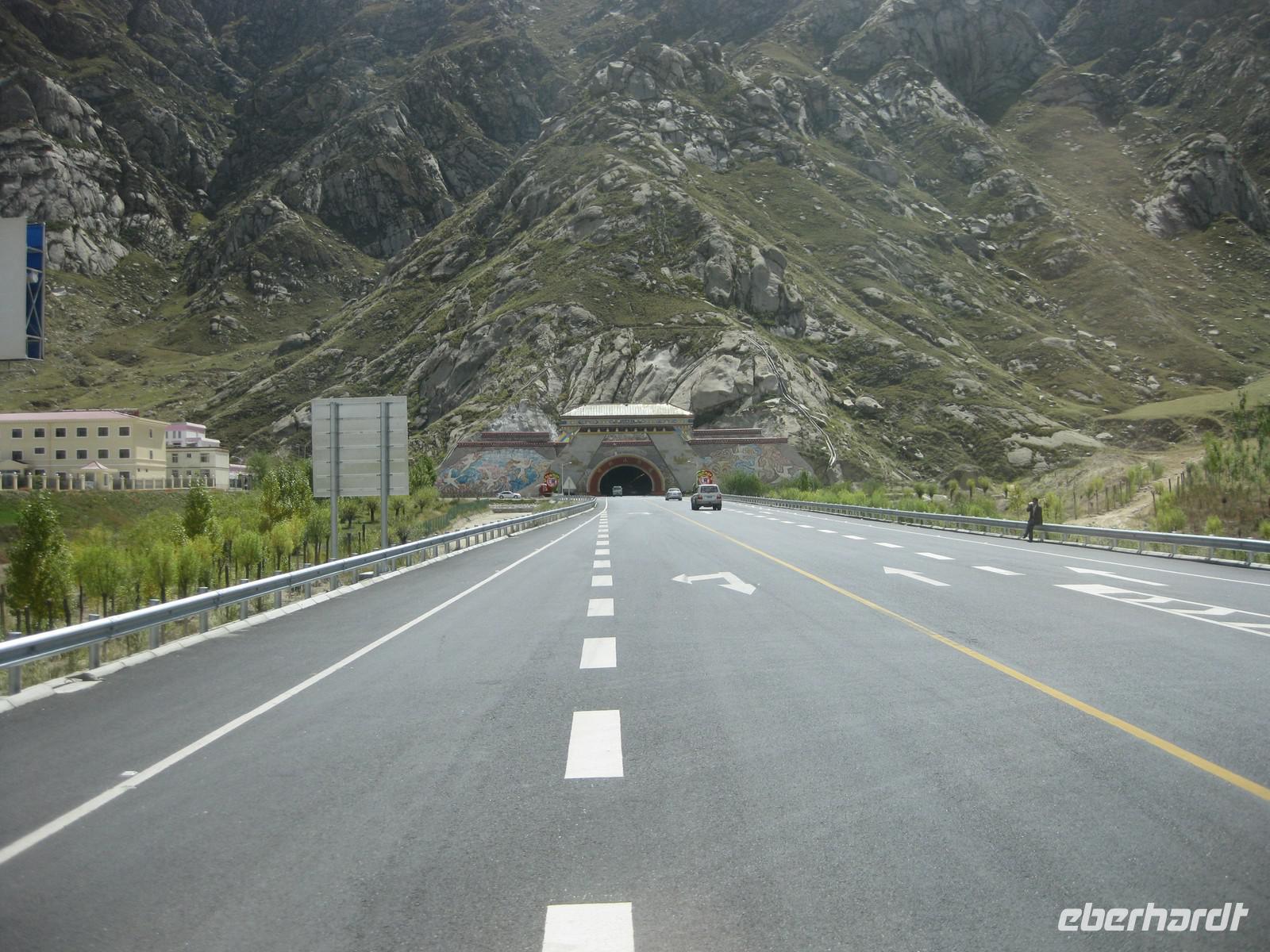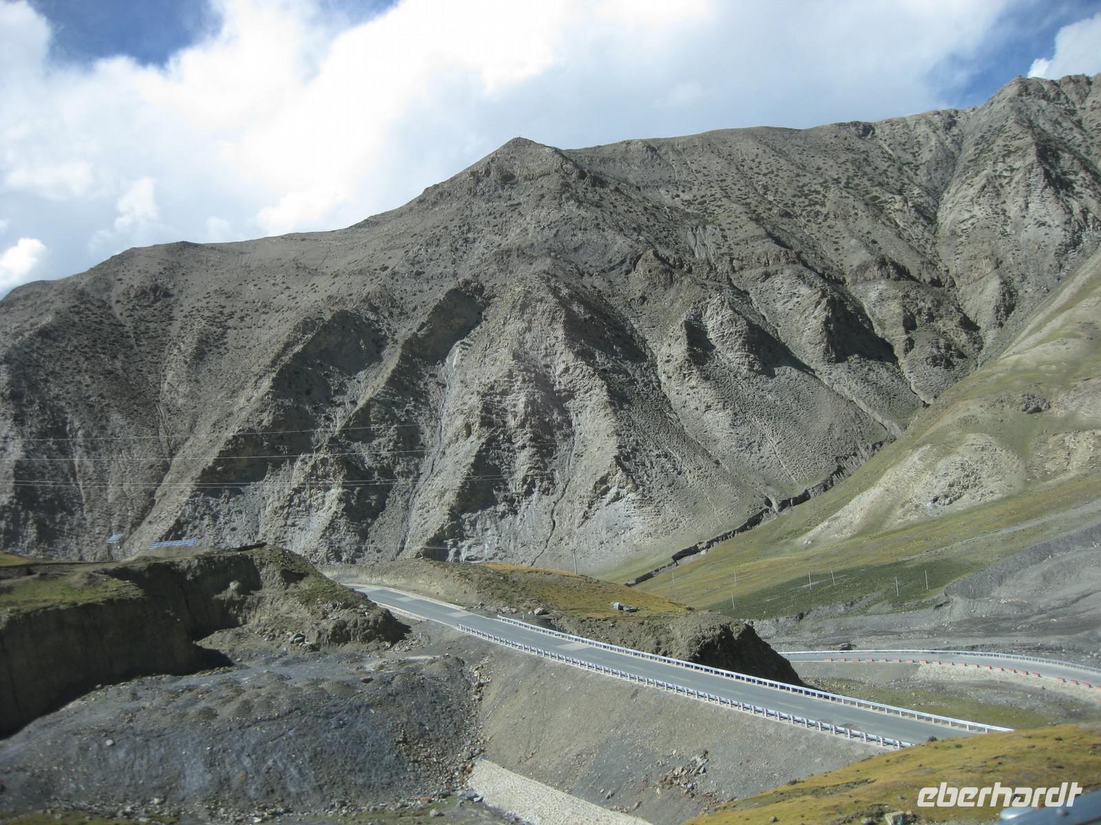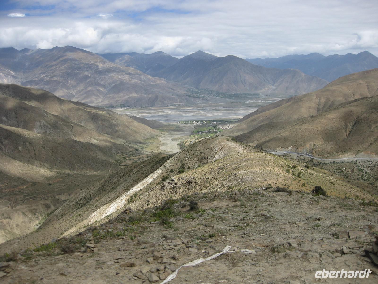 Weiter geht die Fahrt dann in Richtung Lhasa. Die Strecke bis Lhasa ist landschaftlich sehr interessant und auch abenteuerlich. Unmittelbar neben der Straße wir eine neue Eisenbahnstrecke gebaut. Wir können den Bau aus dem Bus heraus bis Lhasa verfolgen. Wir fahren fast die ganze Strecke bis Lhasa im Tal des Brahmaputra entlang. Zuerst ist es eine breite Flussebene und dann wird es eine richtige Schlucht. Links und rechts erheben sich hohe Berg- und Felswände, streckenweise befindet sich gleich neben der Straße der Abgrund zum Fluss hinunter. Auch die neue Eisenbahnstrecke wird durch diese Schlucht gebaut. Es sind dafür viele Tunnel notwendig. An besonders markanten Stellen machen wir Pausen und Fotostopps.