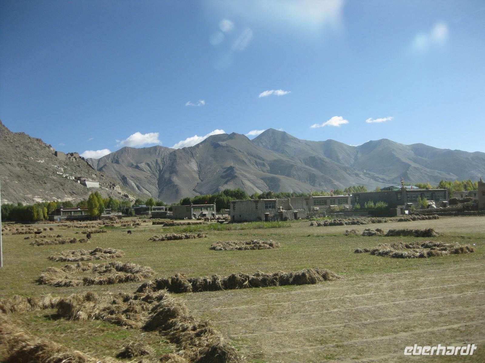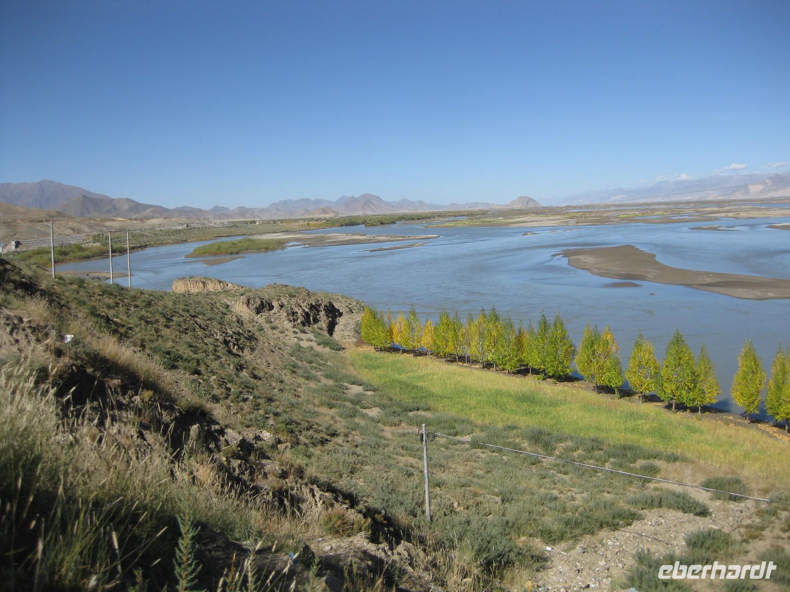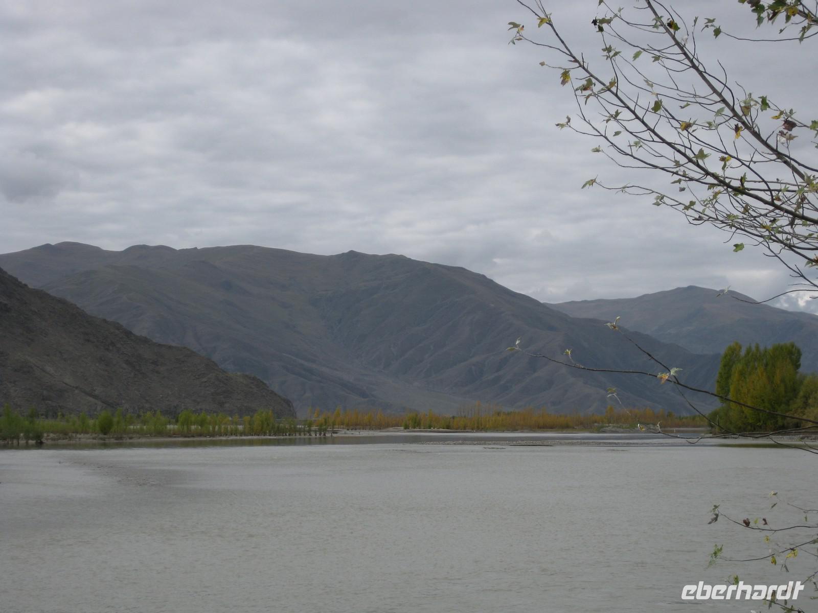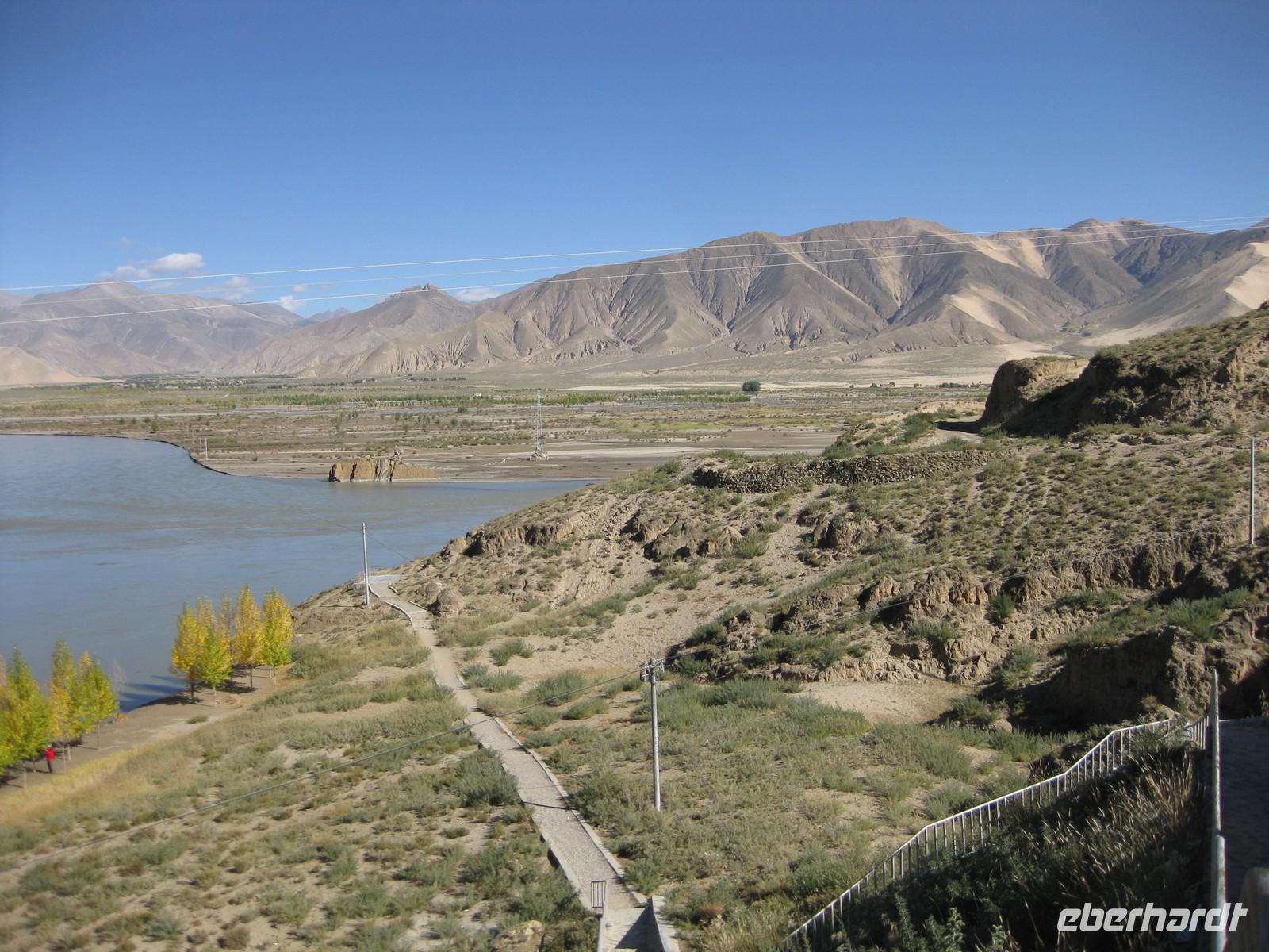 Nach dem Frühstück starten wir zu unserer Tour um 9.00 Uhr. Wir fahren auf der Landstraße entlang, weil die Strecke hier viel interessanter ist als die die Autobahn entlang führt. Wir fahren erst am Lhasa-Fluss und dann am Brahmaputra entlang. Wir passieren die an den Flüssen liegenden Dörfer und machen immer mal Fotostopps. Yang erzählt uns dazu vom Leben in Tibet. Die Fahrt ist sehr interessant.