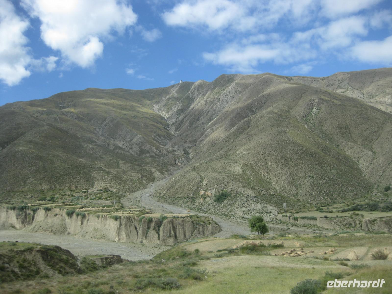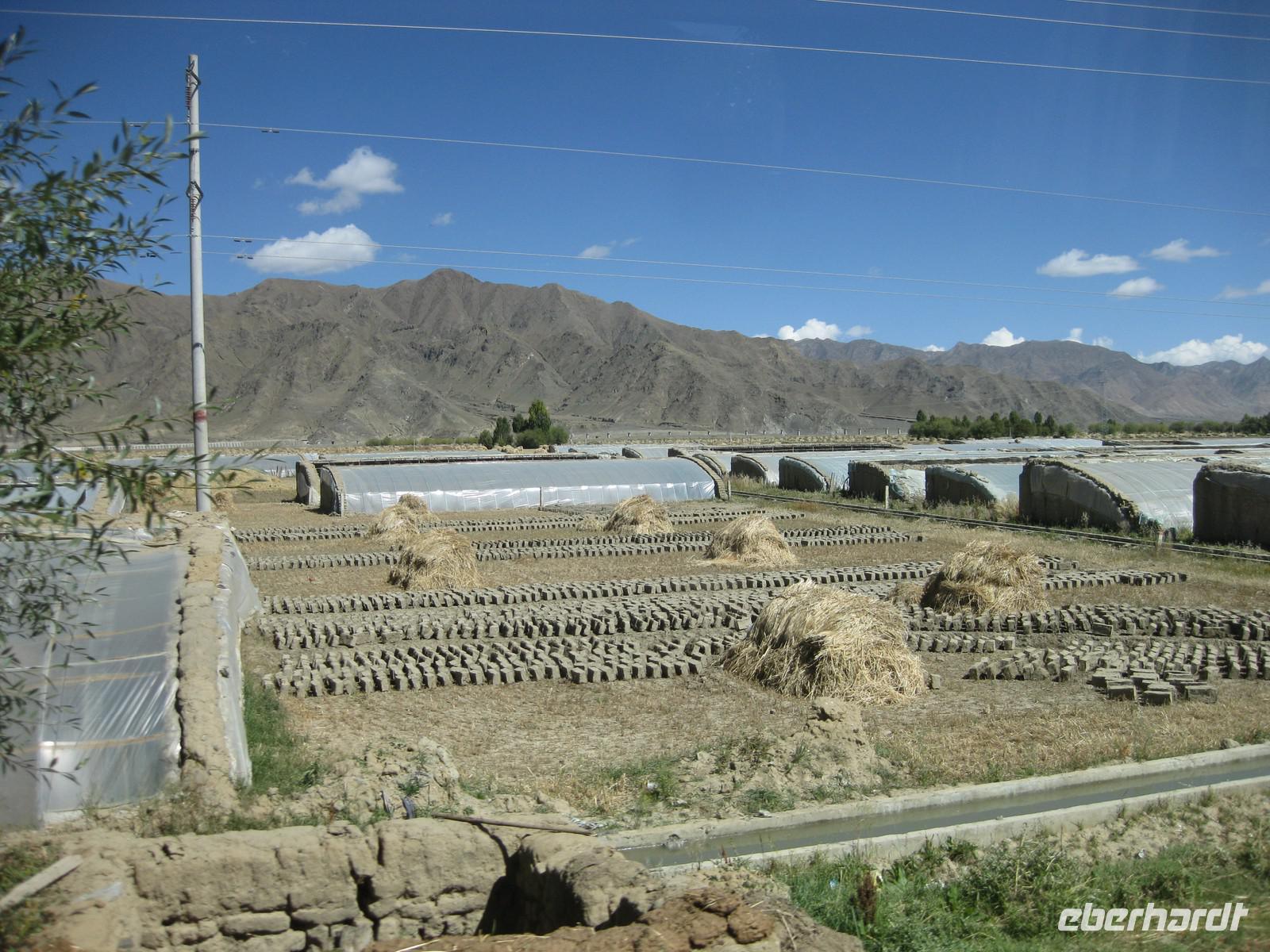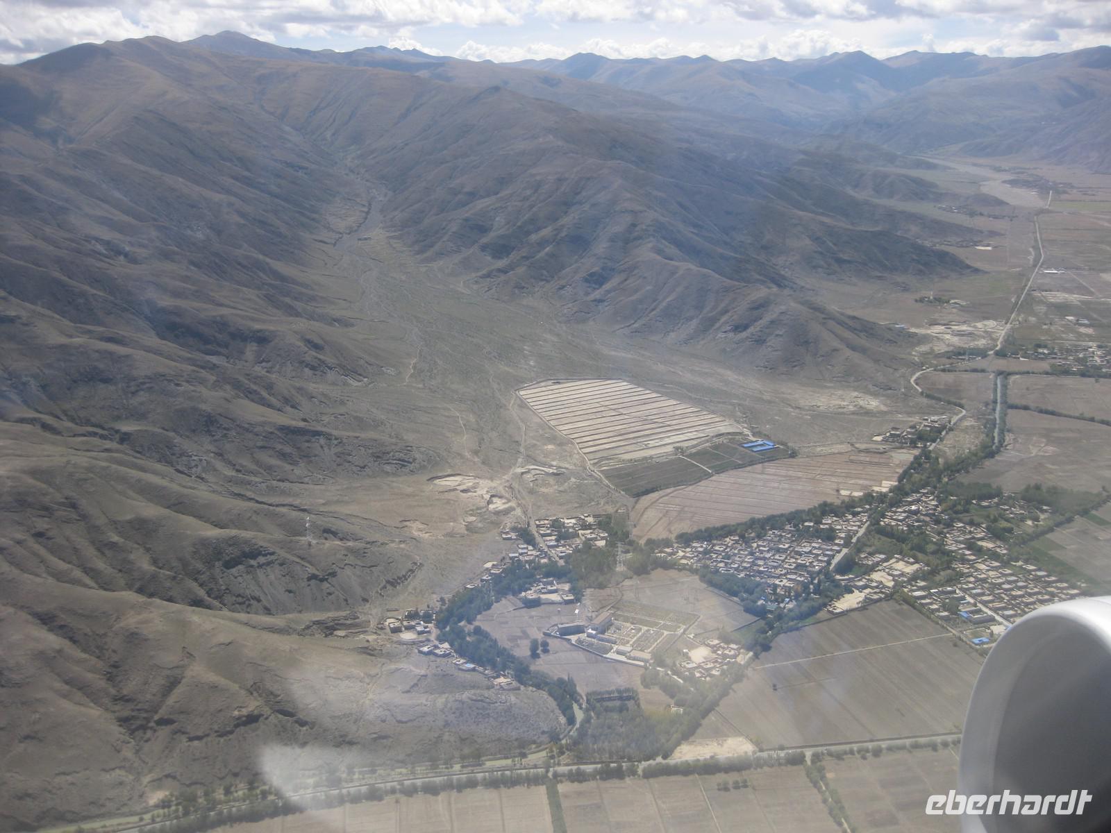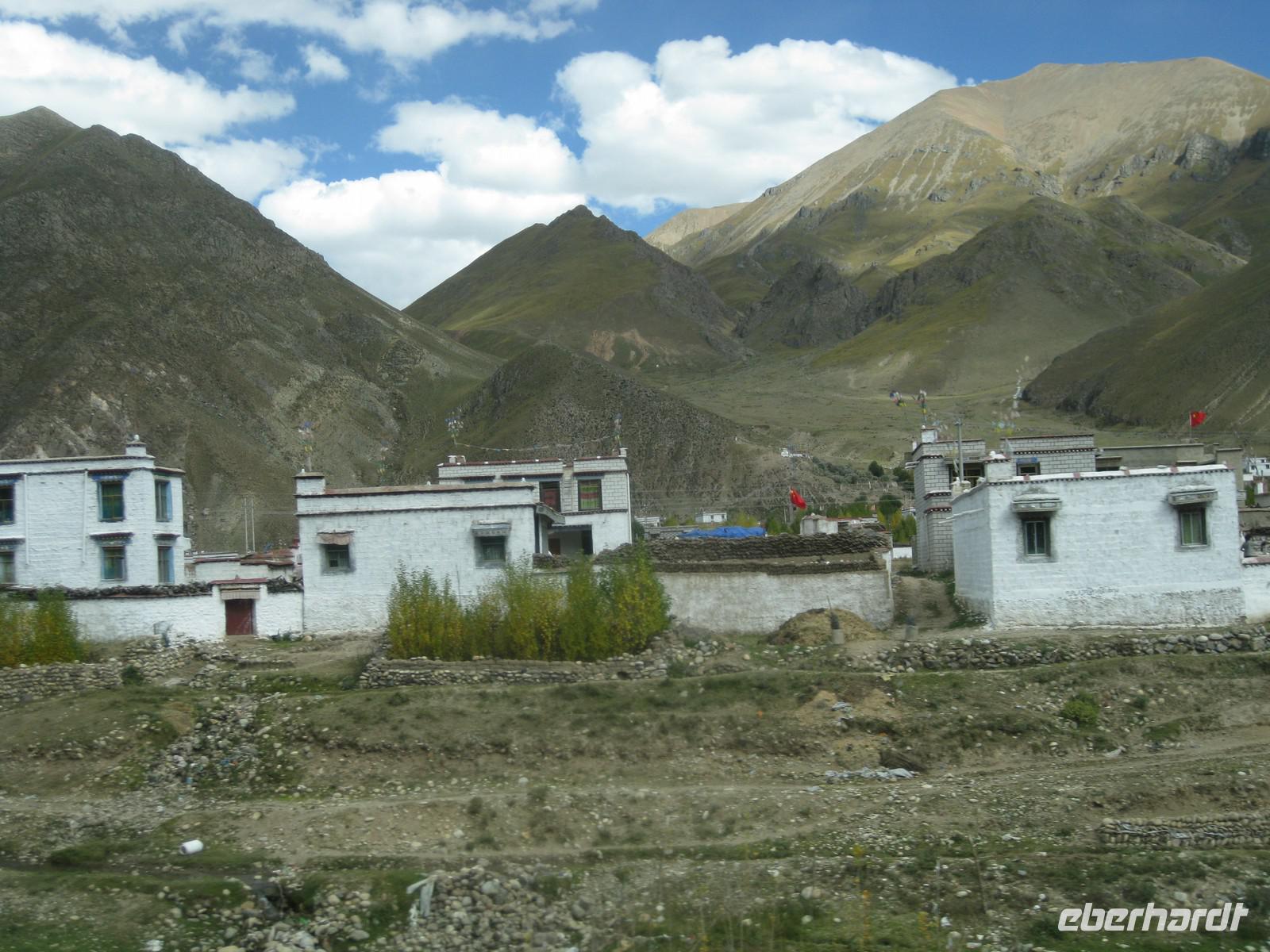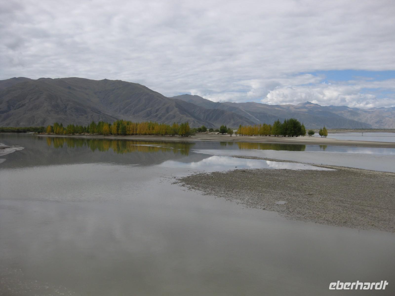 Nach dem Frühstück starten wir zu unserer Tour um 9.00 Uhr. Wir fahren auf der Landstraße entlang, weil die Strecke hier viel interessanter ist als die die Autobahn entlang führt. Wir fahren erst am Lhasa-Fluss und dann am Brahmaputra entlang. Wir passieren die an den Flüssen liegenden Dörfer und machen immer mal Fotostopps. Yang erzählt uns dazu vom Leben in Tibet. Die Fahrt ist sehr interessant.