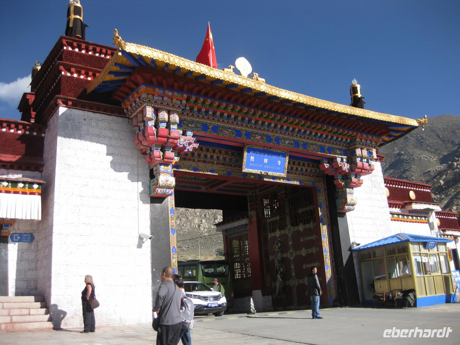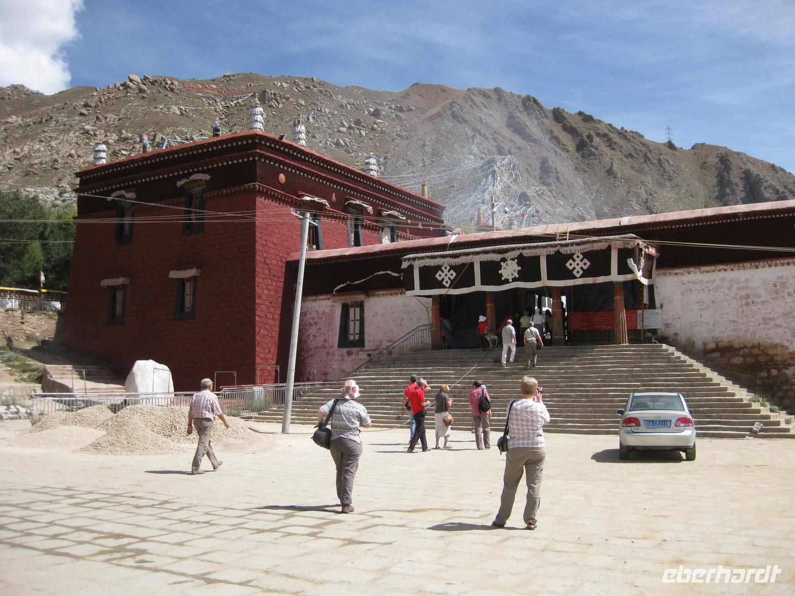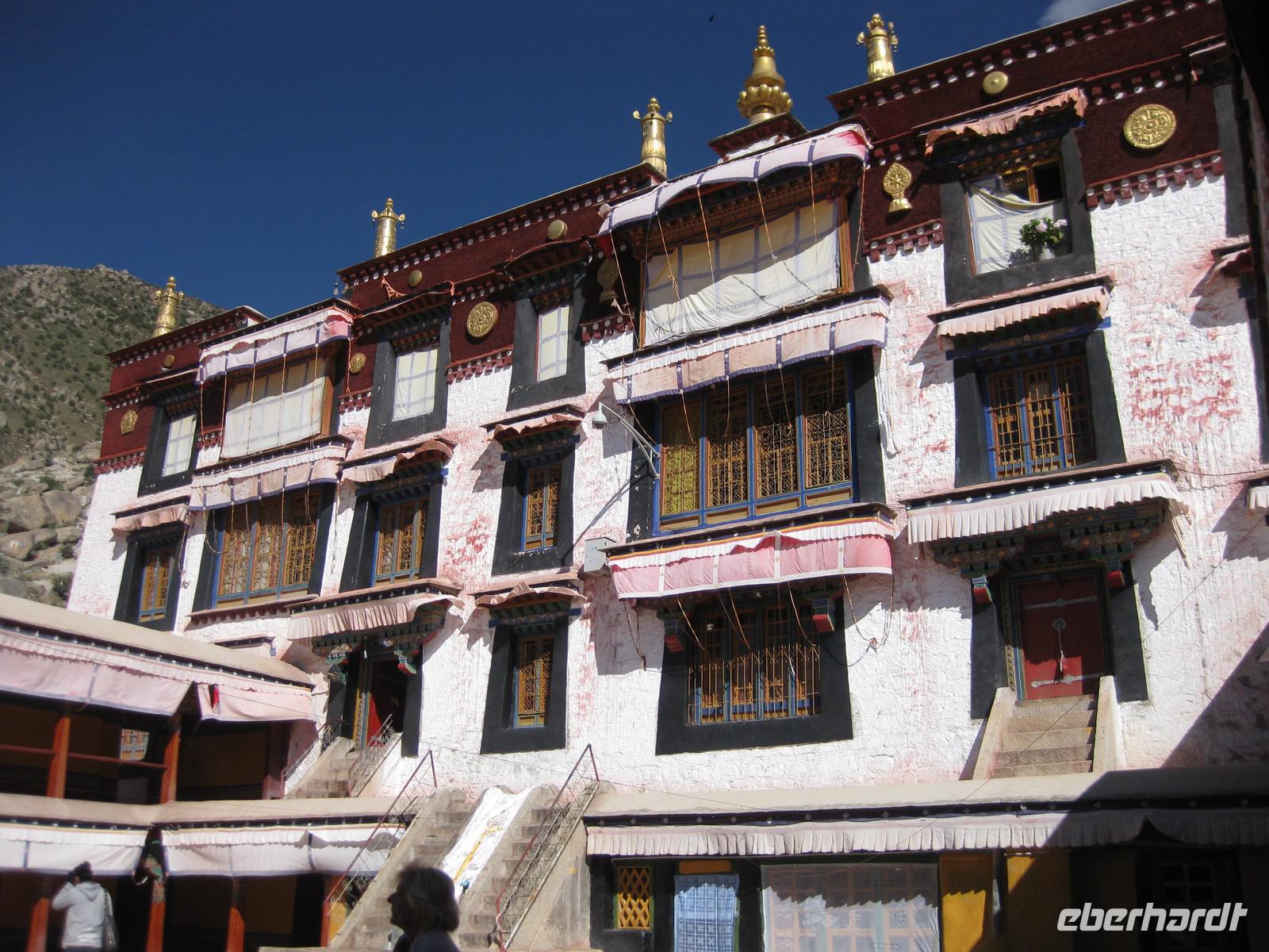 Nach dem Frühstück fahren wir um 9.00 Uhr mit dem Bus in westlicher Richtung durch die Stadt, am Potala-Palast vorbei, zum Drepung Kloster. Drepung wurde im 15. Jh. gegründet. Es war die ehemalige Residenz der Dalai Lamas und damit auch das politische Zentrum. In Drepung studierten früher 10.000 Mönche an drei Fakultäten. Yang führt uns durch das Kloster. Sie gibt uns umfangreiche Erklärungen in den einzelnen Gebäuden und Hallen und sie macht uns mit der Religion Tibets bekannt. Wir benötigen den ganzen Vormittag für die Besichtigung des Drepung Klosters. Auf der Rückfahrt in die Stadt besuchen wir noch das Kloster Nechung, in dem sich das tibetische Staatsorakel befindet. Dann fahren wir zum Hotel zurück und machen Mittagspause.