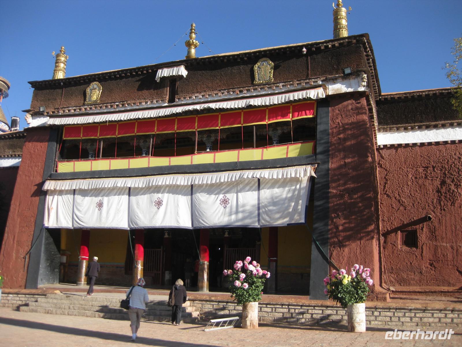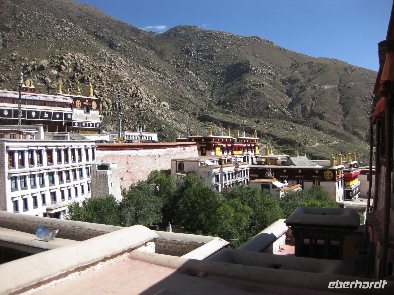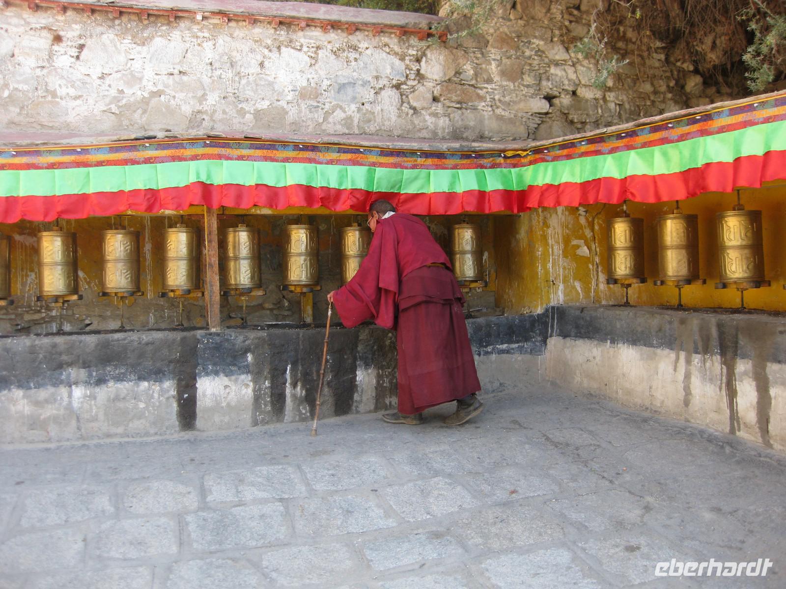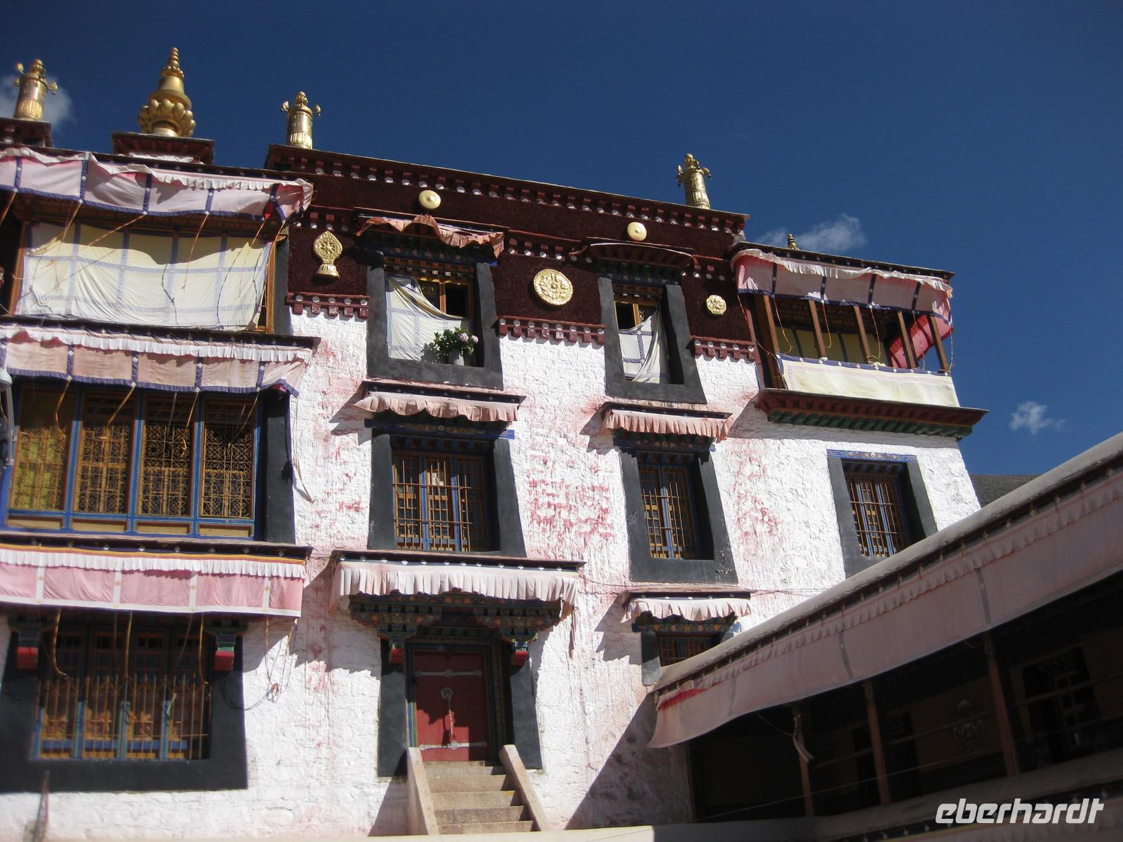 Nach dem Frühstück fahren wir um 9.00 Uhr mit dem Bus in westlicher Richtung durch die Stadt, am Potala-Palast vorbei, zum Drepung Kloster. Drepung wurde im 15. Jh. gegründet. Es war die ehemalige Residenz der Dalai Lamas und damit auch das politische Zentrum. In Drepung studierten früher 10.000 Mönche an drei Fakultäten. Yang führt uns durch das Kloster. Sie gibt uns umfangreiche Erklärungen in den einzelnen Gebäuden und Hallen und sie macht uns mit der Religion Tibets bekannt. Wir benötigen den ganzen Vormittag für die Besichtigung des Drepung Klosters. Auf der Rückfahrt in die Stadt besuchen wir noch das Kloster Nechung, in dem sich das tibetische Staatsorakel befindet. Dann fahren wir zum Hotel zurück und machen Mittagspause.