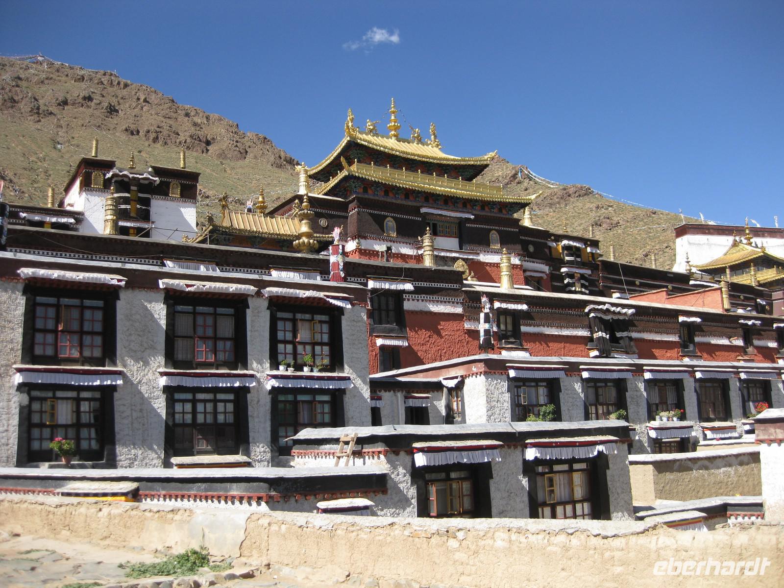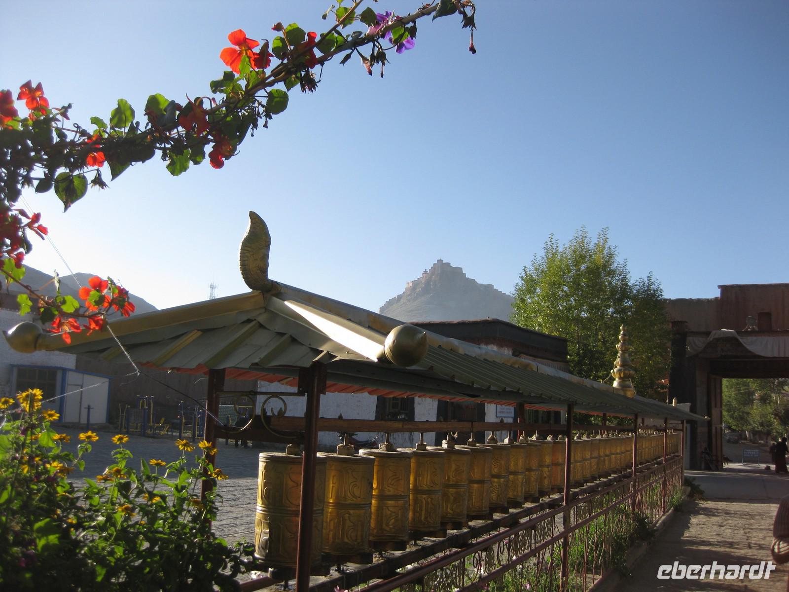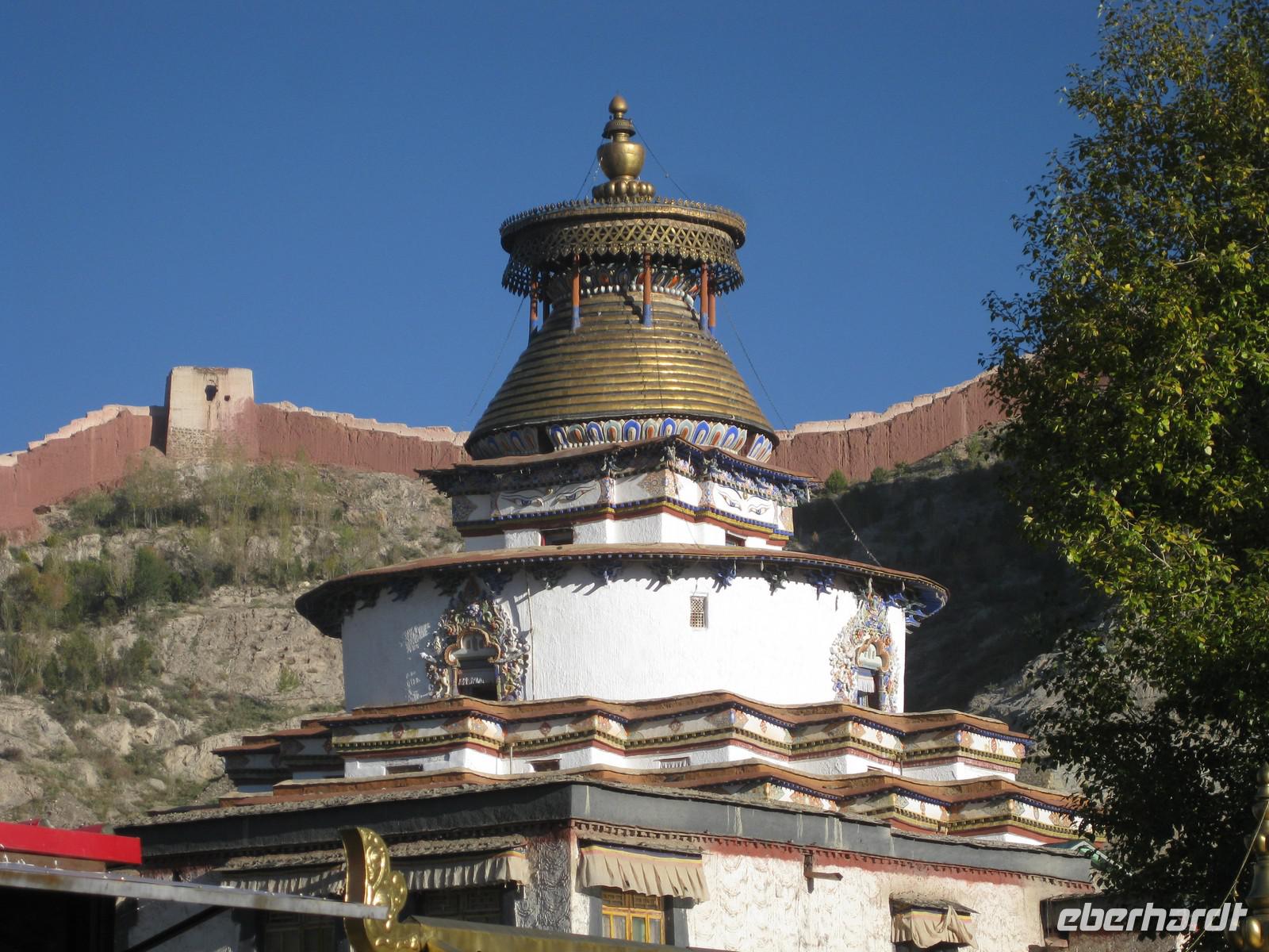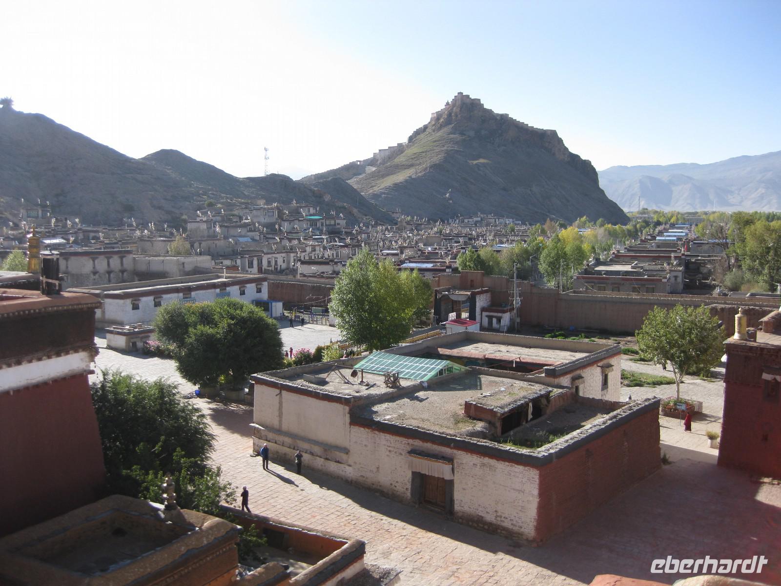 Nach dem Frühstück starten wir zur Besichtigung des Klosters Pälkhor Chöde in Gyantse. Wir sind wohl die Ersten am heutigen Tag. Das Pälkhor Chöde wurde auch im 15. Jh. gegründet und es bildete das kultische Zentrum. Es besitzt eine große Versammlungshalle, in der auch aus Holz hergestellte ausdrucksvolle Statuen untergebracht sind. Desweiteren befindet sich auf dem Gelände des Pälkhor Chöde Klosters der einzige heute noch existierende begehbare Reliquienschrein, als "Kumbum" bekannt. Wir können den "Kumbum" besteigen und so die Malereien und die Statuen ganz aus der Nähe betrachten. Von oben bietet sich ein faszinierender Blick auf das Kloster und die Altstadt von Gyantse. Anschließend machen wir noch einen Spaziergang durch die Altstadt.