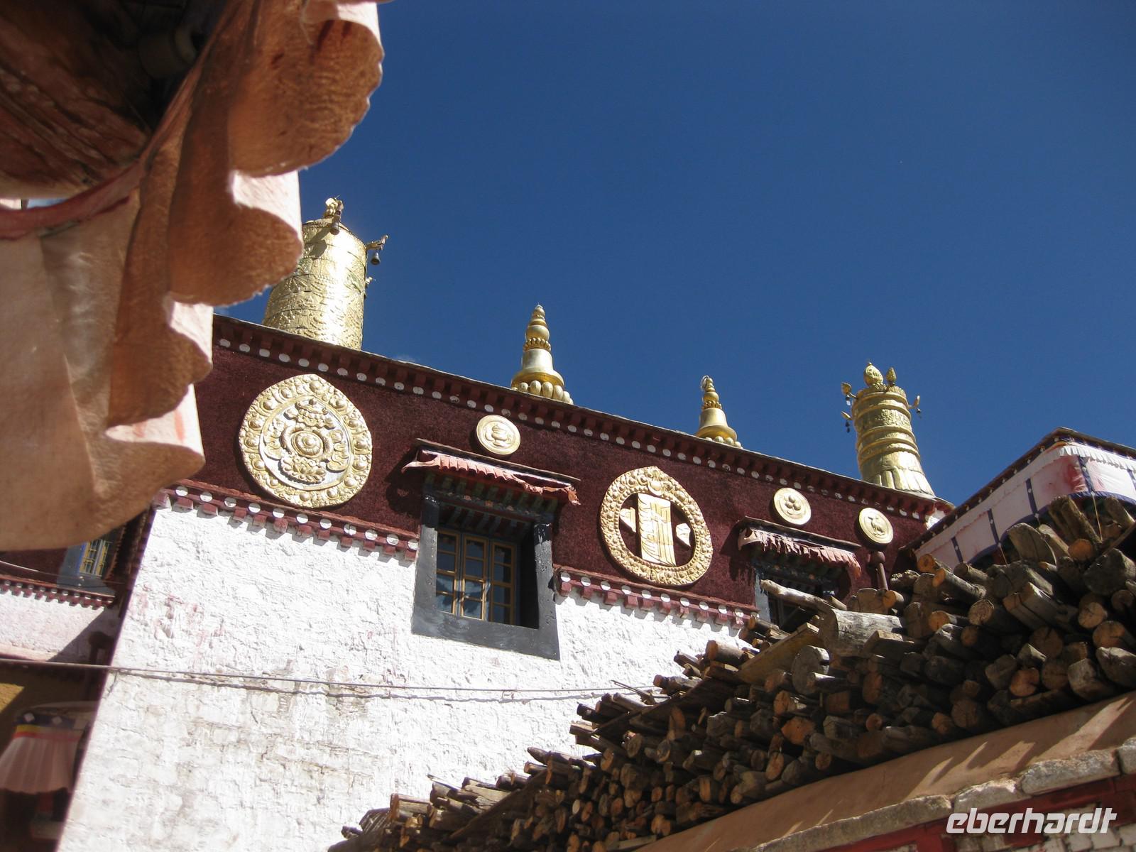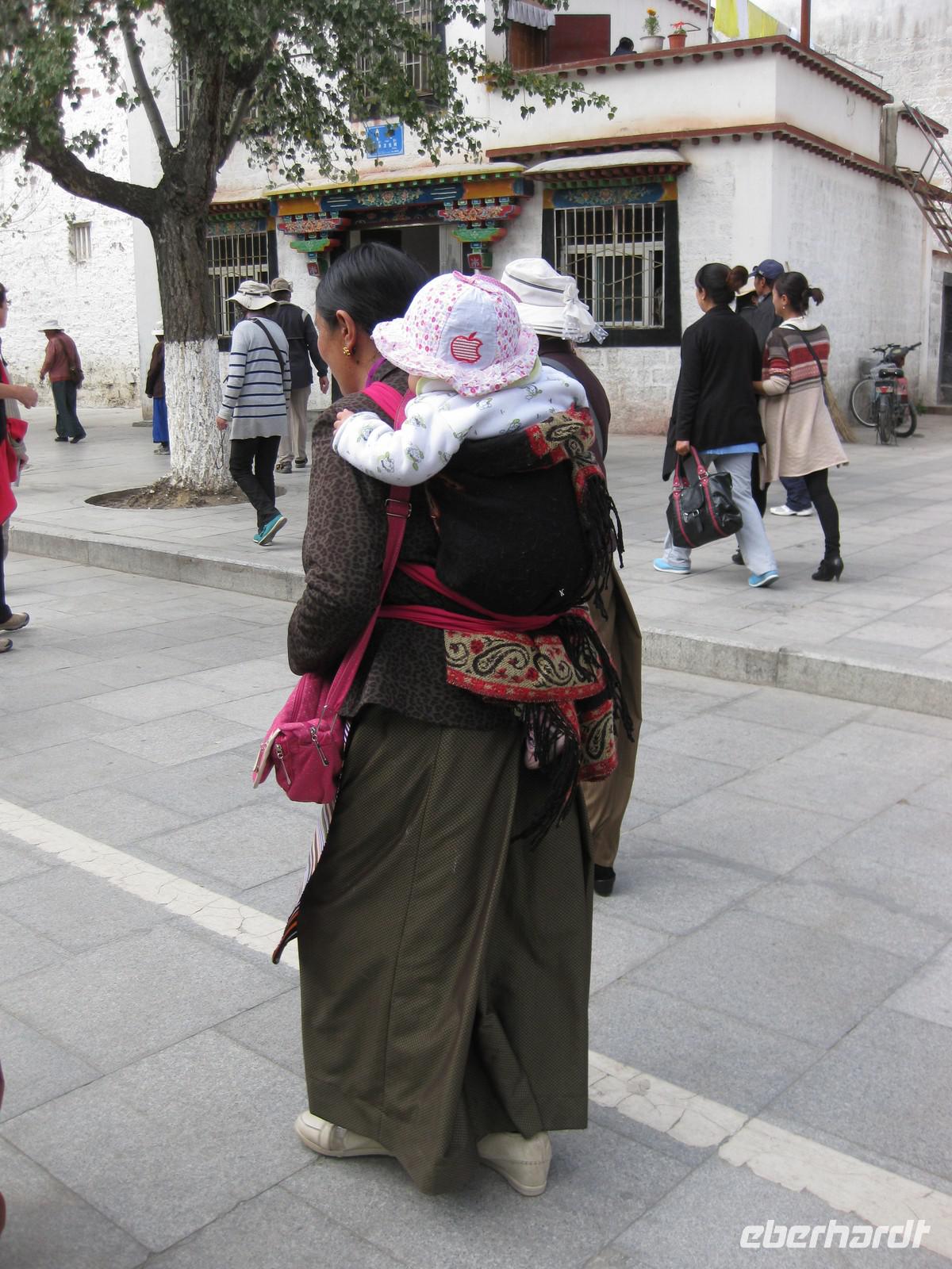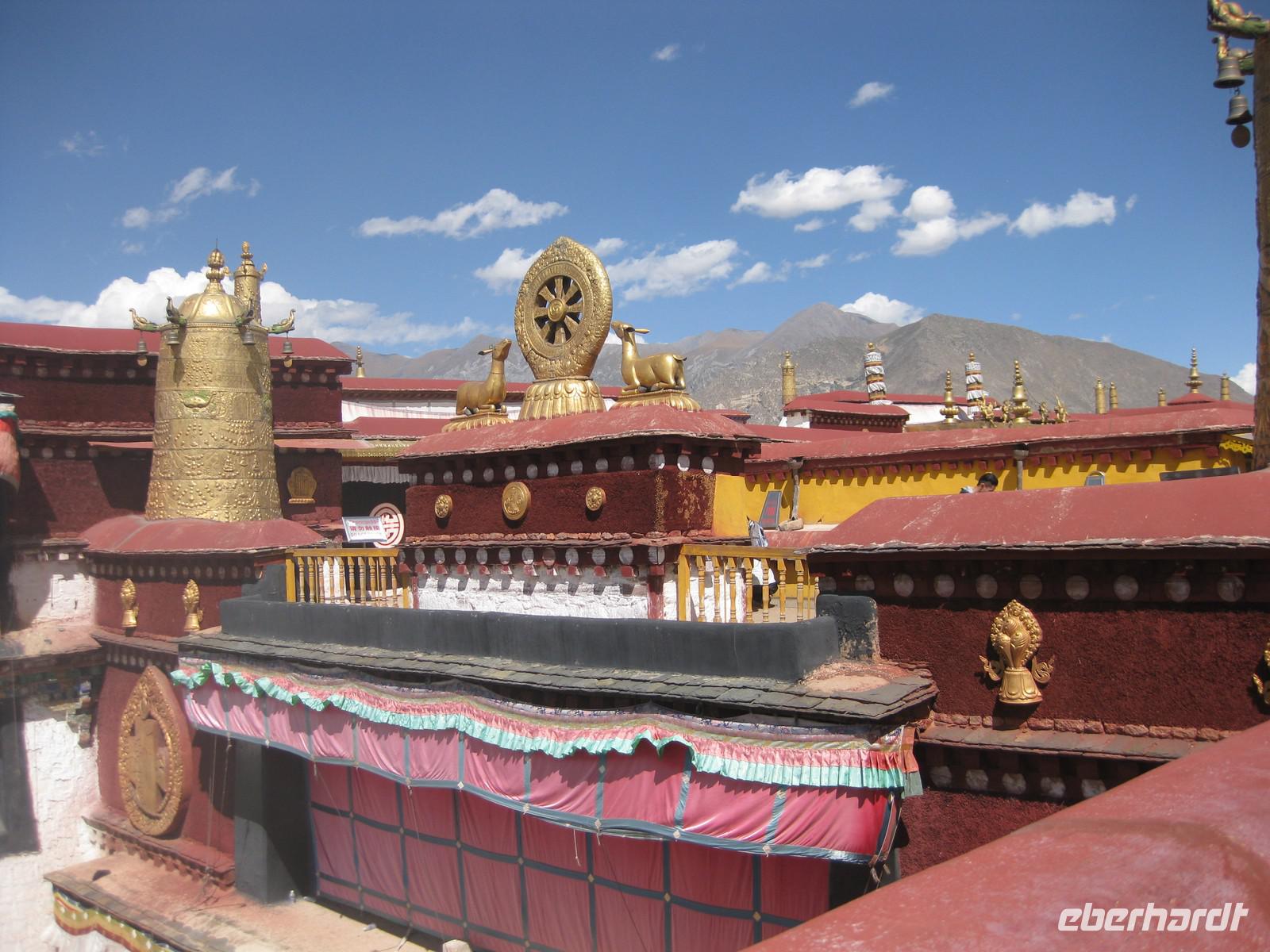 Am Nachmittag um 14.30 Uhr treffen wir uns wieder in der Hotel Lobby. Wir laufen zum Jokhang-Kloster, dem Nationalheiligtum Tibets. Er ist nur wenige Minuten vom Hotel entfernt. Der Jokhang wurde im 7. Jh. erbaut. Er beherbergt die heiligste Statue Tibets und zahlreiche weitere wertvolle Standbilder. Die Besichtigung ist sehr interessant. Vom Dach des Jokhang aus hat man einen spektakulären Blick über die Stadt Lhasa bis hin zum Potala Palast. Im Anschluss daran besuchen wir noch die Haupteinkaufsstraße für Souvenire, den „Barkhor". Und wir kaufen uns noch etwas Obst für die Fahrt am morgigen Tag.