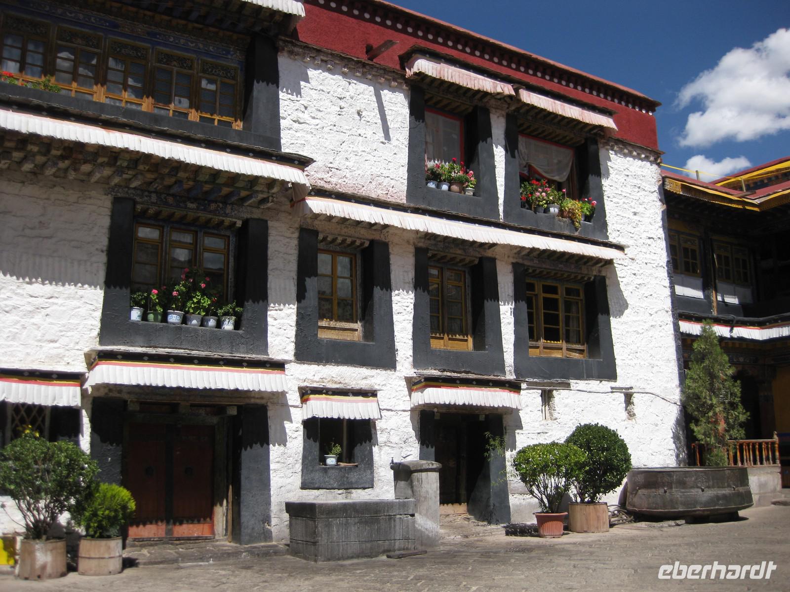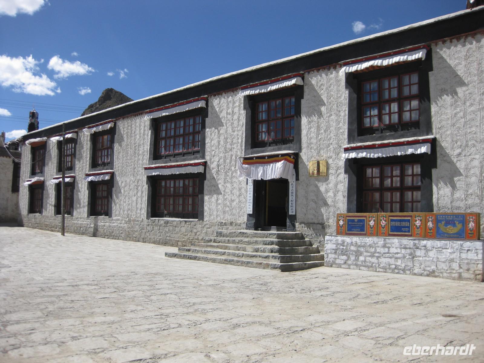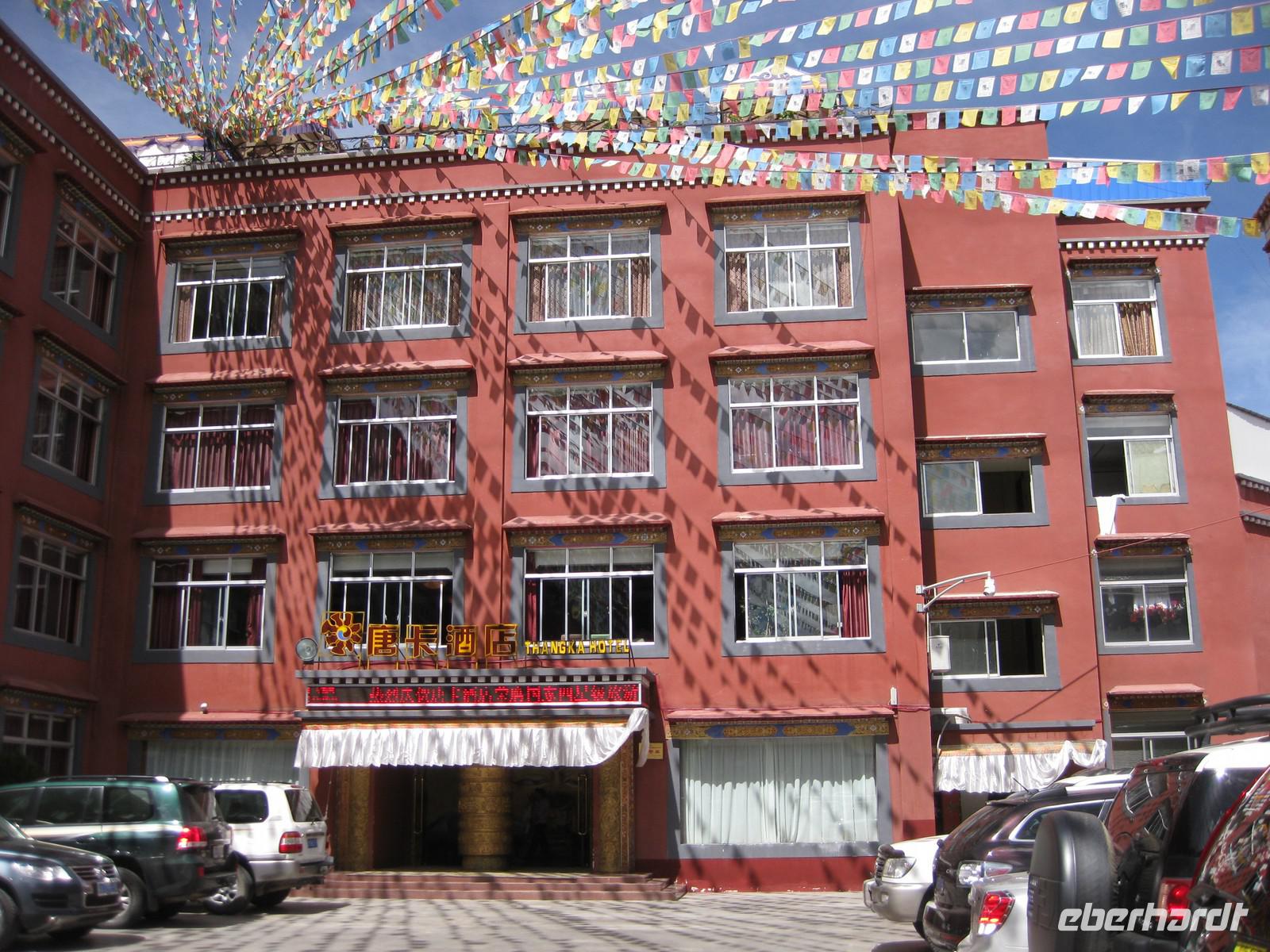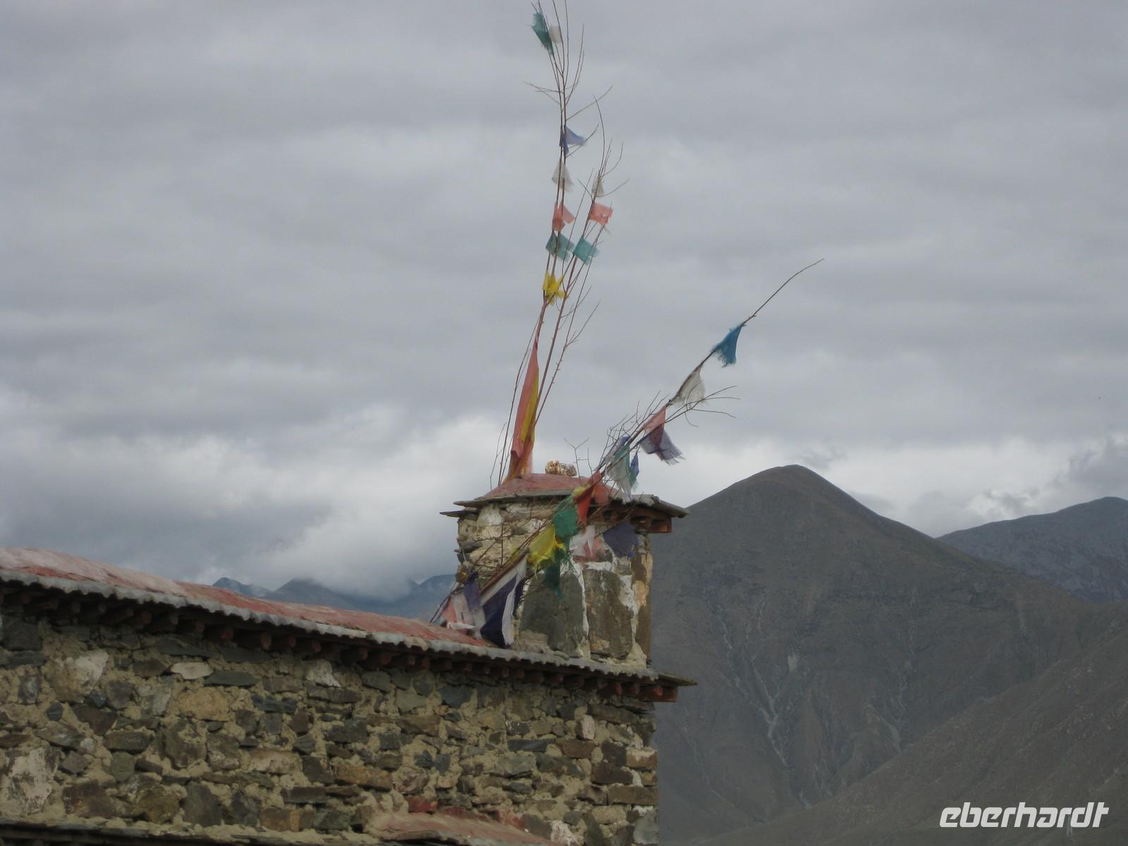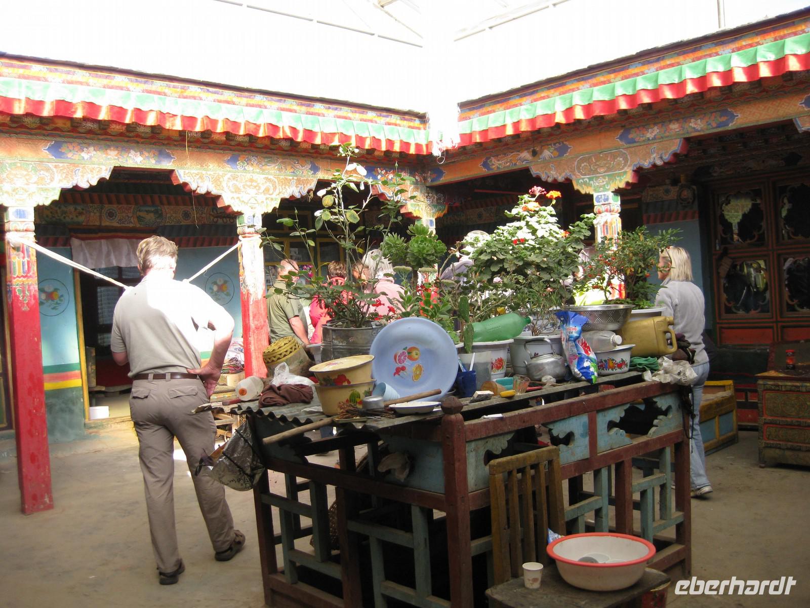 Heute haben wir ein etwas anderes Frühstück. Der Frühstücksraum ist tibetisch eingerichtet. Es gibt Kaffee, Tee, Saft, Yakbutter, Eier, Marmelade und eine Art Fladenbrot. Im ersten Moment etwas gewöhnungsbedürftig, aber eigentlich gar nicht so schlecht - eben mal landestypisch tibetisch für uns Europäer.