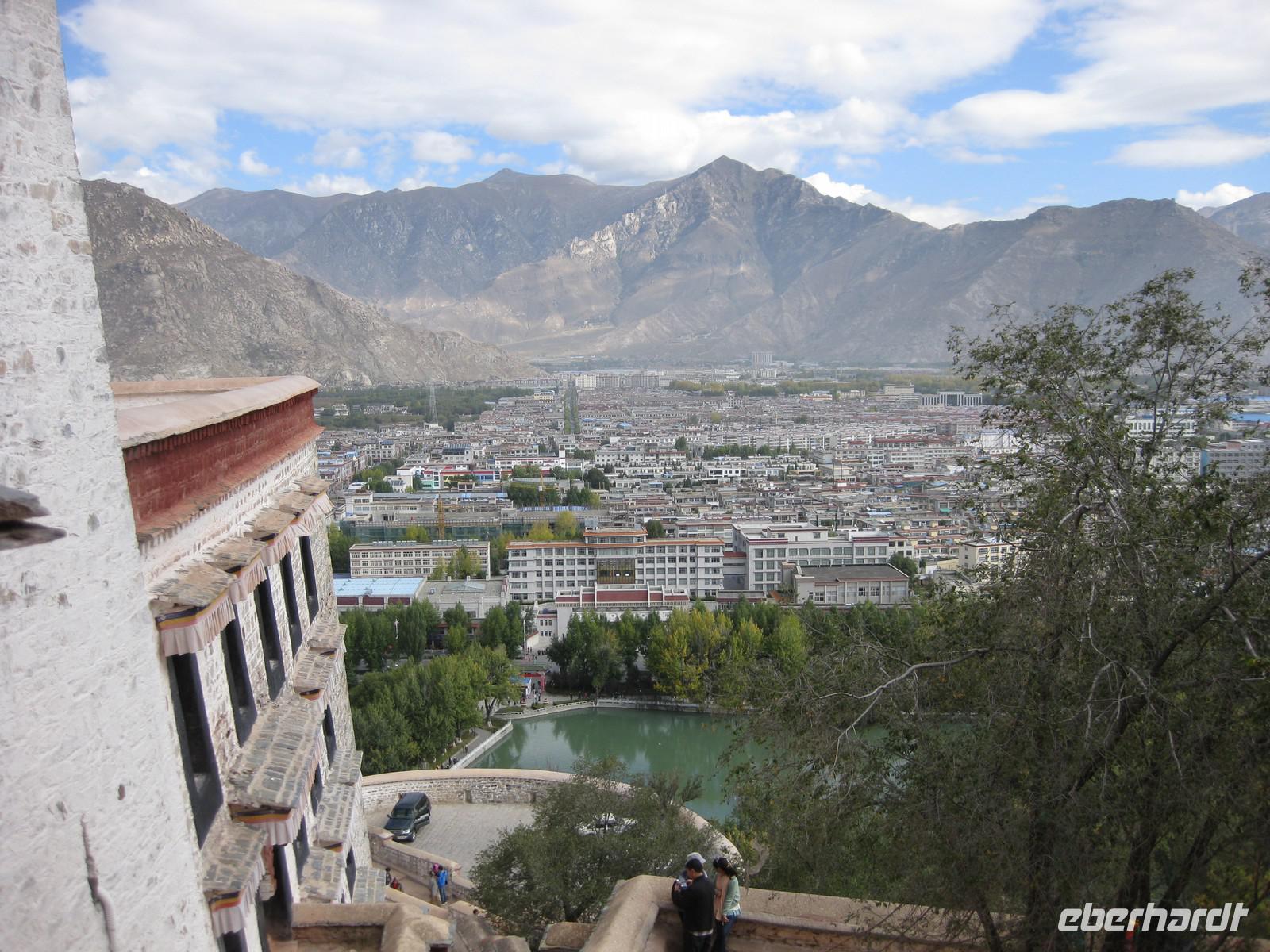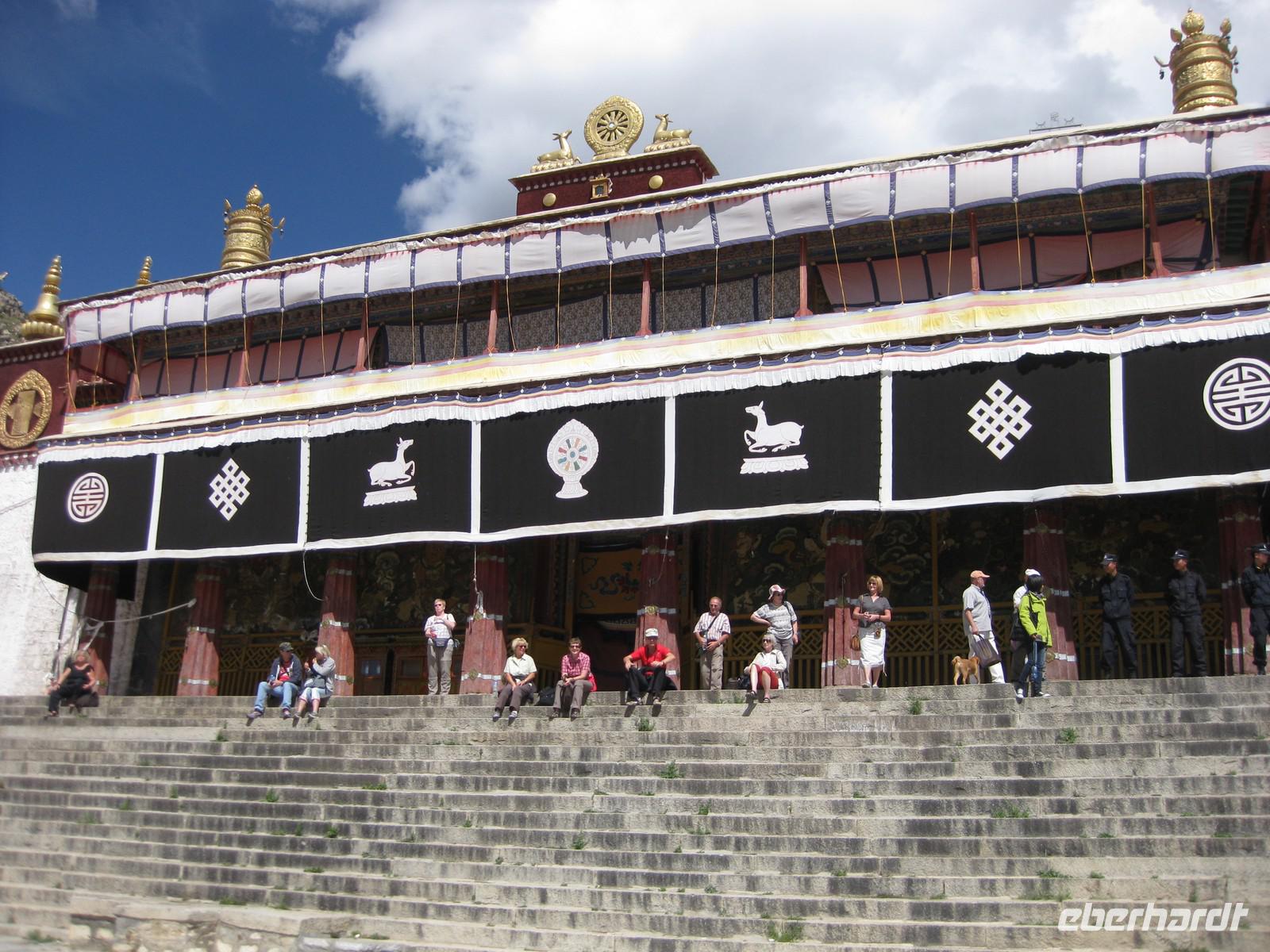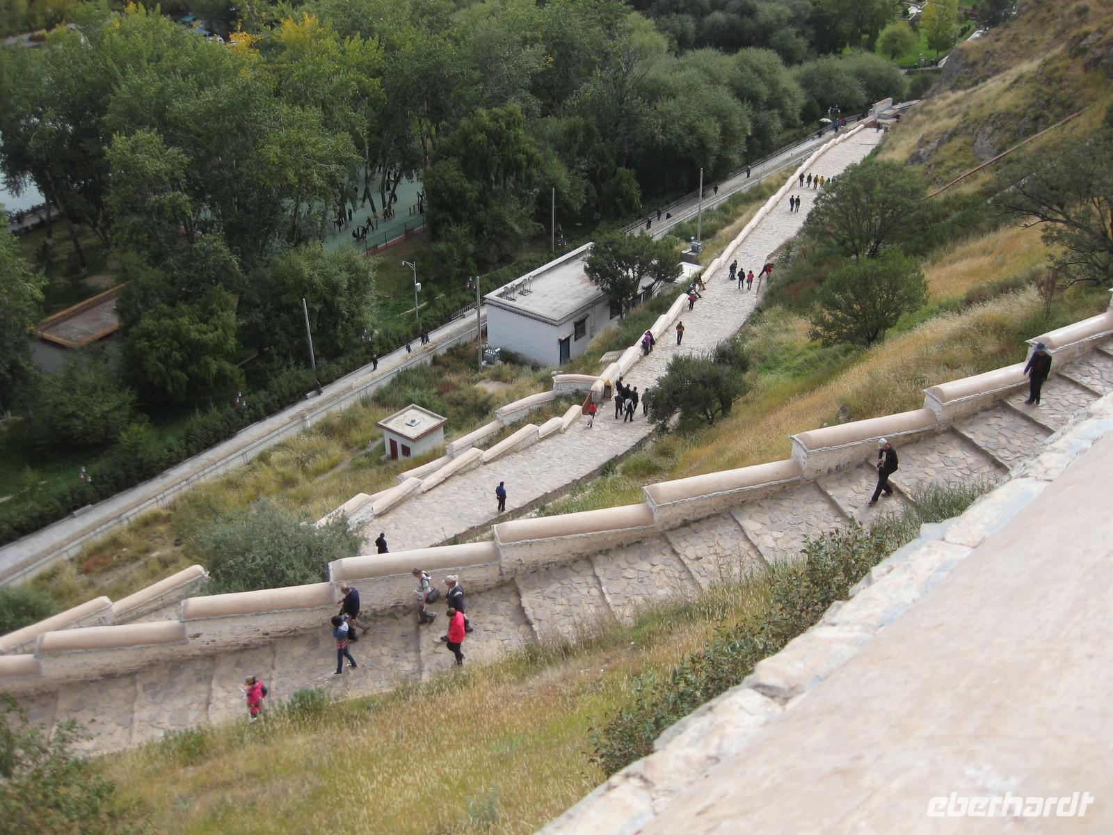 Wir müssen deshalb zeitig aufstehen, da wir schon früh am Vormittag unseren Besichtigungstermin haben. Wir sind pünktlich um 7.40 Uhr am Palast, müssen dann aber doch bis 9.10 Uhr warten. Endlich dürfen wir hinein. Es ist schon ein erhebendes Gefühl, selbst vor dem Potala Palast, dem Wahrzeichen Tibets, zu stehen und ihn besichtigen zu dürfen. Wir erklimmen die Stufen, die uns hinauf durch mehrere prachtvolle Portale führen bis zu einem Hof. Wir merken schon, dass wir uns hier in etwas größerer Höhe als gewöhnlich befinden. Alle schaffen es. Von hier aus gelangen wir in die Privatgemächer des Dalai Lama. Wir sehen Versammlungshallen, prachtvolle Stupas, Statuen und Schriften. Yang erklärt und zeigt uns alles. Am Schluss des Rundgangs bietet sich noch ein toller Blick über die Stadt. Fasziniert verlassen wir den Potala Palast und steigen auf der Rückseite des Palastes wieder hinab. Wir schlendern zum Bus zurück.