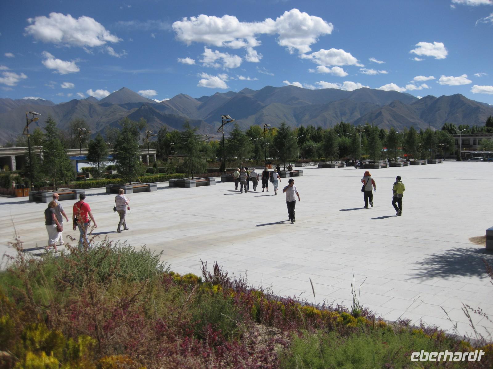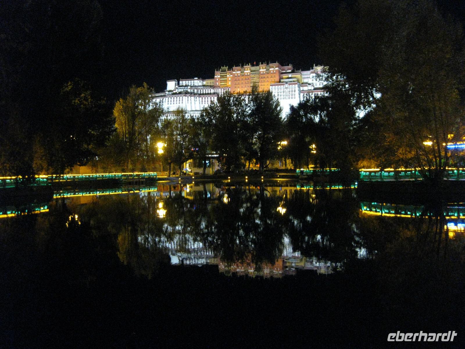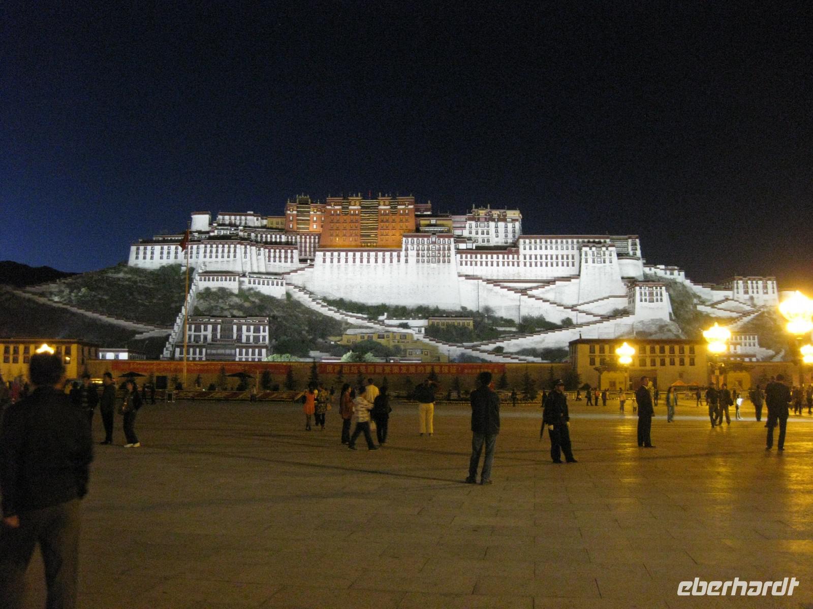 Den restlichen Nachmittag nutzen wir für individuelle Bummel durch die Stadt. Das Abendessen nehmen wir heute im Hotel ein. Nach dem Abendessen machen wir alle zusammen noch einen Spaziergang bis zum Platz vor dem Potala-Palast. Dort bietet sich uns ein unvergessliches Bild - der beleuchtete Potala-Palast. Auf dem riesigen Platz vor dem Palast sind beleuchteten Wasserspiele, die zu Musik die Gestalt ihrer Fontänen ändern. Wir verbringen dort den Rest des Abends und geben uns ganz den Eindrücken hin. Für den Rückweg zum Hotel mieten wir uns Fahrrad-Rickschas. Wir haben viel Spaß dabei. Diese Fahrt komplettiert den wunderschönen Abend.