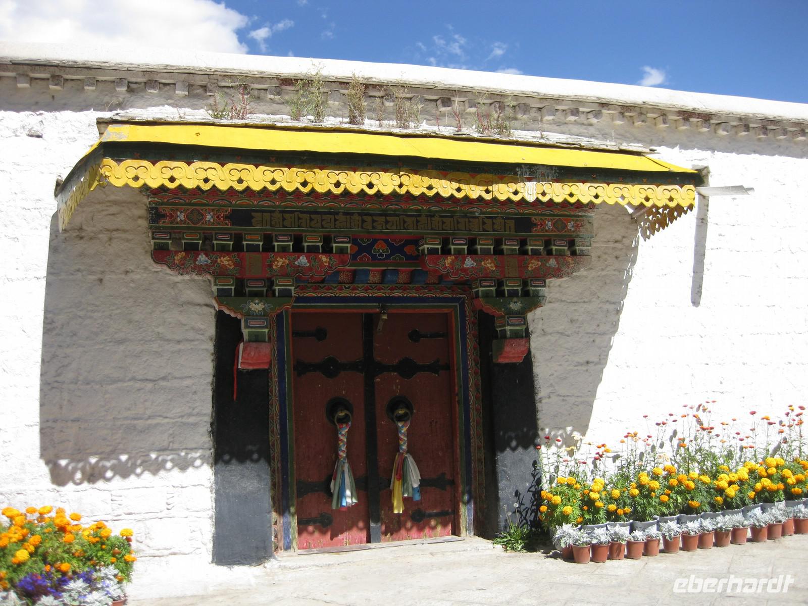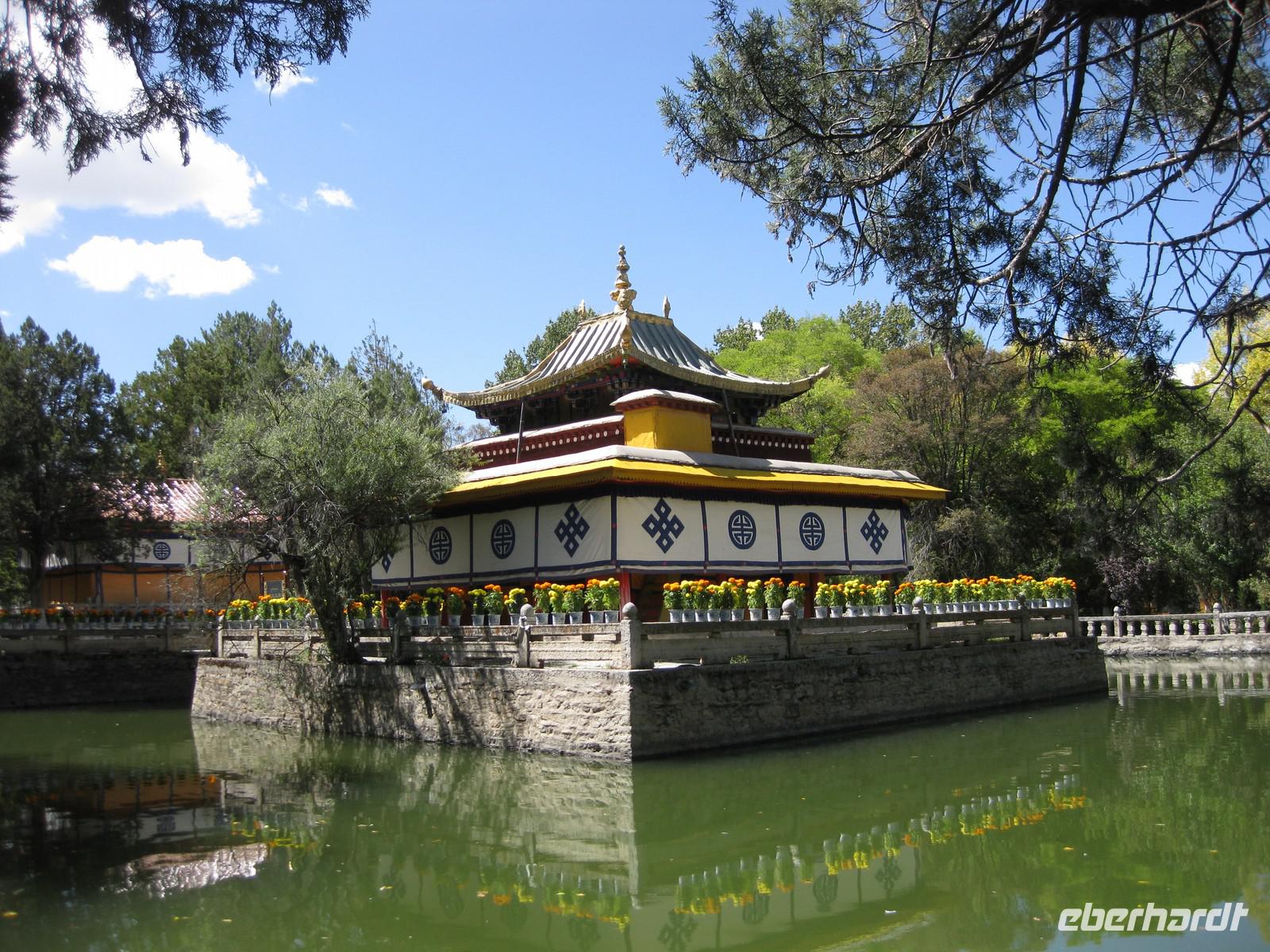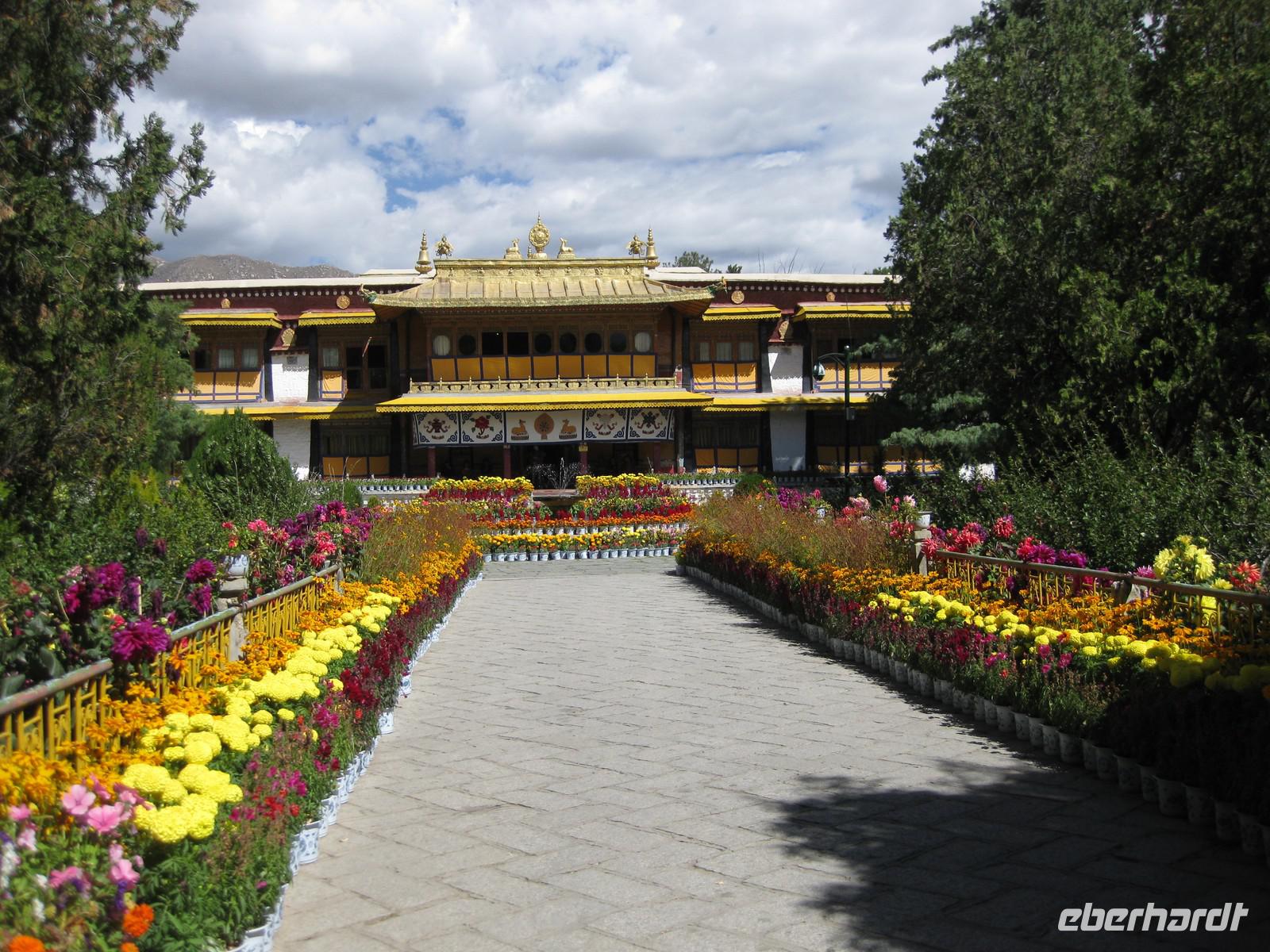 Im Anschluss daran fahren wir zur Sommerresidenz (Kloster Norbulinka) des Dalai Lama. Auch hier haben wir eine sehr interessante Führung durch den Park. Wir besichtigen die 1956 fertig gestellte Sommerresidenz des derzeitigen Dalai Lamas. Yang zeigt uns die riesige, wunderschöne Parkanlage mit den Sommerpalästen der einzelnen Dalai Lamas. Der Garten ist mit unzähligen Blumen geschmückt. Dann fahren wir zum Hotel zurück und machen eine kleine Mittagspause.