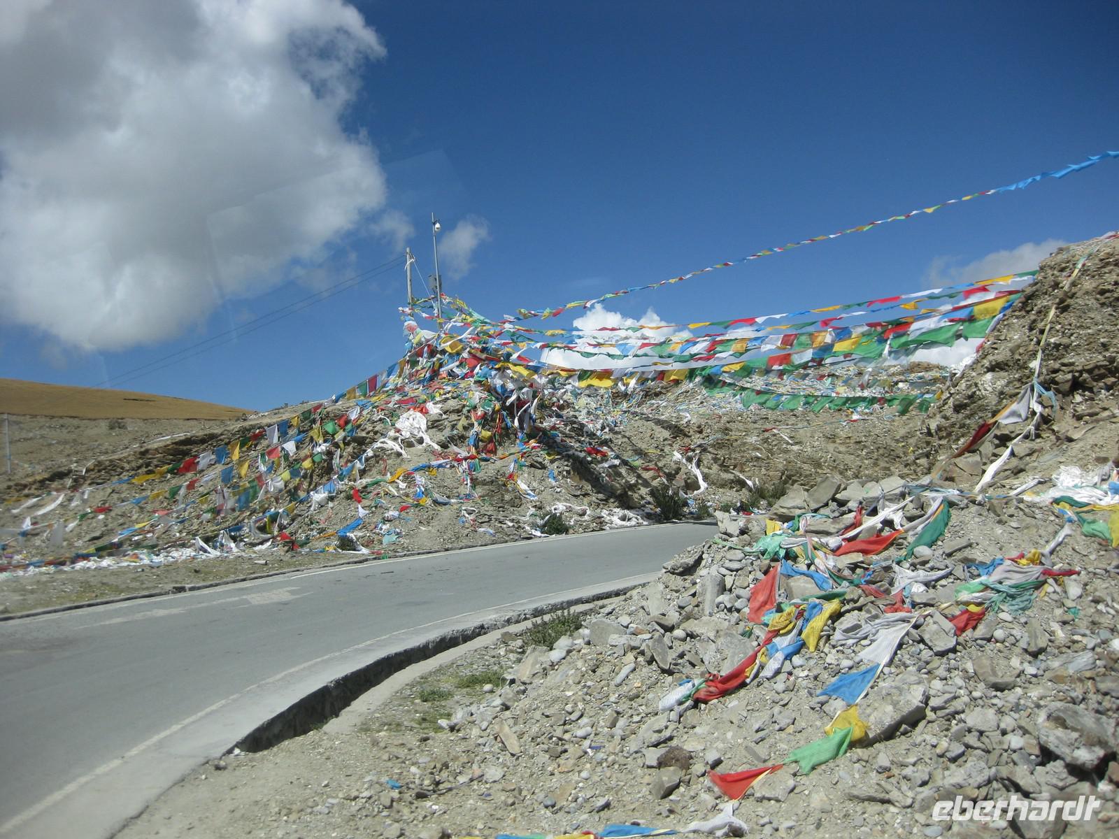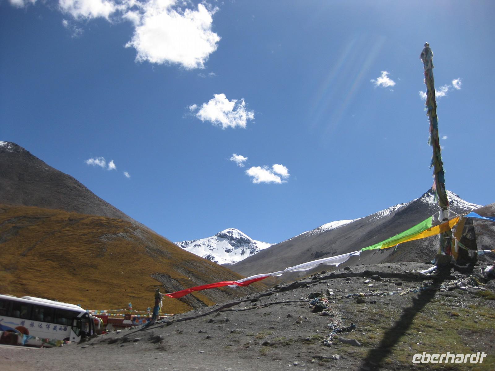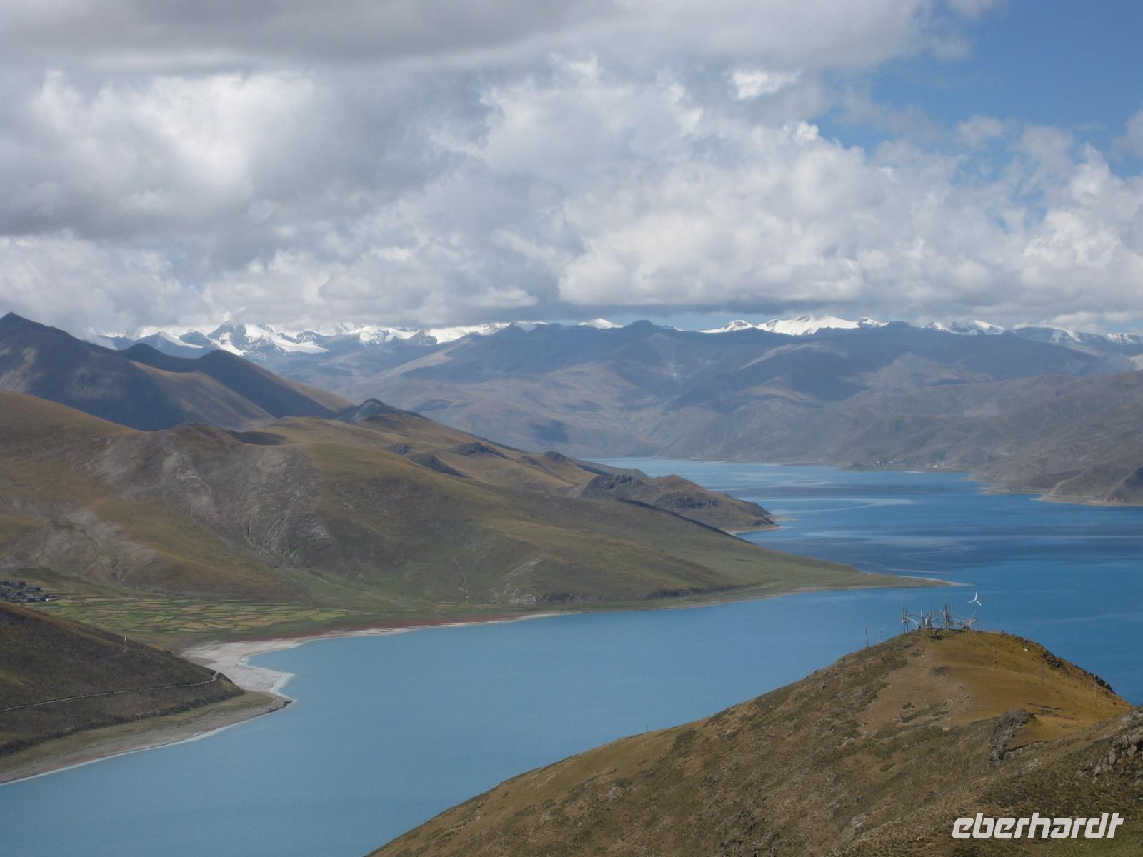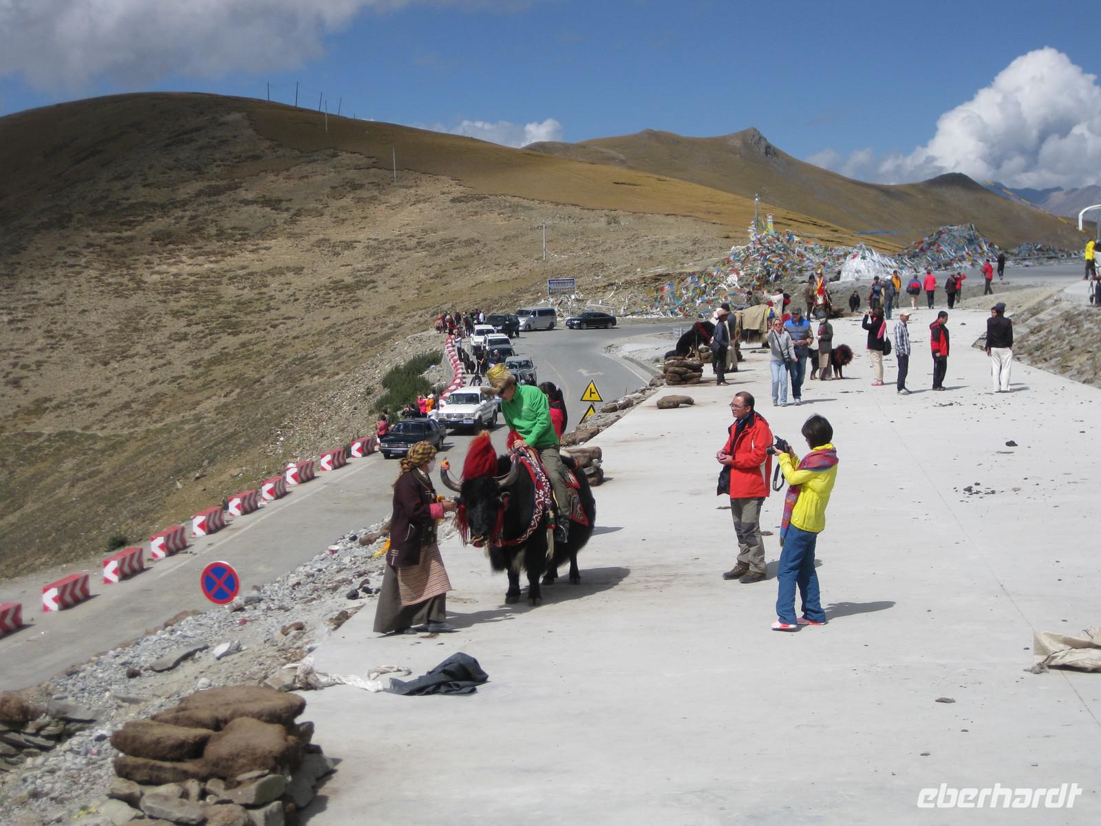Jetzt verlassen wir das Tal und fahren die Serpentinenstraße zum Khampa La Pass hinauf. An jeder Kurve bietet sich ein neuer atemberaubender Blick auf die Berge und in's Tal. An einem Aussichtspunkt in halber Höhe halten wir. Hier wehen viele Gebetsfahnen im Wind, die dem Wunsch nach Verbreitung des Glücks und der Besänftigung der Landesgottheiten dienen. Sie wurden von den Tibetern aufgehängt. Auf dem Parkplatz des Khampa La Passes in 4.884 m Höhe legen wir einen Stopp ein. Von hier aus können wir auf den türkisblau strahlenden Yamdrok Yutsho See hinab blicken - faszinierend. In der Ferne sehen wir die schneebedeckten Gipfel der Sechstausender. Auf dem Parkplatz warten Yaks und Mastis, um mit den Touristen zusammen fotografiert zu werden, natürlich für ein kleines Entgelt.