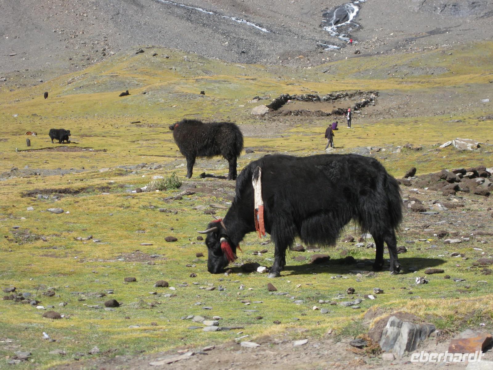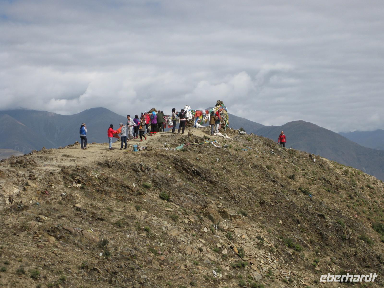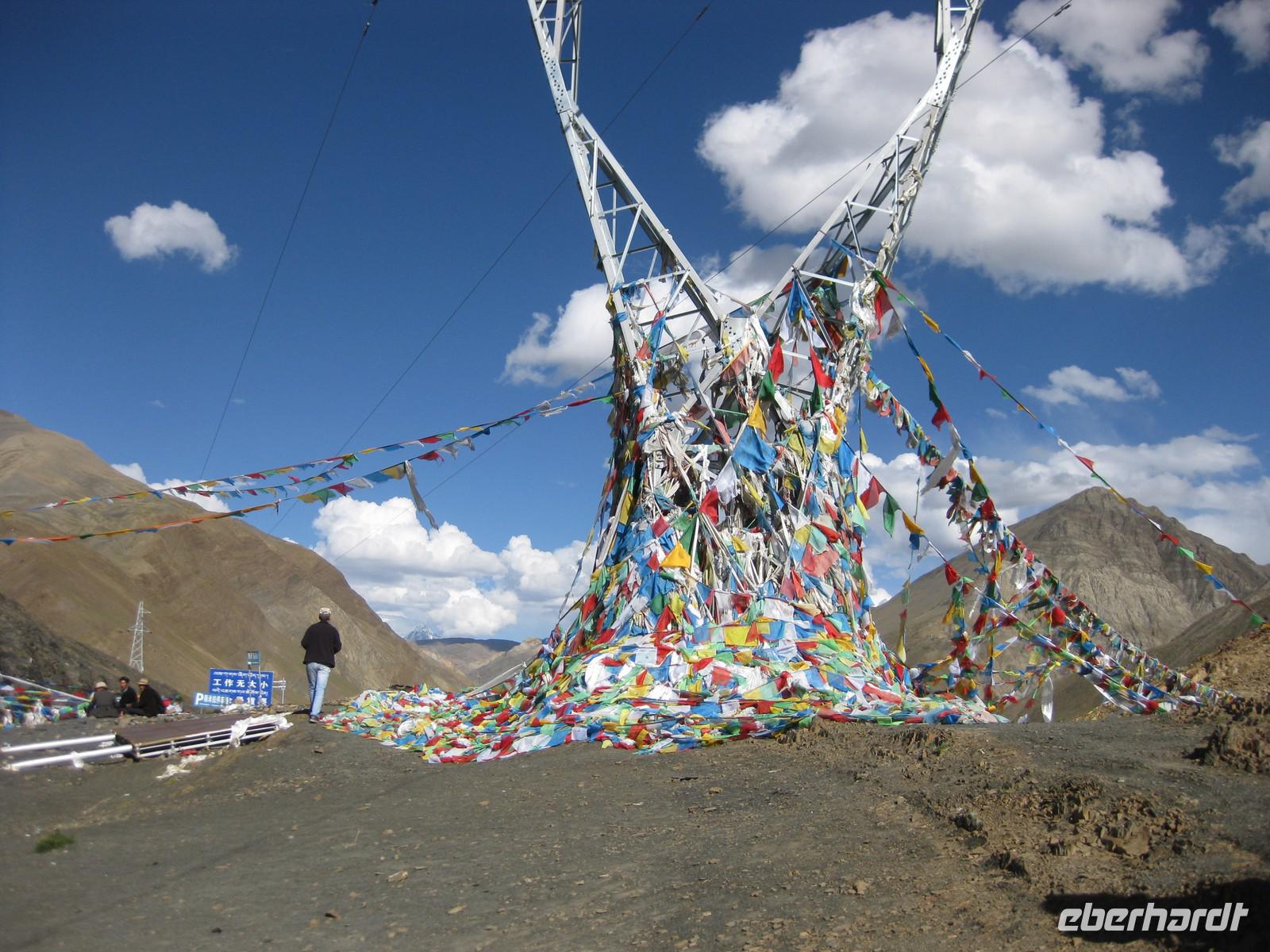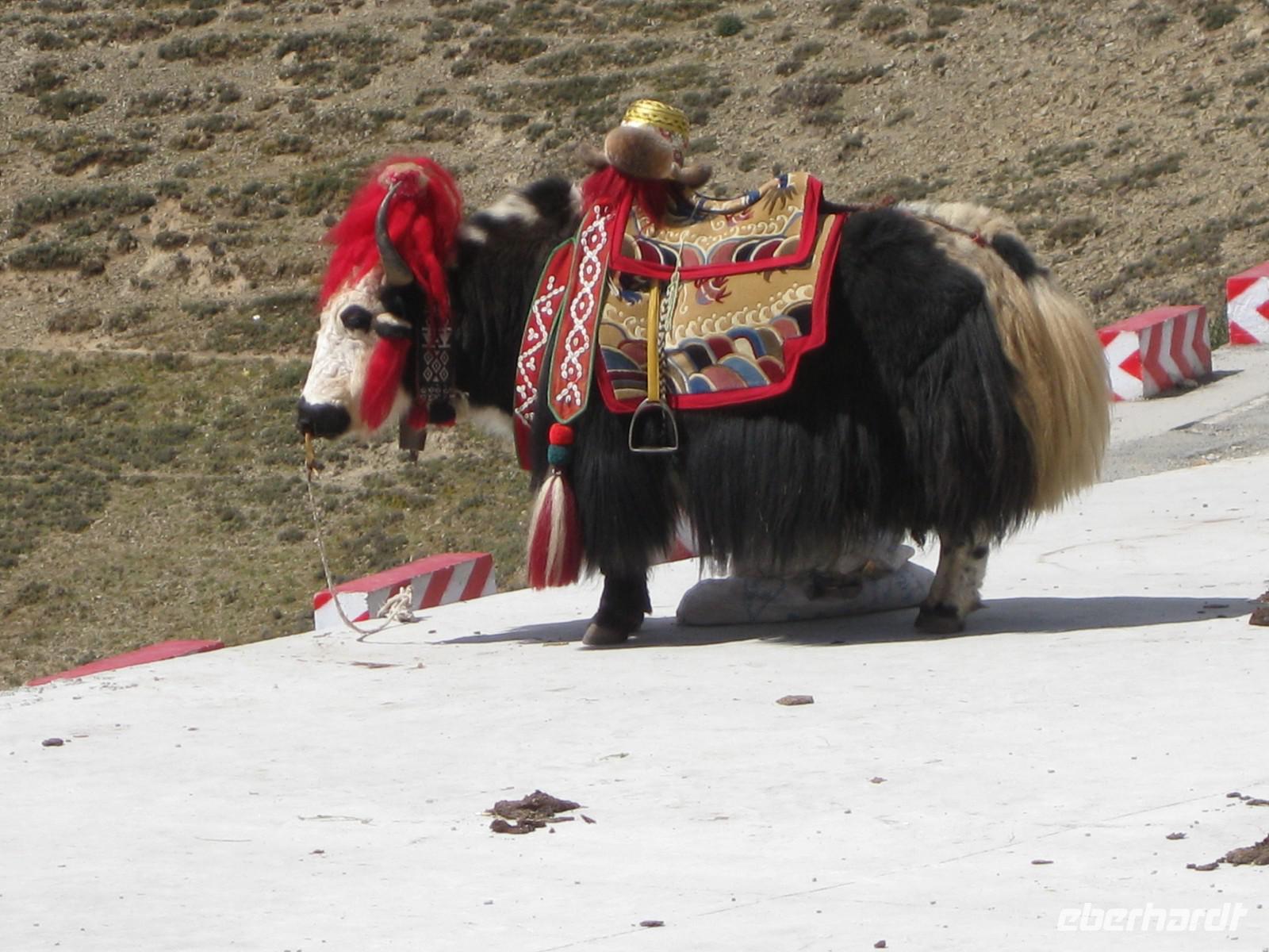 Jetzt verlassen wir das Tal und fahren die Serpentinenstraße zum Khampa La Pass hinauf. An jeder Kurve bietet sich ein neuer atemberaubender Blick auf die Berge und in's Tal. An einem Aussichtspunkt in halber Höhe halten wir. Hier wehen viele Gebetsfahnen im Wind, die dem Wunsch nach Verbreitung des Glücks und der Besänftigung der Landesgottheiten dienen. Sie wurden von den Tibetern aufgehängt. Auf dem Parkplatz des Khampa La Passes in 4.884 m Höhe legen wir einen Stopp ein. Von hier aus können wir auf den türkisblau strahlenden Yamdrok Yutsho See hinab blicken - faszinierend. In der Ferne sehen wir die schneebedeckten Gipfel der Sechstausender. Auf dem Parkplatz warten Yaks und Mastis, um mit den Touristen zusammen fotografiert zu werden, natürlich für ein kleines Entgelt.