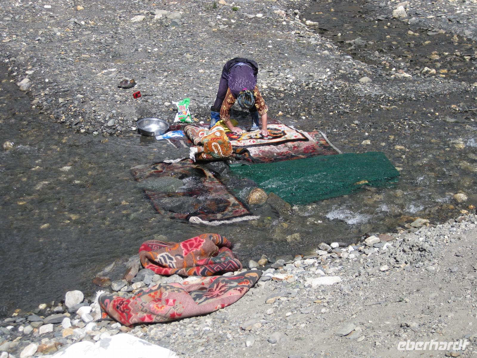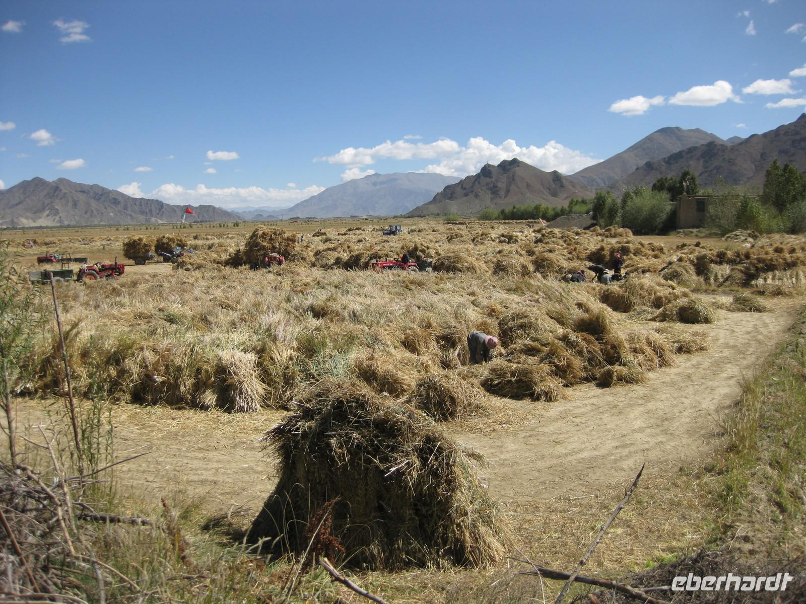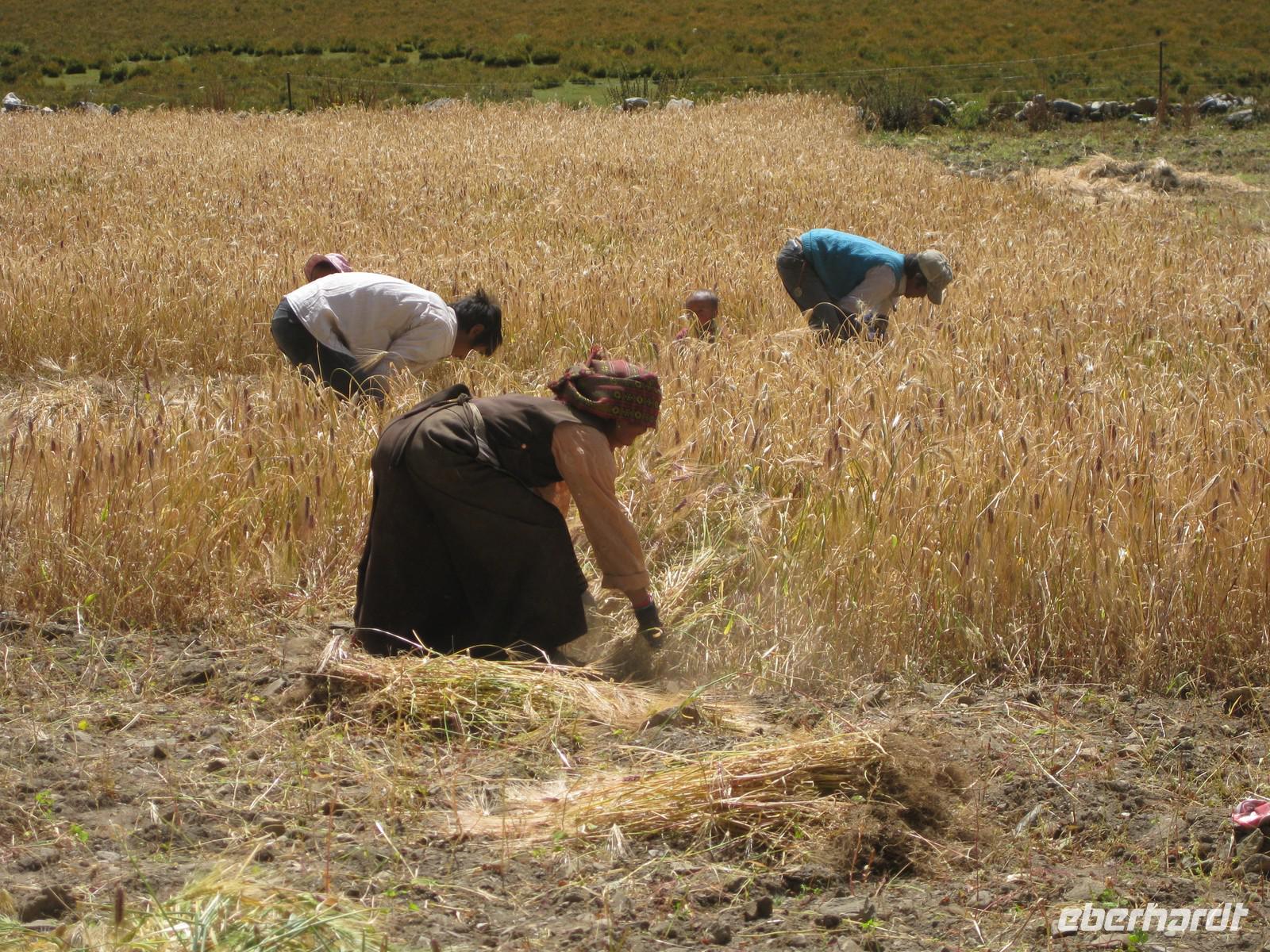 Dann setzen wir unsere Fahrt fort und fahren zum Yamdrok Yutsho See hinunter. Dort machen wir am Ufer noch einen Fotostopp. Wir können auch mal mit der Hand prüfen, wir kalt / warm das Wasser ist. Und weiter geht die Fahrt am See entlang. Wir passieren Dörfer und können so sehen, wie die Tibeter hier leben. Wir beobachten eine Familie bei der Ernte, auch die Jüngsten sind mit dabei.