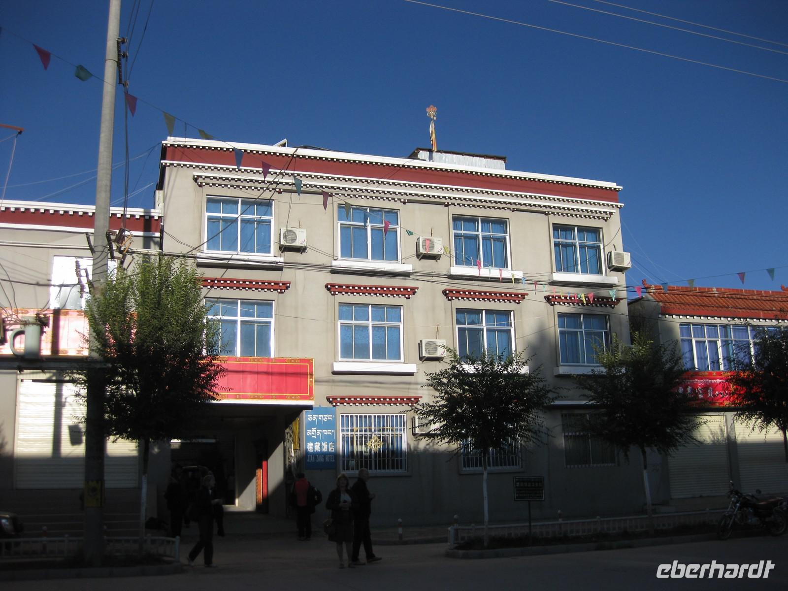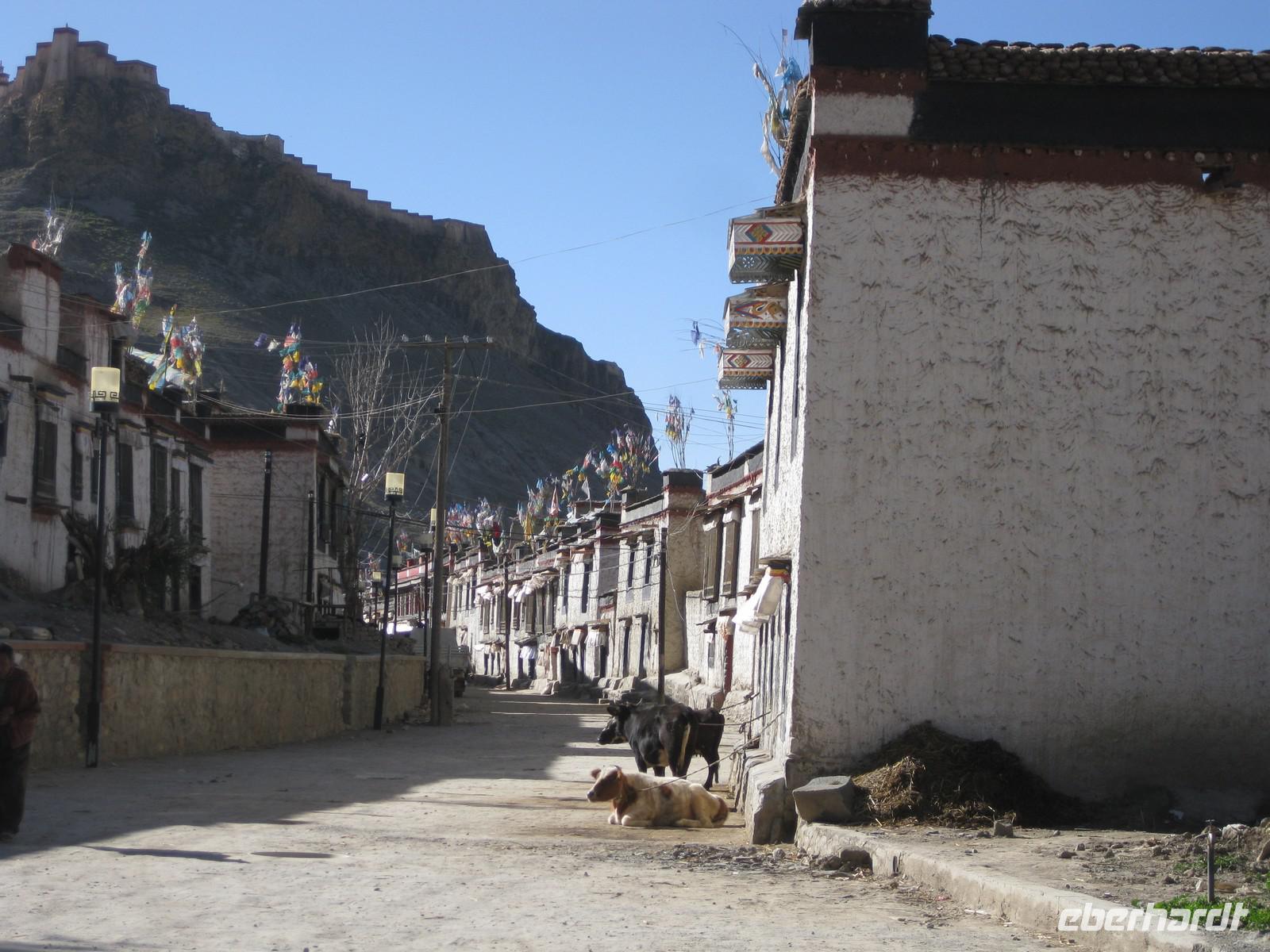 Um 18.00 Uhr kommen wir in unserem Hotel in Gyantse an. Wir beziehen unsere Zimmer und gehen anschließend in das nahe gelegene Restaurant zum Abendessen. Wir werden vom Chef höchstpersönlich empfangen. Es gibt tibetische Speisen, die uns auch sehr gut schmecken. Nach dem Abendessen bummeln wir noch etwas durch das Städtchen.