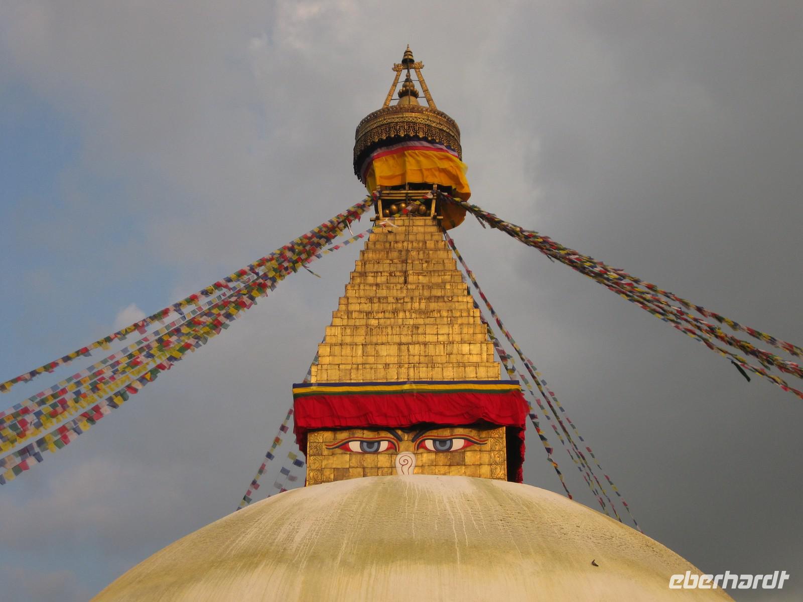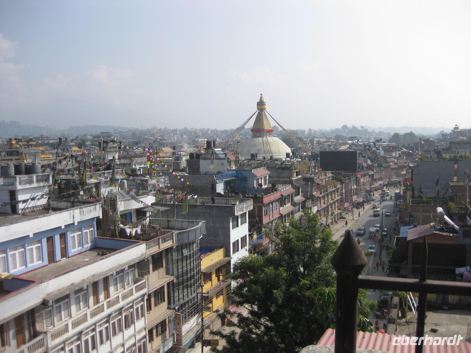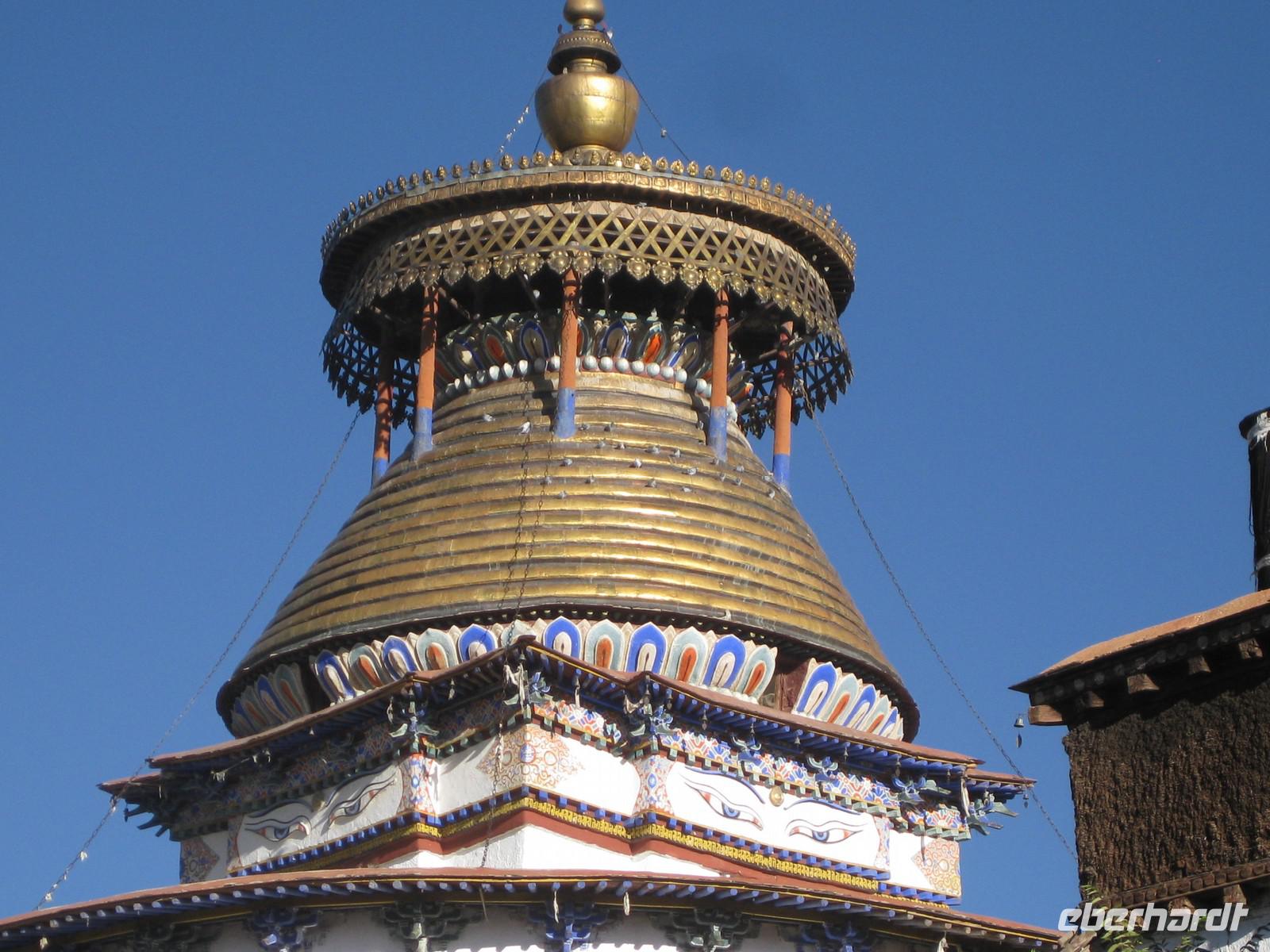 Der restliche Nachmittag steht zur freien Verfügung. Die meisten von uns statten der Stupa von Bodhnath ganz in der Nähe unseres Hotels noch einen Besuch ab. Sie ist das wichtigste buddhistische Heiligtum Nepals. In unmittelbarer Umgebung befinden sich einige Klostergebäude. Bodhnath ist von einer kreisförmigen tibetischen Siedlung umgeben. In den Häusern befinden sich nicht nur Wohnungen der Tibeter sondern auch viele Geschäfte und Restaurants.