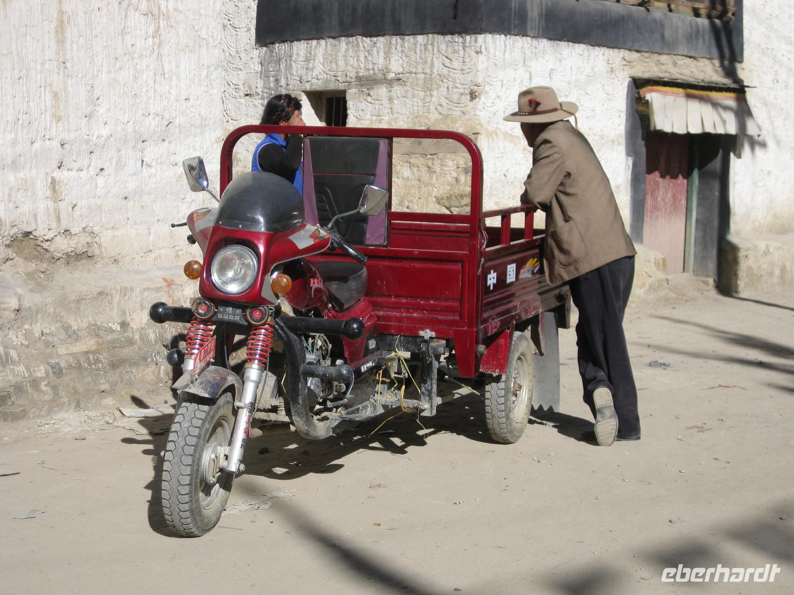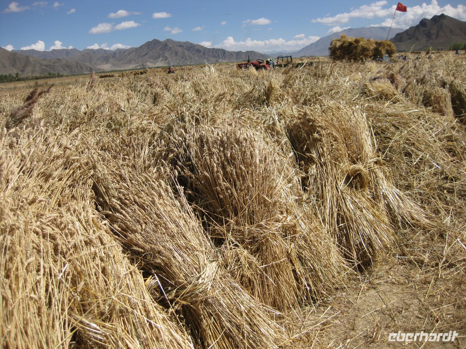 Kurz vor 11.00 Uhr verlassen wir Gyantse und fahren in Richtung Shigatse. Unterwegs legen wir mehrere Stopps ein. Wir sind sonst zu schnell in Shigatse. Hier ist die "Kornkammer" Tibets. Einmal stoppen wir kurz vor Shigatse. Die Bauern ernten das Getreide. Sie machen gerade Mittagspause. Yang spricht mit Ihnen und wir dürfen uns dazu setzen und von ihren Kartoffeln und ihrem Gerstenwein kosten. Sie interessieren sich für unsere Kameras bzw. die Fotos. Sie zeigen uns ihre Erntemaschinen. Wir dürfen sogar mal aufsteigen. So haben wir alle viel Spaß.