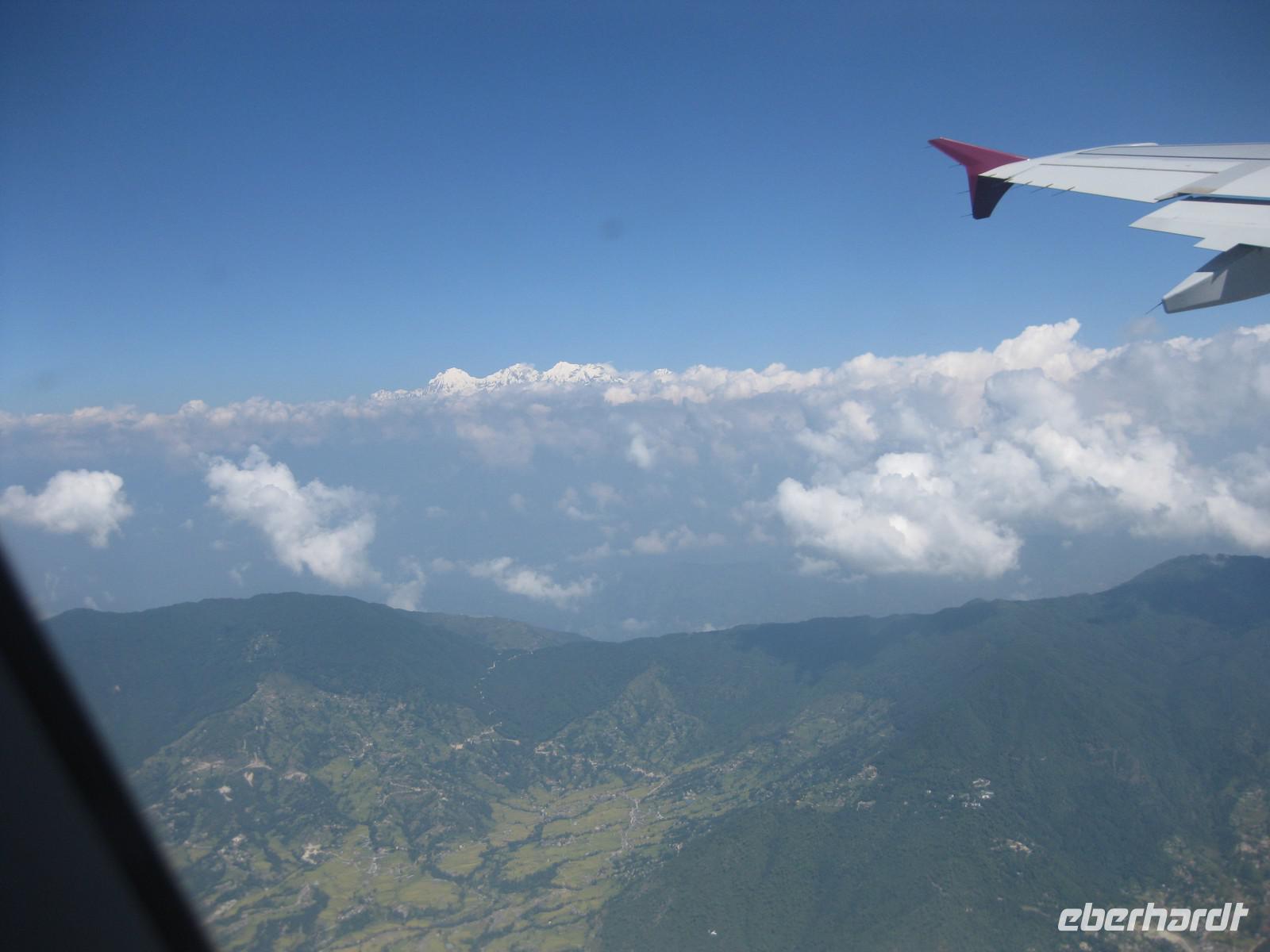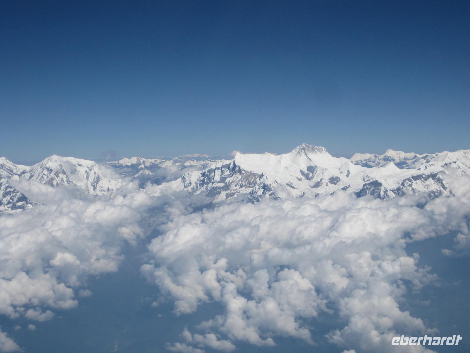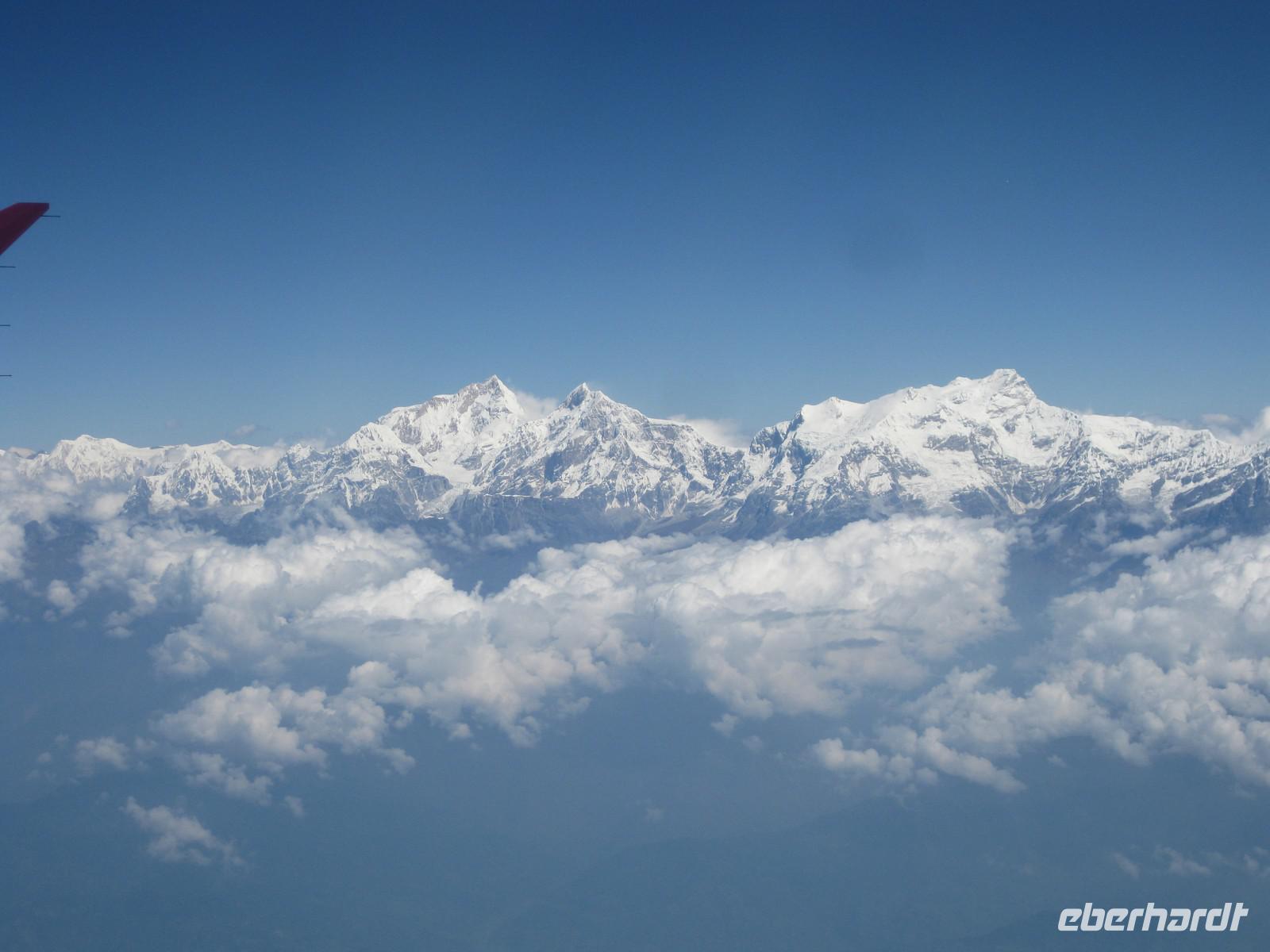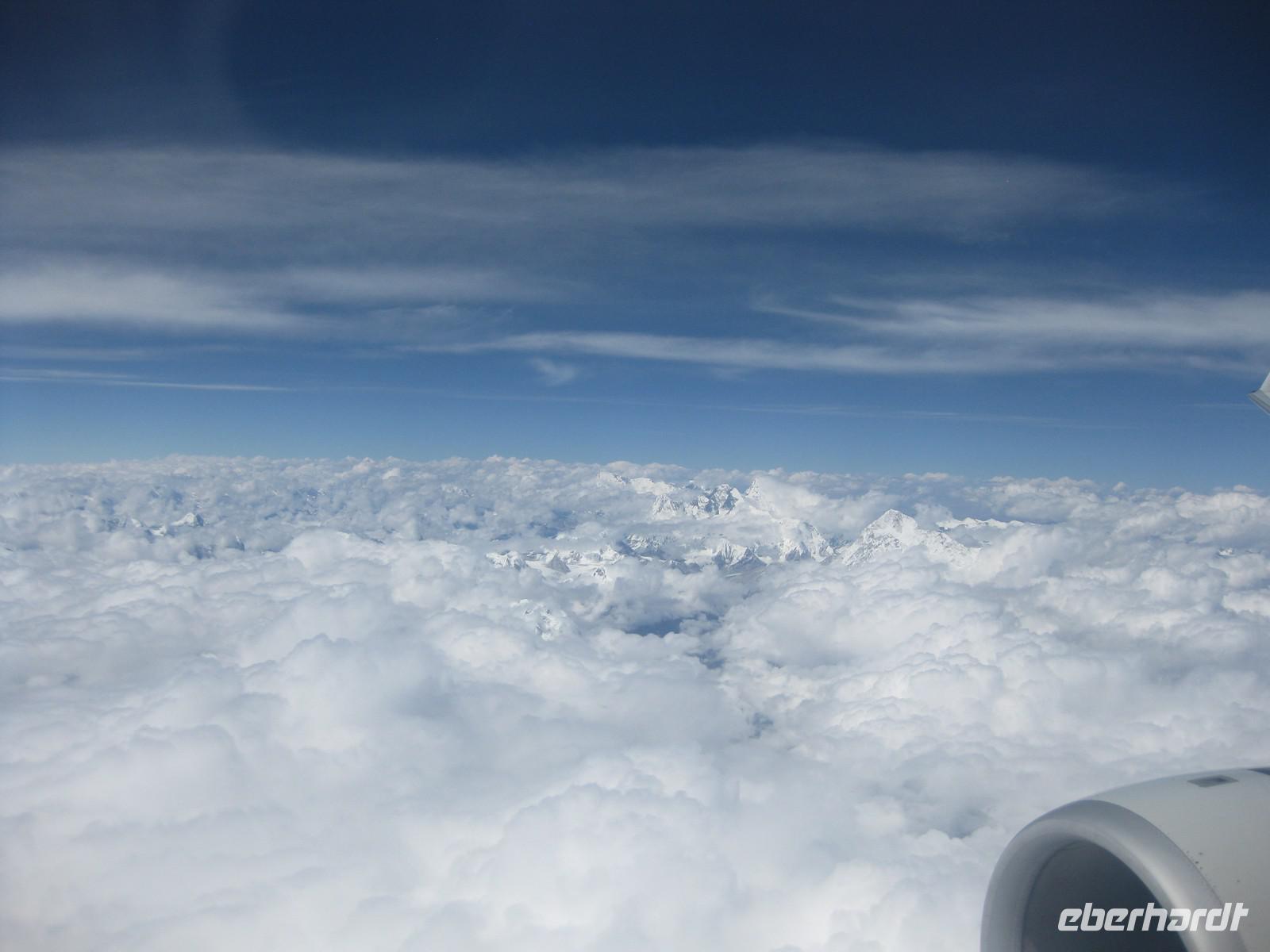 Wir checken bei Air China ein. Jeder hofft auf einen guten Platz im Flieger, denn heute fliegen wir bei bestem Wetter über das Himalaya-Gebiet mit dem Mont Everest, dem höchsten Berg der Erde. Leider können wir die Sitzplatzvergabe nicht beeinflussen. Wir geben unser Gepäck auf und gehen durch die Sicherheitskontrolle. Dann müssen wir warten, bis unser Flieger startet. Die Startzeit verschiebt sich um ca. zwei Stunden, so dass wir erst 13.10 Uhr starten, durch die Zeitverschiebung aber 13.30 Uhr in Kathmandu landen.