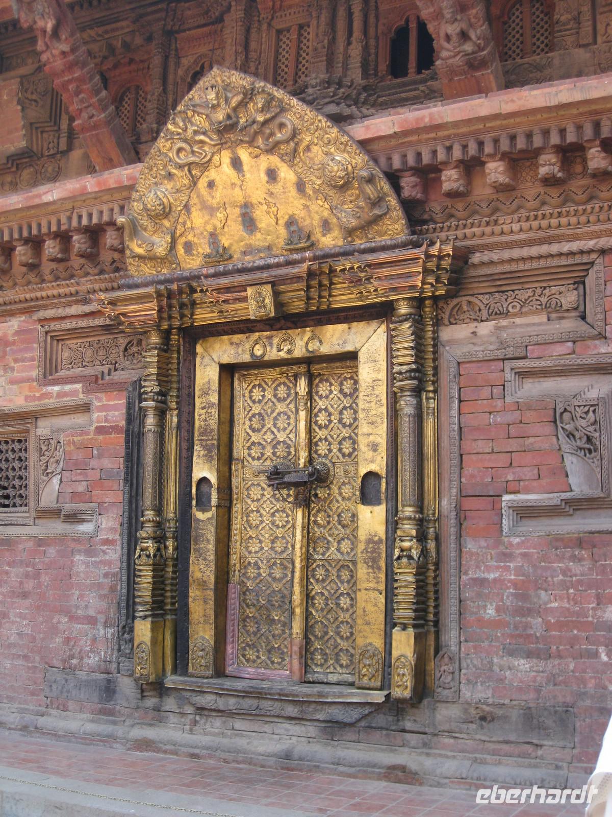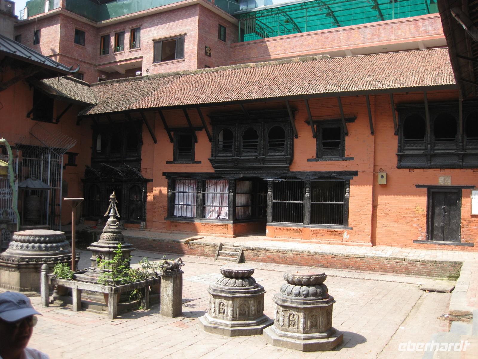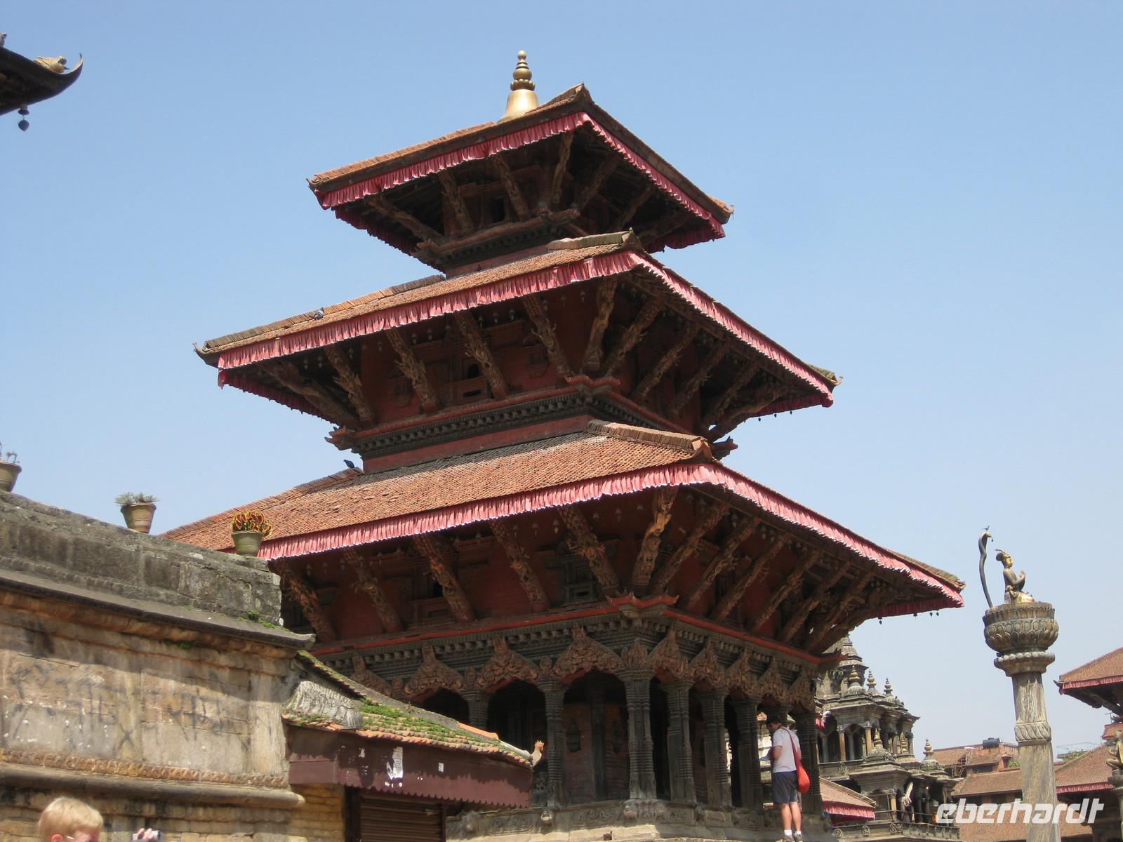 Zuerst müssen wir wieder durch das chaotische Kathmandu. Patan schließt sich unmittelbar an Kathmandu an. Die beiden Städte sind nur durch den Fluss Bagmati voneinander getrennt. Am Rand der Altstadt von Patan müssen wir aus dem Bus aussteigen. Er darf hier nicht weiter fahren. Wir laufen durch die Altstadt, besuchen den Durbar Square von Patan mit seinen Tempeln, dem Königspalast, den Statuen und ... und Patans prächtigste buddhistische Klosteranlage, den Kwa Bahal (auch Goldener Tempel) und immer mit K.C.'s Erklärungen .
