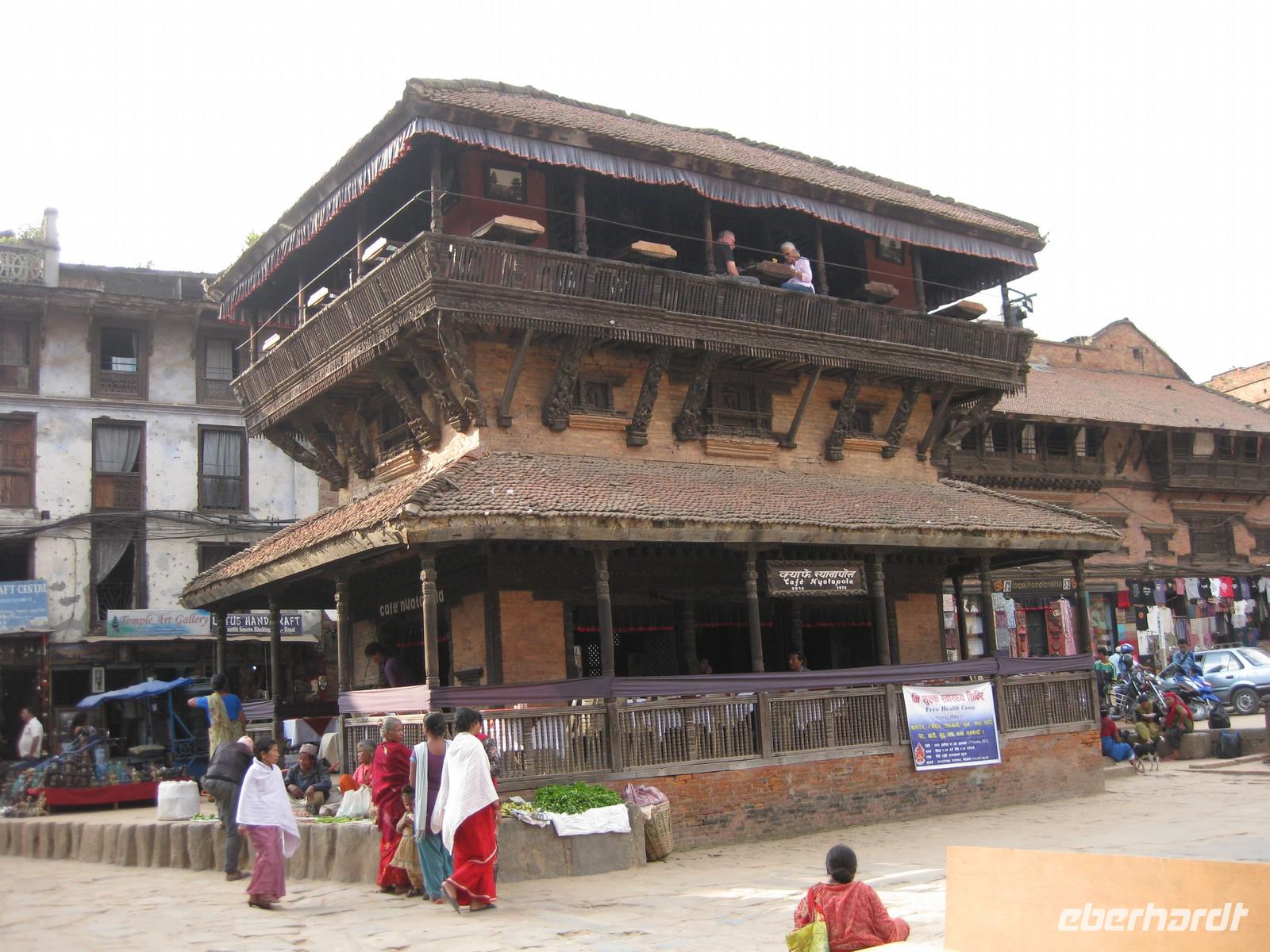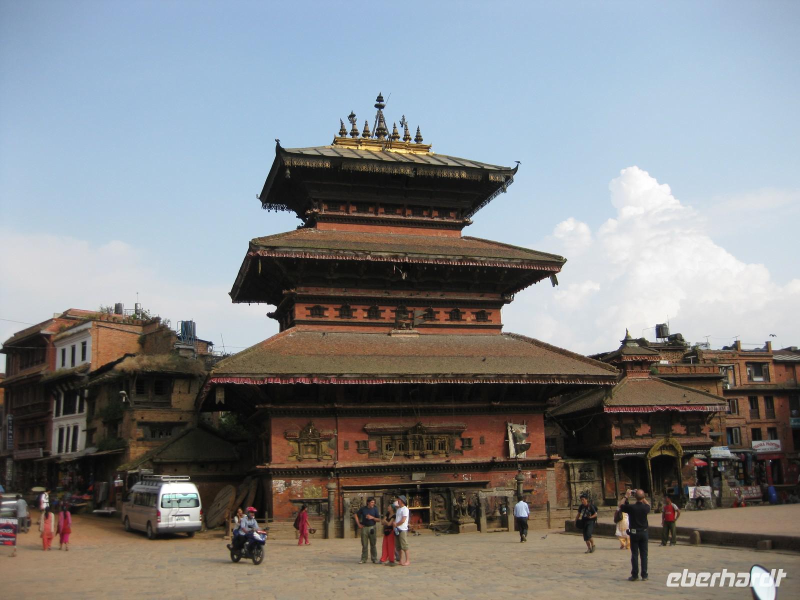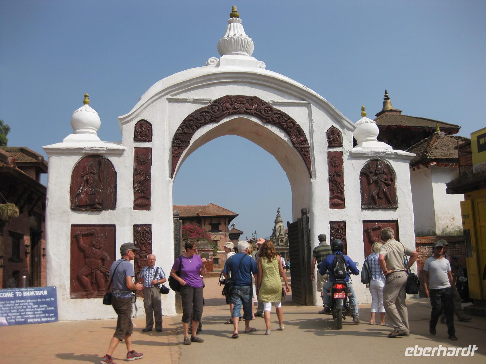 Nach den Besichtigungen in Patan fahren wir gleich weiter nach Bhaktapur, das 15 km östlich von Kathmandu an der alten Handelsstraße nach Tibet liegt. Bhaktapur als alte Königstadt hat auch einen Durbar Square, viele alte Tempel, mittelalterlich wirkende Häuser und Gassen. In Bhaktapur angekommen, machen wir erst einmal im Restaurant am Eingangstor zum Durbar Square Mittagspause. Anschließend besichtigen wir die Altstadt. Diese ist faszinierend mit dem Königspalast, dem Palast der 55 Fenster, den vielen Tempeln und Statuen. Ein Stück weiter durch eine enge Gasse ist ein weiterer größerer Platz, der Taumadhi Tol. Hier befinden sich der höchste Tempel des Kathmandu Valleys, der Nyatapola-Tempel, der Bhairavnath-Tempel, das Cafe Nyatapola und viele andere historische Bauwerke.