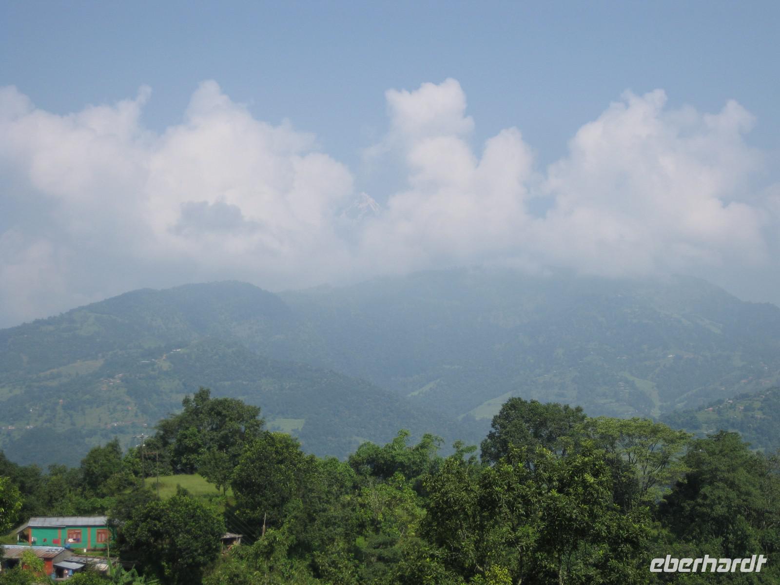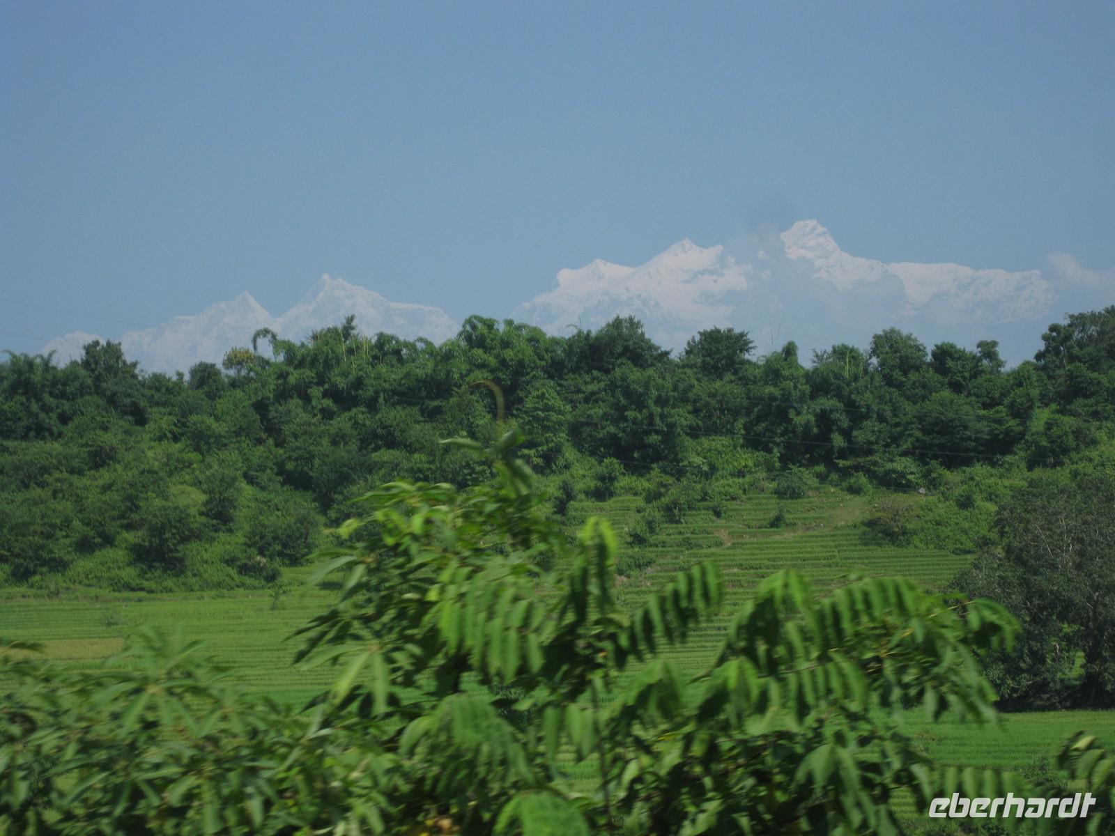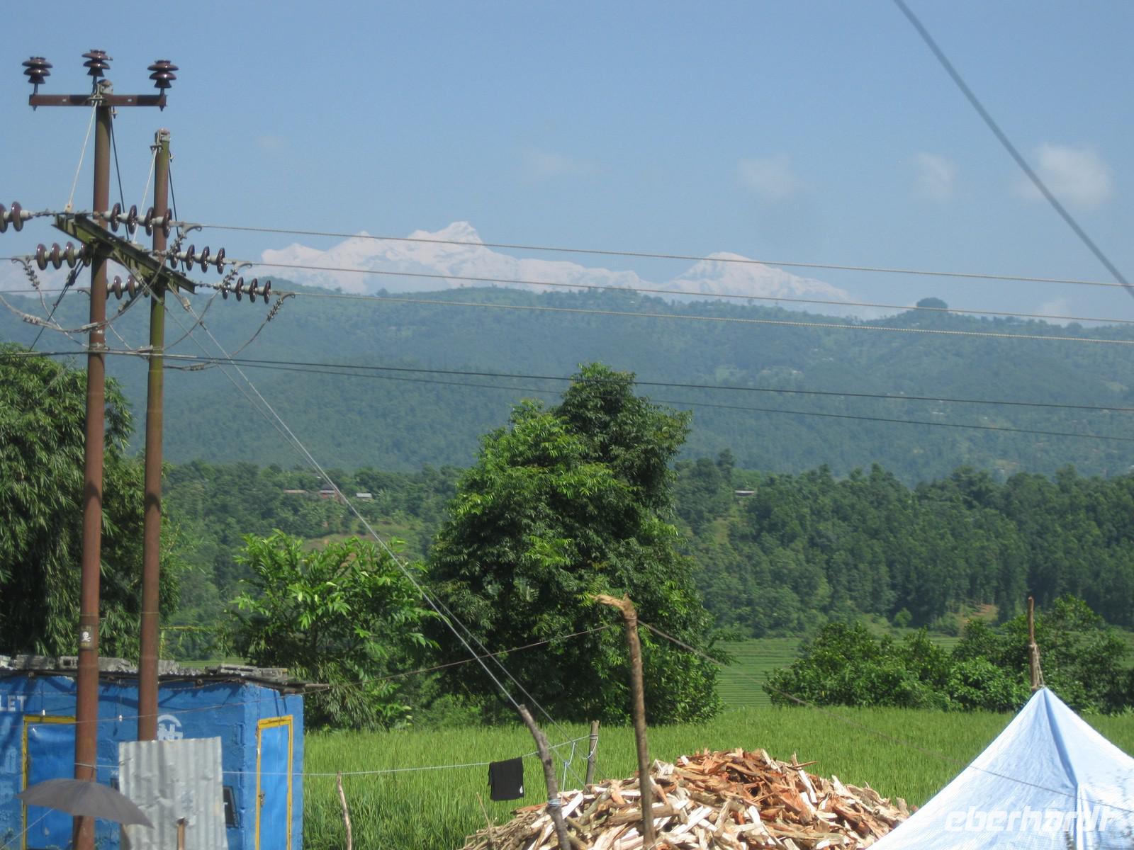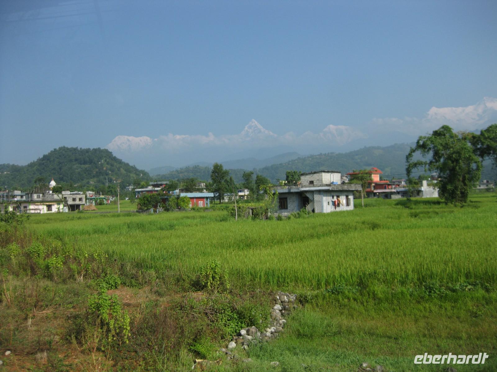Wir fahren vom Chitwan Mationalpark bis zur Stadt Mugling die gleiche Strecke auf dem Ost-West-„Highway" im Tal am Fluss Trishuli zurück, die wir gekommen sind. In Mugling verlassen wir dann den „Highway" und fahren auf dem anderen weiter in Richtung Pokhara. Auf der Fahrt dorthin können wir schon mal die schneebedeckten Berge des Annapurna-Massivs sehen. Sie zeigen sich uns in der Ferne. Wir machen einige Fotostopps unterwegs.