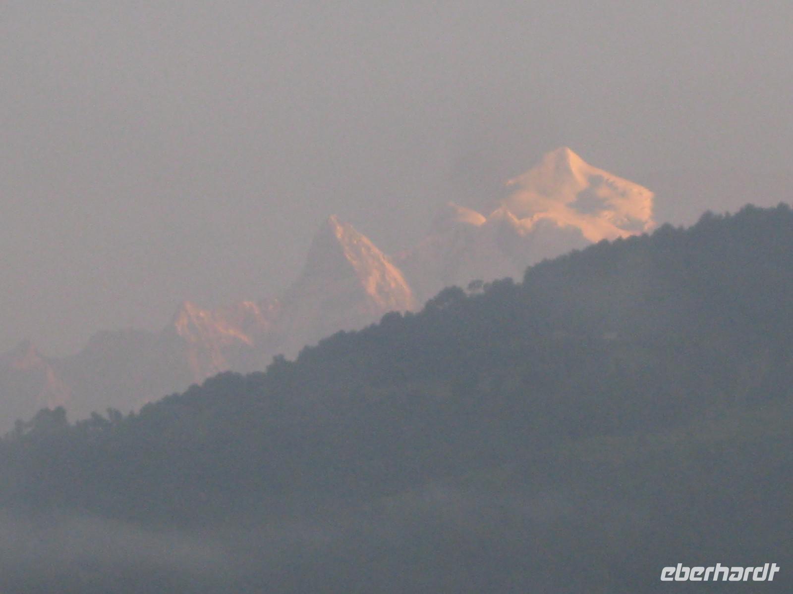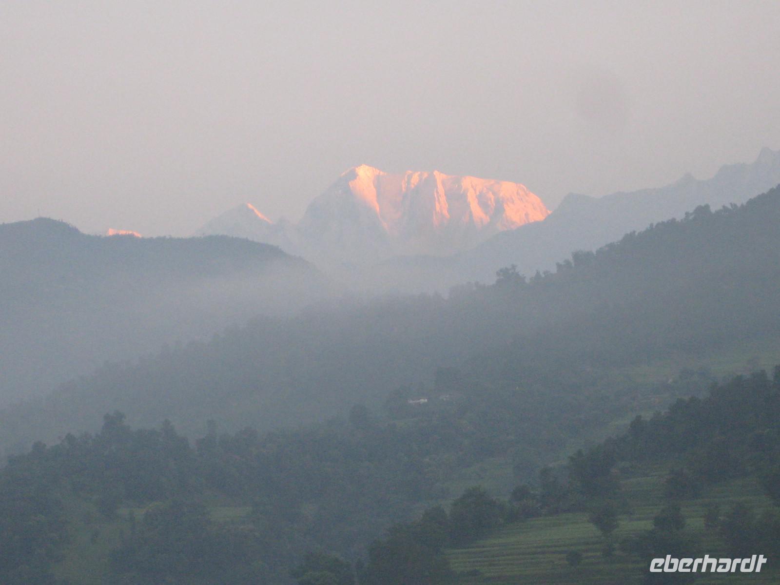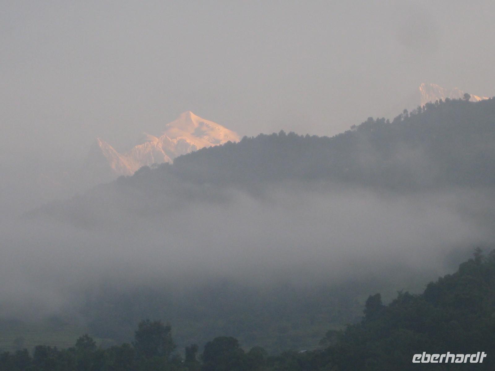 Wir fahren vom Chitwan Mationalpark bis zur Stadt Mugling die gleiche Strecke auf dem Ost-West-„Highway" im Tal am Fluss Trishuli zurück, die wir gekommen sind. In Mugling verlassen wir dann den „Highway" und fahren auf dem anderen weiter in Richtung Pokhara. Auf der Fahrt dorthin können wir schon mal die schneebedeckten Berge des Annapurna-Massivs sehen. Sie zeigen sich uns in der Ferne. Wir machen einige Fotostopps unterwegs.