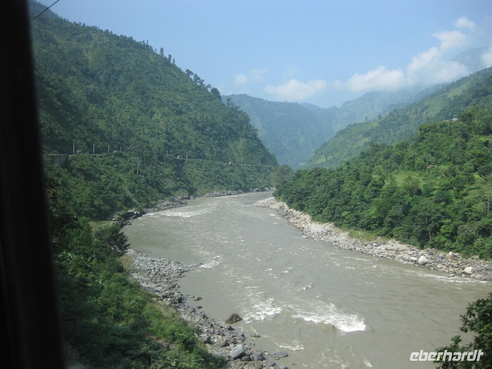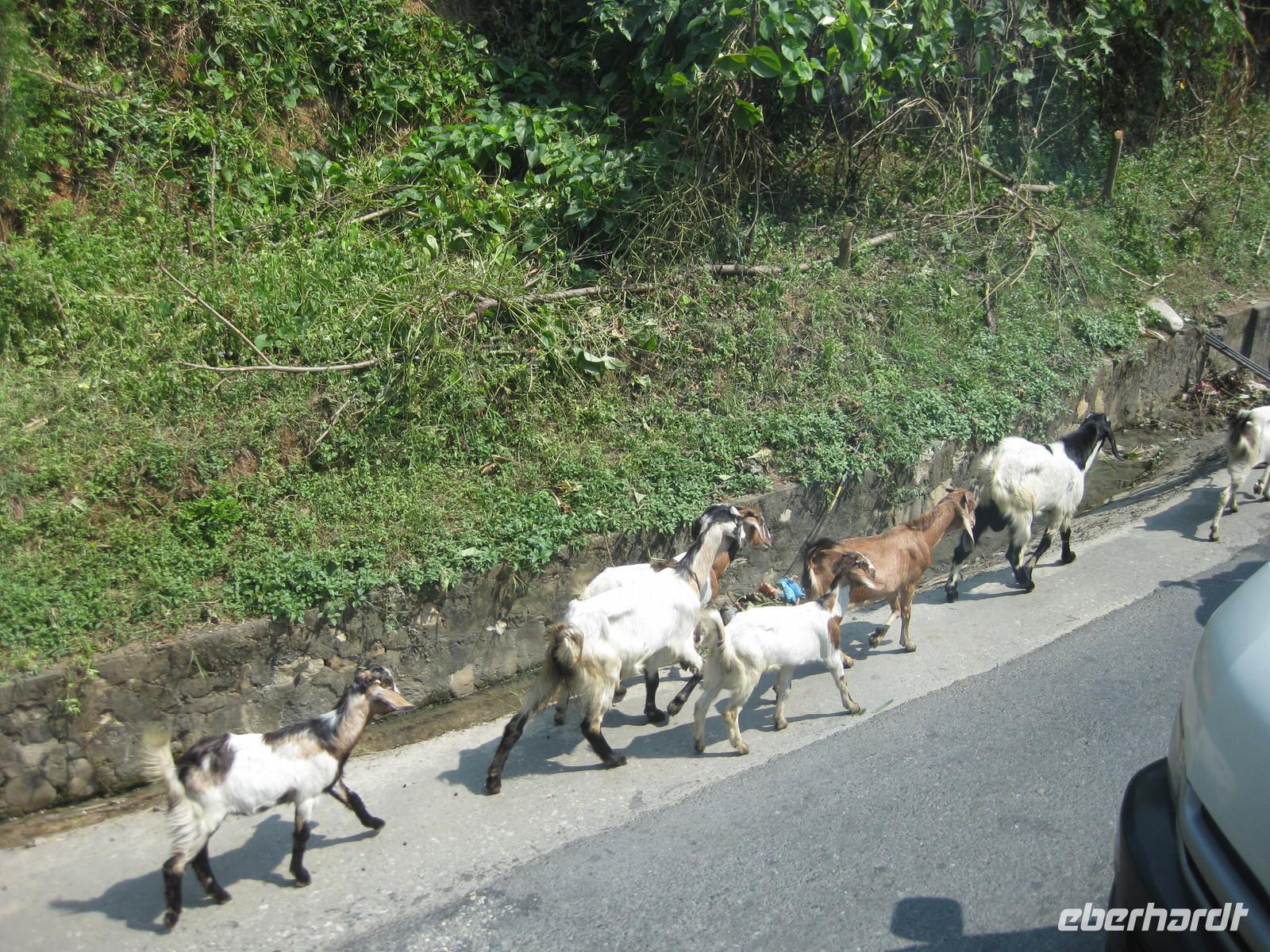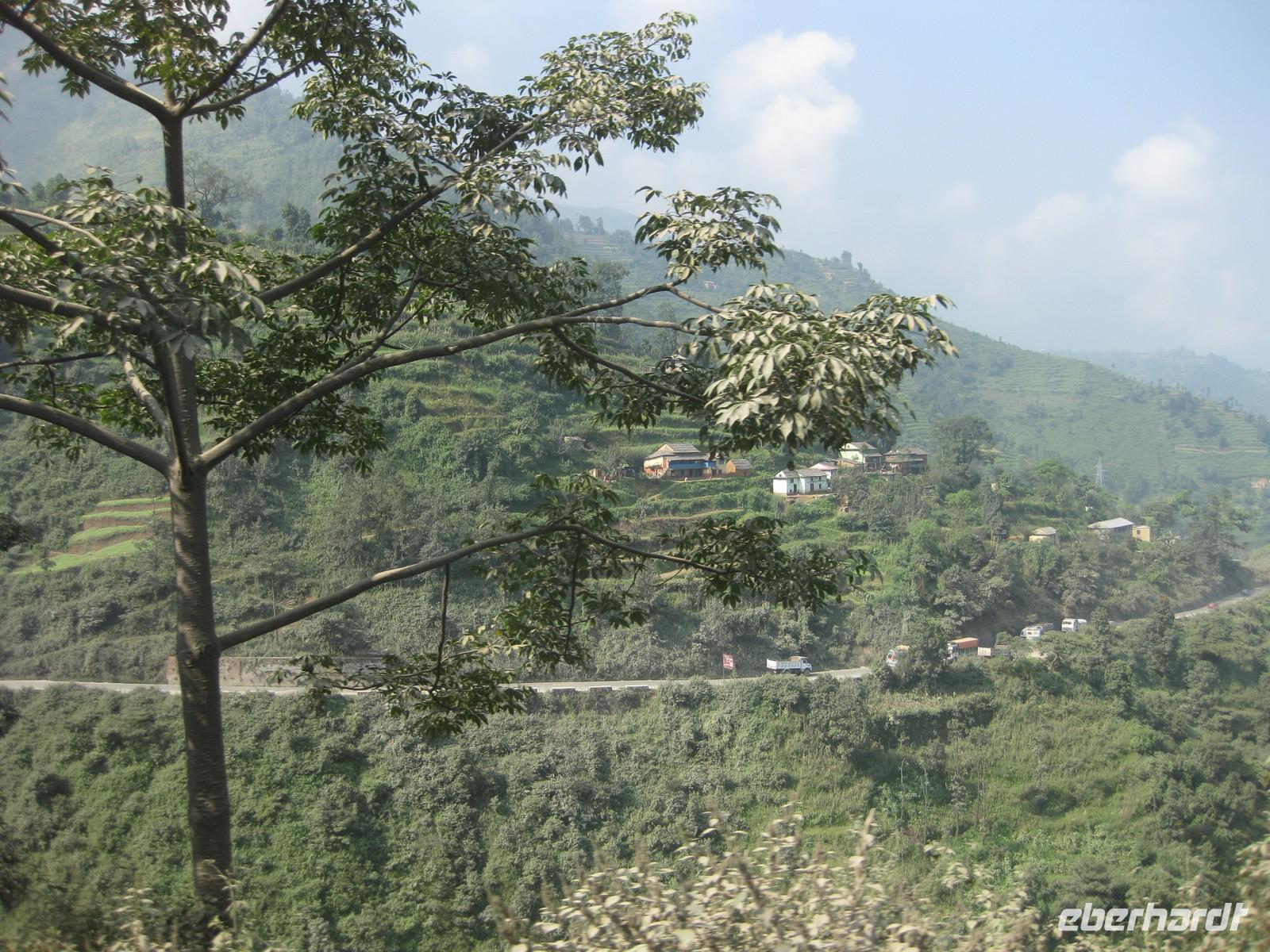 Wir fahren durch die Stadt Kathmandu und dann auf dem Prithvi Highway durch das Kathmandu-Valley bis hinauf nach Thankot. Dort überqueren wir den Pass und fahren dann auf dem Hihgway, der als Serpentinestraße weiter geht, wieder hinunter in das nächste Tal und dann weiter in Richtung Pokhara. Der Highway ist schmal und stark befahren in beide Richtungen, weil er die einzige Straße in Richtung Indien ist Die Fahrt im Tal ist dann wieder weniger abenteuerlich. In Mugling verlassen wir den Highway nach Pokhara, weil wir in Richtung Bharatpur, Tandi, Chitwan Nationalpark müssen.